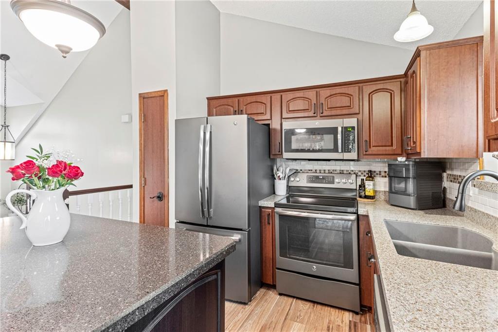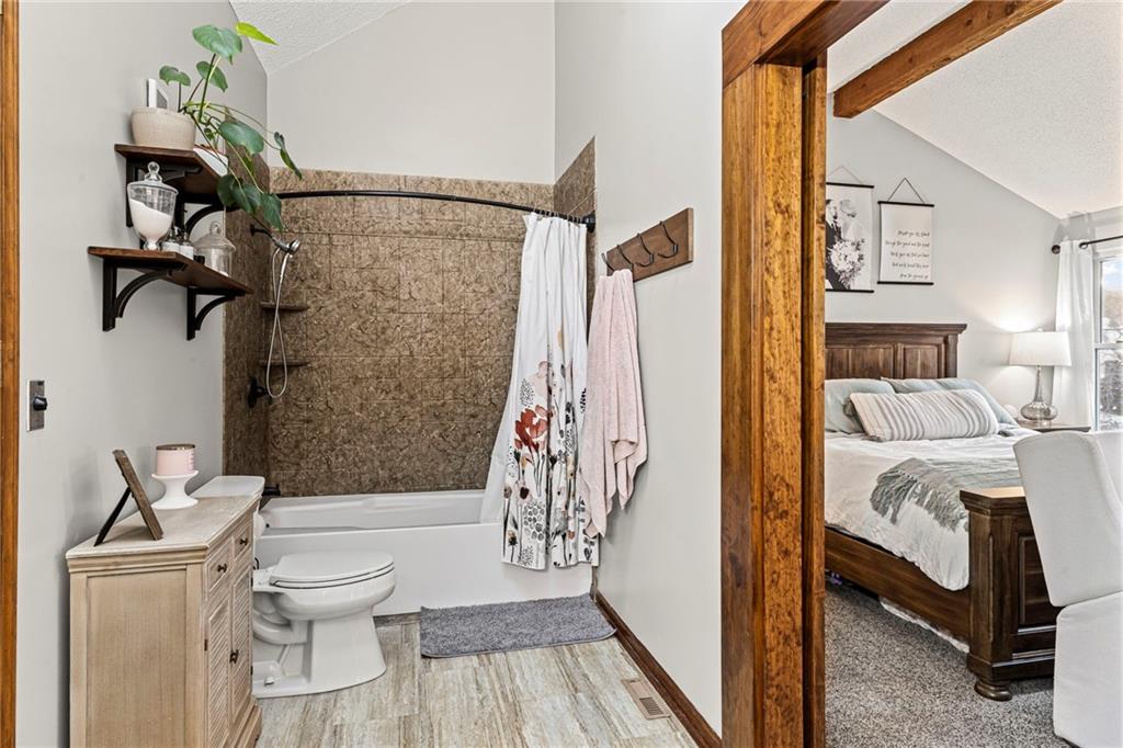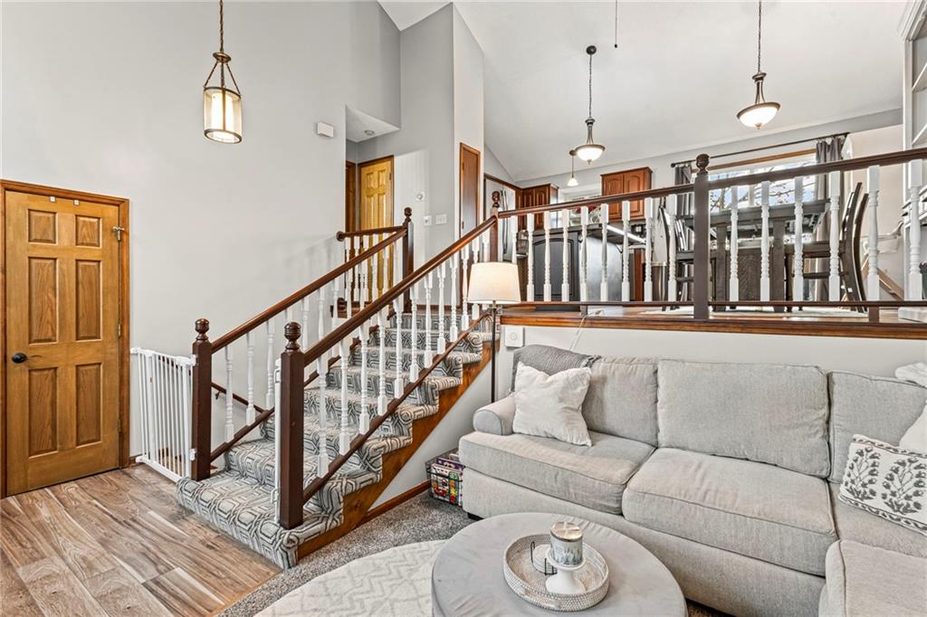 Step into this bright and inviting home where tall vaulted ceilings create an airy, open feel from the moment you enter. The main level offers a warm great room, while the lower-level recreation room features a charming brick fireplace with ceramic logs—perfect for relaxing evenings. The updated kitchen shines with refaced cabinets and soft-close drawers, newer stainless steel appliances, and granite-overlay countertops, and it opens seamlessly to a newer expansive double deck. Built with composite materials and accessible from the kitchen, primary bedroom, and recreation room, this impressive deck includes a covered lower level already wired for a hot tub. The primary suite is a true luxury retreat—also expansive in size and thoughtfully designed with a sitting area, a HUGE walk-in closet, and a spa-like bathroom complete with a large soaking tub. Newer solid-core interior doors, vinyl windows, and oversized bedroom closets add comfort and quality throughout this home. Outside, the fenced yard backs to a peaceful horse farm, offering a tranquil backdrop with mature trees and a handy storage shed. Major updates provide peace of mind, including a 1-year-old composition roof and gutters/downspouts, a newer AC, and recent improvements to the front step, exterior paint, front railing, and garage door. A rare bonus is the large storage space beneath the main level and walk-in closets in every bedroom. Situated on a quiet street within the sought-after Park Hill School District, this home blends comfort, charm, and thoughtful updates in every corner.