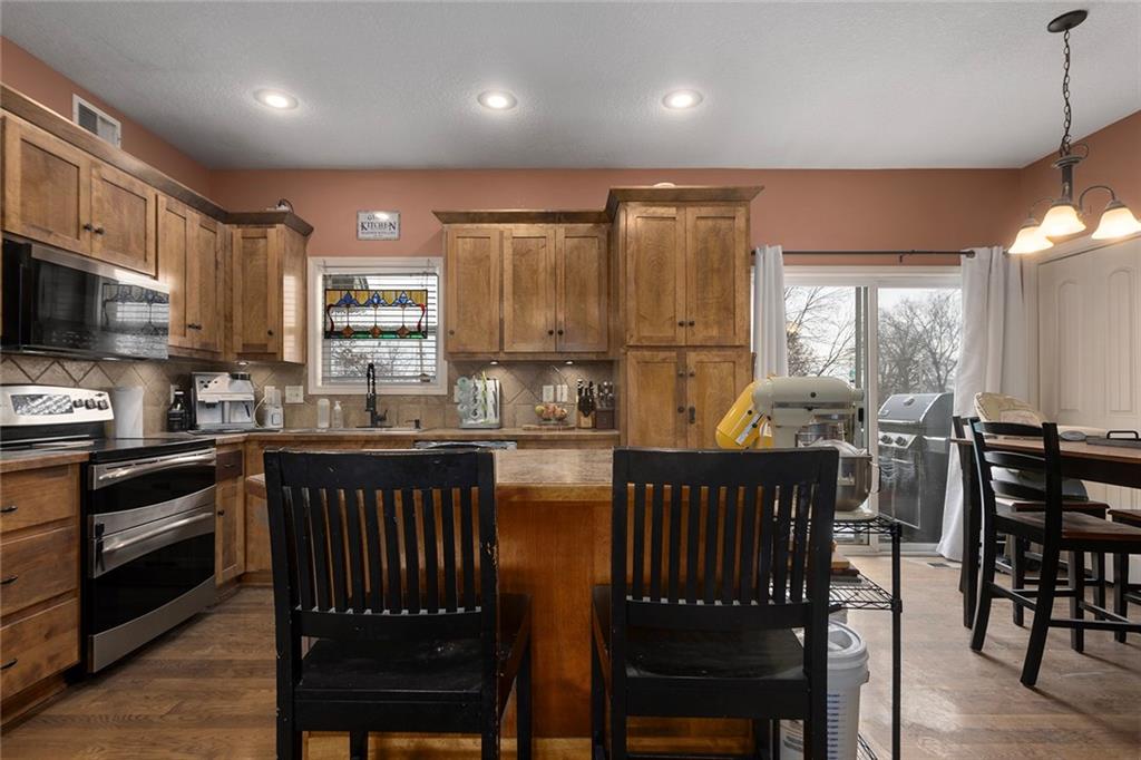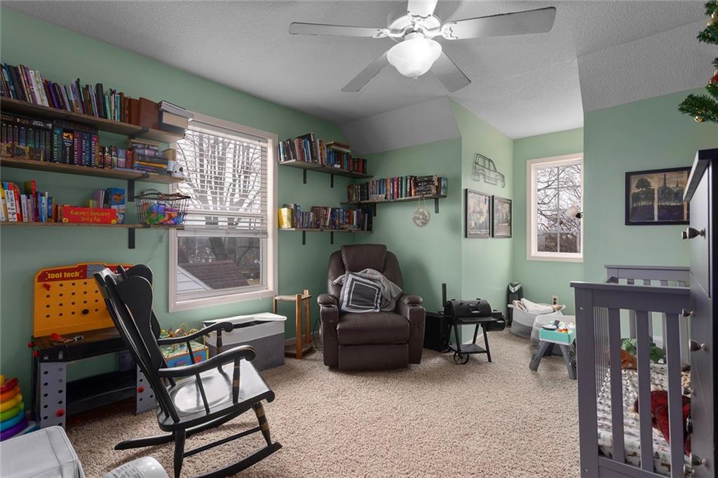 Absolutely CHARMING! This home stands out! Beautiful color and structure outside! INSIDE: A lovely, welcoming living room! Here you will find a working gas fireplace, ceiling fan, unique wall cabinet, and a door to the garage. In the kitchen, there are medium-toned Shaker-style cabinets and a tile backsplash. Stainless steel appliances, nice hardwood floors, an island, room for a table, and a laundry area with a double door opening. A half-bathroom with built-in cabinets is conveniently located on the main floor. Looking out the sliding doors, you see a nice-sized yard with a large deck and a shed that stays. The main floor also boasts the Primary Bedroom with lots of natural light, a ceiling fan, a modern feel, and an ensuite bath with shower/tub combo. As you ascend to the second floor, note the stylish wooden handrail. These stairs lead to two very distinctive bedrooms, each with a ceiling fan, one large window, and one window in a nook. So INVITING and cozy! Upstairs bedrooms share a full bath with a shower over the tub. The basement is partially finished and offers so many creative ways to use the space! There is a vinyl floor, a storage area, an almost finished full bathroom, a BONUS room, and a STUDIO room with noise-cancelling drywall. Nice, 2-inch blinds throughout this home show very nicely, and the lighting throughout is just outstanding! This is such a stylish home! Come and see it TODAY!
