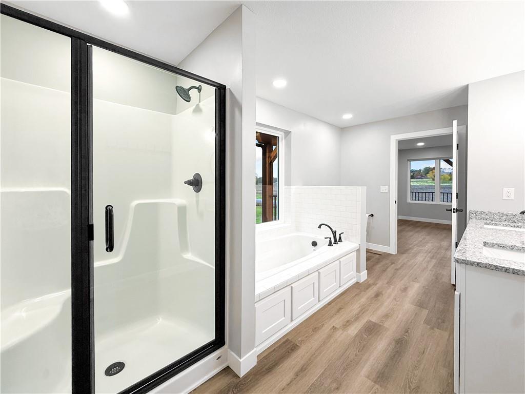 This stunning new-construction barndominium offers modern living with incredible function and style. Step inside to an open-concept layout filled with natural light, luxury vinyl plank flooring, recessed lighting, and serene country views. The gorgeous kitchen features crisp white cabinetry, granite counters and stainless steel appliances. A private primary suite includes a spa-inspired bathroom with dual vanities, a soaking tub, walk-in shower, and a large custom walk-in closet with built-in shelving. Additional bedrooms are bright and comfortable, with updated finishes throughout the home. Enjoy outdoor scenery from the covered upper deck and lower patios overlooking the tree line. The impressive spray-foam insulated garage/shop space is a dream—complete with concrete floors, loft storage, and oversized doors measuring 18'x8' and 12'x14', ideal for RVs, boats, farm equipment, or recreational vehicles. Designed for both comfort and convenience, this unique property blends high-quality craftsmanship with the peacefulness of rural living—move-in ready and built to impress!