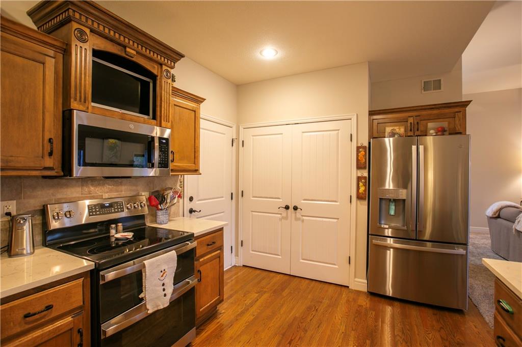 Beautifully maintained reverse 1.5-story in sought-after Leabrooke Town Manor, where maintenance-provided living makes life effortless. Immaculately cared for and truly in mint condition with a main-floor primary suite and two-car garage. Spacious kitchen with breakfast bar and walk-in pantry The finished lower level feels bright and open, featuring a large family room, two additional bedrooms, a full bath, and a spacious bonus room ideal for an office, media room or workout space. Concrete patio for entertaining and grilling, new concrete front stoop, and beautifully maintained landscaping. Recent improvements include newer systems and updates: HVAC (approximately 1 year old), hot water heater (approximately 4 years old), newer stainless steel appliances. The community is designed for carefree living, with exterior maintenance fully taken care of and a long list of amenities to enjoy. Residents have access to a pool, well-appointed clubhouse with 24-hour fitness facilities, scenic walking paths, a stocked pond for catch-and-release fishing, and tennis and basketball courts. All of this comes in a prime South Leawood setting—just minutes from Town Center Plaza, Prairiefire, outstanding restaurants and shopping, Ironwoods Park, several public and private golf courses, premier fitness options, and Chicken N Pickle. HOA $480 monthly