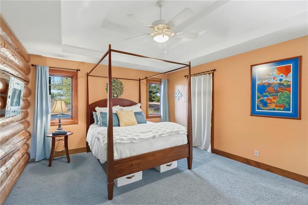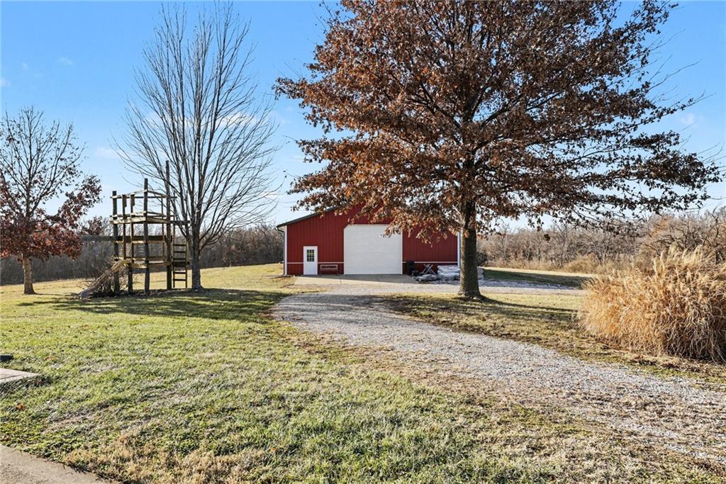 Tucked away on 23 breathtaking acres, this 3,162 sq. ft. Craftsman ranch–style custom log home offers a rare blend of thoughtful design, and unmatched natural surroundings. Built in 2003 and lovingly maintained by its original owners, the home showcases full-round log construction in the central living areas, featuring exposed log trusses, open doorways, and a striking Palladian-style arched picture window that fills the space with natural light. Covered front and back porches invite you to relax and take in the peaceful setting, while cedar-sided, stick-built wings balance beauty with functionality. The main level is designed for effortless living, offering a spacious kitchen, living and dining areas, a walk-in pantry, and custom cabinetry and built-ins throughout. The primary suite includes a full bathroom and a walk-in closet. Two additional bedrooms, a second full bath, multiple linen closets, and a convenient laundry/mudroom are also on this main level. The finished walkout basement expands the living space with a fourth bedroom, third full bathroom, open living/game room, bar, safe room, and abundant storage—including a large utility room and under-stair storage. Comfort and efficiency in the home are enhanced by central air, a heat pump with propane backup, a wood stove fireplace, a radon mitigation system, and high-speed fiber internet. Outdoors, the property is equally impressive with an attached extra deep two-car garage, concrete driveway and patio, 42’ x 64’ shop/barn with a 12-foot door, circular gravel drive, garden shed, raised garden beds, and a landscaped backyard bonfire ring. Crafted from dead-standing pine and fir timber sourced from Wyoming, this one-of-a-kind home is perfectly positioned on a paved, lightly traveled road just one mile from Smithville Lake’s Mecca Access and boat ramp—offering true country living without gravel roads. The acreage borders U.S. Corps of Engineers land along Smithville Lake, ensuring privacy and protected views.