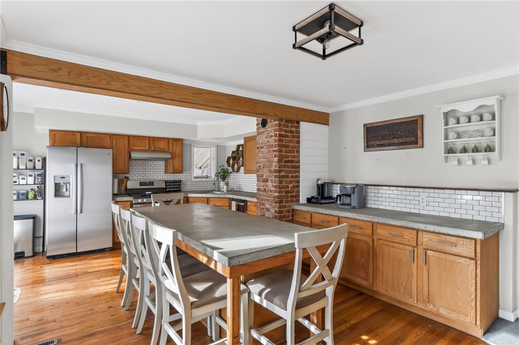 This is the kind of home that immediately feels welcoming, the kind that invites you to slow down and imagine everyday life unfolding comfortably within its walls. Built in 1922, this beautifully maintained residence blends timeless craftsmanship with thoughtful updates that make modern living easy. The front porch sets the tone, offering a perfect place for morning coffee or evening conversation. Inside, natural light fills the main living spaces, highlighting original details and warm finishes that give the home its character. The living room centers around a fireplace that anchors the space, creating a cozy gathering spot for family and friends. The kitchen is spacious and functional, offering generous counter space, classic cabinetry, and room to truly cook and connect. Adjacent dining and gathering areas flow naturally, making everyday living and entertaining feel effortless. With three bedrooms, including a main-floor primary, the layout offers flexibility for families, guests, or home office needs. The partial finished basement adds valuable bonus space, ideal for a family room, game room, or quiet retreat, along with an additional office or non-conforming bedroom option. Outdoor living is just as inviting, with a covered porch and side deck creating multiple spaces to relax or entertain. A detached two-car garage adds convenience while preserving the home’s charm. Located just minutes from Benedictine College and downtown Atchison, this home offers character, comfort, and walkable access to local dining, shopping, and campus life. It’s a home best appreciated in person, where its warmth and livability truly come to life.
