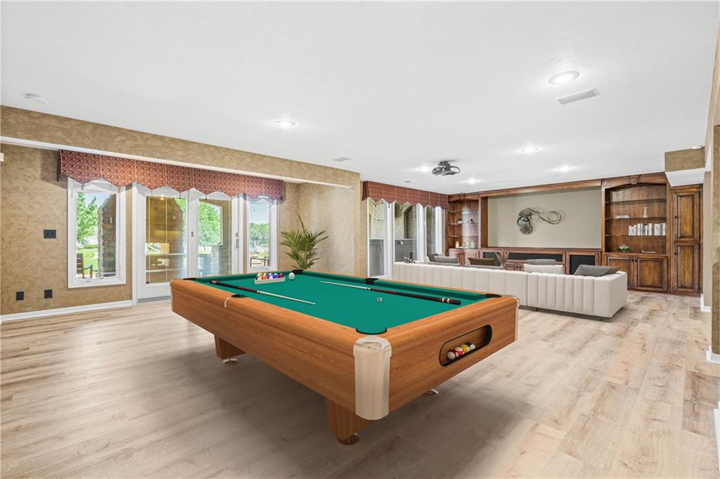 Location unlike any other in Lionsgate! This beautiful 2-story home backs to the neighborhood pool, tennis & basketball courts, playground, and overlooks the picturesque neighborhood lake—offering stunning views from the kitchen, breakfast nook, hearth room, and primary bedroom.Blue Valley's award-winning Lakewood Elementary and Middle Schools are just a safe, 10-minute walk away through quiet neighborhood streets.The kitchen is a chef’s dream with leathered granite and quartzite countertops, a custom-designed island, tile backsplash, slide-out shelving, and top-tier appliances—including a Wolf 4-burner gas cooktop with 24" griddle, Best downdraft hood, Café French-door refrigerator, and Monogram dishwasher.The cozy hearth room features a real stone fireplace with an Amish-made barn beam mantel from the 1880s. The spacious primary suite offers a gas fireplace, luxurious bath with jetted tub, double vanity, and an enormous double-sided walk-in closet.The finished basement is perfect for entertaining with a home theater featuring a drop-down screen, projection system, surround sound, and gaming hookups—ideal for family movie nights or watching big games. Plus, a hidden man-cave or she-shed with built-ins, drawers, and a workbench is tucked inside the oversized storage room.Most windows are energy-efficient, triple-pane premium Thermal King windows. An Andersen sliding glass door was recently added in the basement. The home is virtually soundproof and weatherproof. Step outside to your private backyard retreat featuring a full outdoor kitchen with natural gas grill and Brentwood countertops, a double-sided stone fireplace with water features, flagstone patio, Hot Springs Spa, and a stunning tankless waterfall for tranquil ambiance. Lush landscaping and mature trees surround the property. High-efficiency HVAC and water heaters, plus an extended home warranty through AB May, offer peace of mind. A true resort-style haven you’ll be proud to call home!