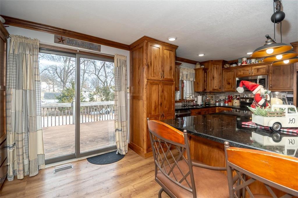 Welcome home to this gorgeous, well-maintained ranch-style property situated on a picturesque 1.02-acre corner lot with mature trees and room to breathe. This inviting home offers three bedrooms on the main level, including a primary suite with an attached full bath, plus an additional full bathroom for guests. The heart of the home features an open-concept kitchen and dining area with beautiful custom knotty pine cabinetry, thoughtful built-ins for extra storage, and an eat-in layout perfect for everyday living. Cozy up in the living room by the gas fireplace, or step out onto the large deck just off the kitchen, ideal for entertaining and enjoying peaceful outdoor views. Convenience is key with main-level laundry, while the finished basement adds even more space with a non-conforming bedroom, family/rec room, and a two-car garage. Outdoors, you’ll love the new concrete steps, sidewalks, patio, and gutters, along with a charming privacy-fenced patio designed for relaxing and hosting. A small shed provides extra storage, and there’s plenty of room for additional parking. Located in a quaint community with easy highway access, this home blends comfort, space, and functionality—ready for its next owner to enjoy.