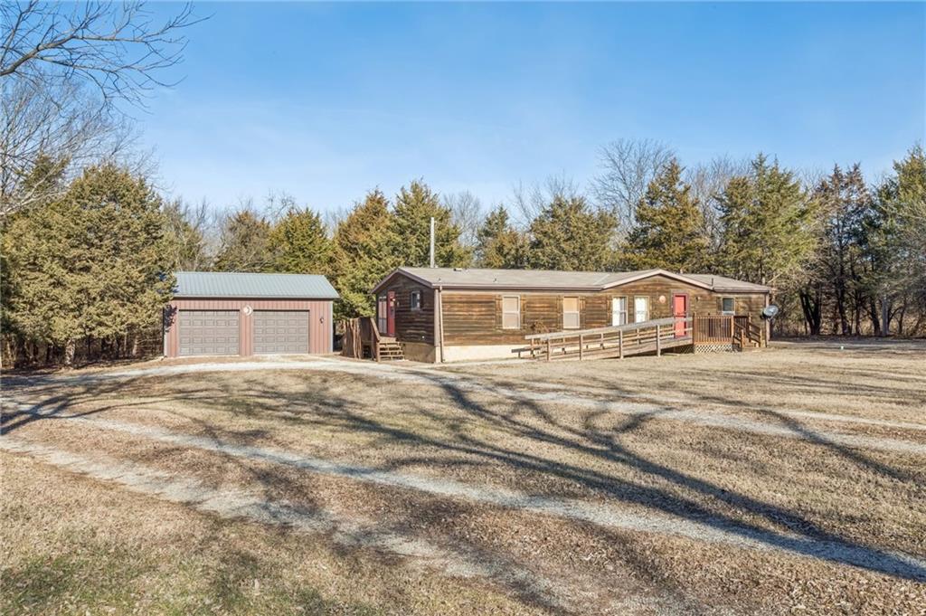 Enjoy the country life in this secluded oasis just south of Paola, KS. Nestled on 4.5 tree-lined acres, this property offers exceptional privacy and tranquility. The home features a primary bedroom with en suite bath, two additional bedrooms, and a second full bathroom. A large office or non-conforming spare room with French doors opens to the living room, dining area, and kitchen with breakfast area, creating a flexible and inviting layout. A spacious two-car detached garage provides ample room for storage, hobbies, or a workshop, with space for both vehicles and equipment. Peaceful rural living with room to breathe.