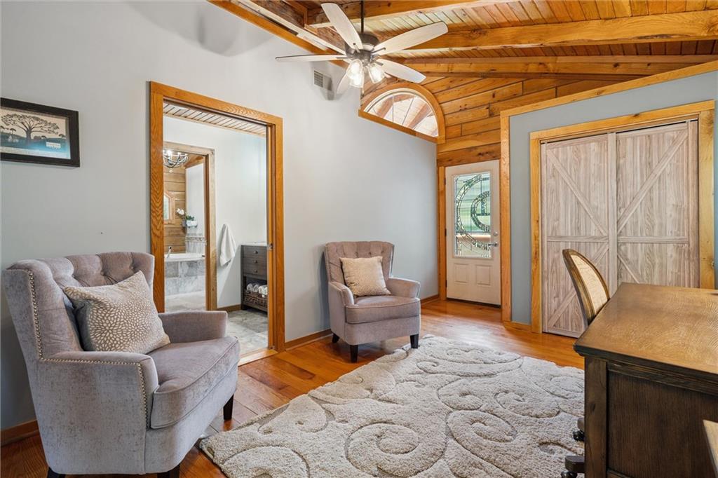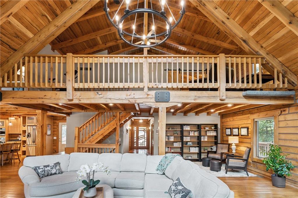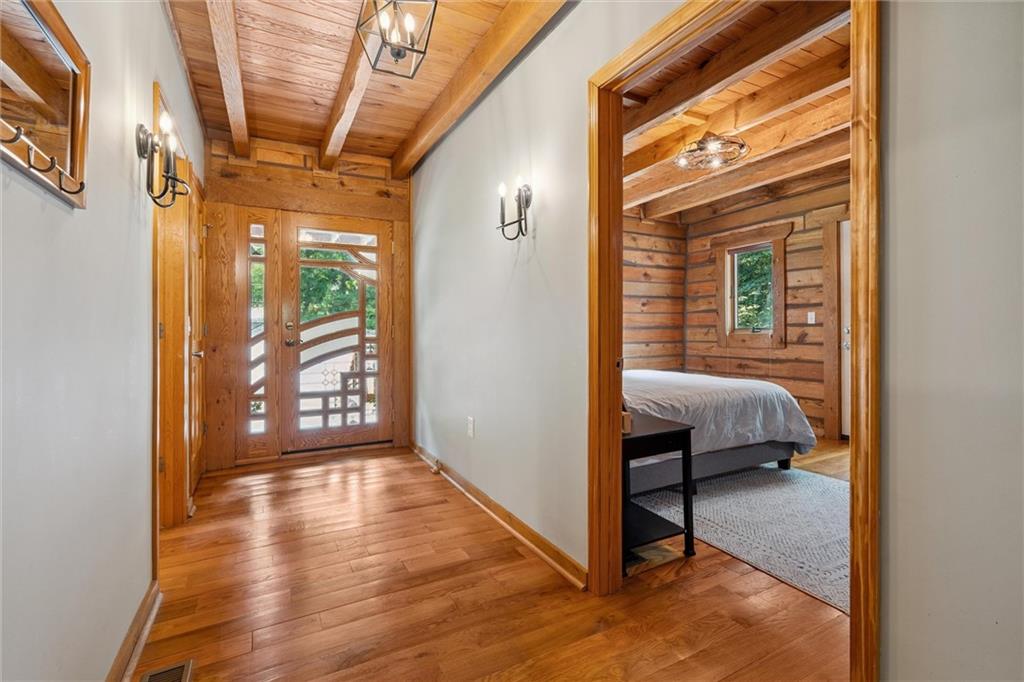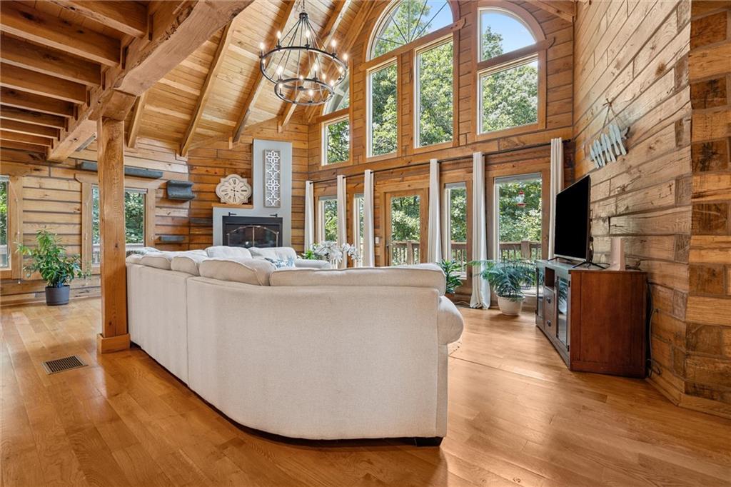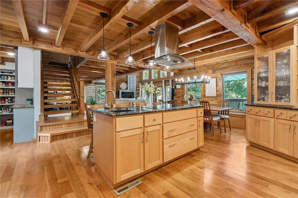 Stunning Log Home on 5 Wooded Acres! So much privacy and situated on all paved roads just 20 Minutes from Lee’s Summit! This custom log home offers over 3,500 sq ft of finished living space across three levels. It is nestled on 5 acres in an established rural neighborhood with paved roads as well. Upgrades: Whole House Generac and gas fireplace powered by propane and immediate backup power! Upgraded custom lighting inside and out and sellers finished the walkout basement which includes a second laundry and new hot water heater. Step inside to soaring vaulted ceilings, expansive windows that flood the home with natural light and rich hardwood floors throughout. Main level features a dramatic two-story Great Room with cozy gas fireplace, spacious dining area, and a chef’s dream kitchen complete with custom cabinets and a finished walk-in pantry. A main-level bedroom includes a built-in dresser/vanity with full bath across the hall. Upstairs, the open loft is a great hangout/office and overlooks the great room with lots of natural light. The upper loft also leads to the luxurious primary suite, offering custom built-ins, a private deck, a walk-in closet with laundry hookups, and a spa-inspired ensuite bath. An additional upstairs bedroom with a separate deck completes the upper level. The finished walk-out lower level adds over 600 sq ft of versatile living space, including a family room with direct patio access, a coffee/wet bar, a fourth bedroom, an office, full bath, second laundry area, ample storage, and 1 car garage. Enjoy the outdoors and privacy from multiple decks and porches surrounding the home! The second driveway offers space for additional parking or an out-building. Whether you're entertaining, relaxing, or working from home, this property offers the ideal blend of rustic charm, modern convenience, and peaceful seclusion.