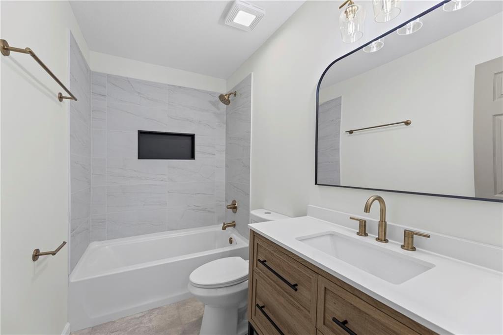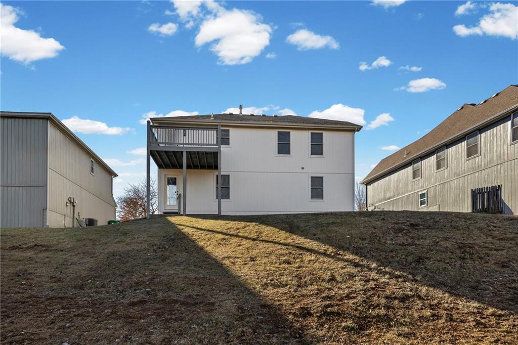 Beautifully remodeled California Split level home backing to neighborhood trail and pond! ALL NEW: Roof, Kitchen, Baths and MORE! Fresh interior and exterior paint pair perfectly with new floors. Inviting, light and bright Great Room features cozy fireplace for these chilly months. Please the chef in this kitchen with new cabinets, quartz countertops, center eat-in island, pantry and new stainless steel appliances! Adjacent dining area accesses the deck to easily move outdoors! Also on this level find two bedrooms, second full bath and convenient laundry! Head up to the Primary Retreat showcasing tray vault ceiling, walk-in closet and a private en-suite including double vanity, spa bath and separate shower! Finished, walk-out lower level has a family room, fourth bedroom and third full bath. Unfinished basement for additional storage needs. All of this in a fantastic location just minutes to all the activities at the Legends and easy highway access to enjoy everything the Metro has to offer. WELCOME HOME!
