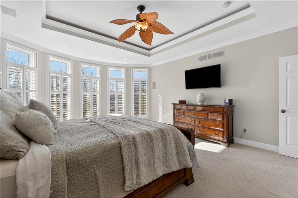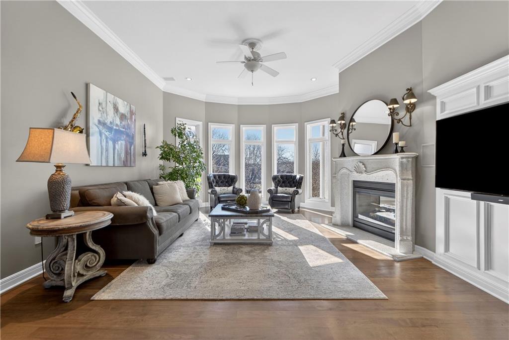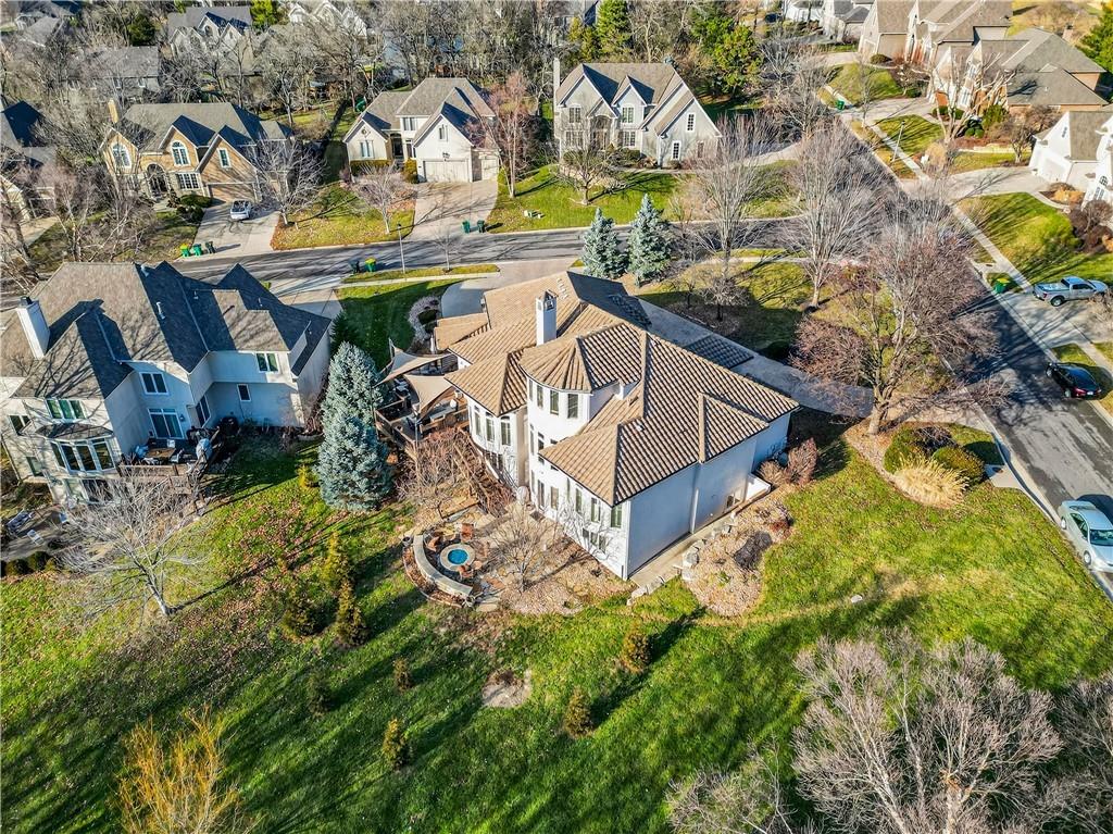 Nestled on a .56-acre treed corner lot in the prestigious Falcon Ridge community, this extensively updated home offers 4,598 sq ft of refined, functional living space. Notable features include a freshly painted exterior, circle drive, arched covered entry with custom door, 4-car garage with radiant heated floors, and a 50-year tile roof. The main level showcases new walnut hardwood floors, fresh interior paint, soaring ceilings, and abundant natural light. Formal living and dining rooms are anchored by a see-through gas fireplace and walls of windows overlooking the private backyard, while the hearth room flows seamlessly into the kitchen. The remodeled kitchen features new custom cabinetry, quartz countertops, a large island, walk in pantry, and high-end Monogram appliances, including a gas range, wall oven/microwave, dishwasher, and Dacor refrigerator. Just off the kitchen, access the brand-new Trex deck, perfectly positioned to enjoy the wooded views and outdoor entertaining. The main-level primary suite offers vaulted ceilings, plantation shutters, a see-through fireplace, and a spa-inspired bath with new cabinetry, quartz countertops, freestanding tub, walk-in shower, and expansive custom closet. Upstairs includes a private office with built-ins and half bath, along with unfinished attic space for storage or future expansion. The walk-out lower level is designed for entertaining with a new rec room featuring built-in projector and surround sound, wet bar with wine and beverage refrigerators, three additional bedrooms, a Jack & Jill bath, a private ensuite, and a non-conforming fourth bedroom ideal for a gym or office. Outdoor living continues to the patio with a gas-plumbed firepit and newly planted trees for added privacy. Additional highlights include zoned heating and cooling, new AC, 75-gallon water heater, and extensive recent updates throughout, making this Falcon Ridge home truly move-in ready.