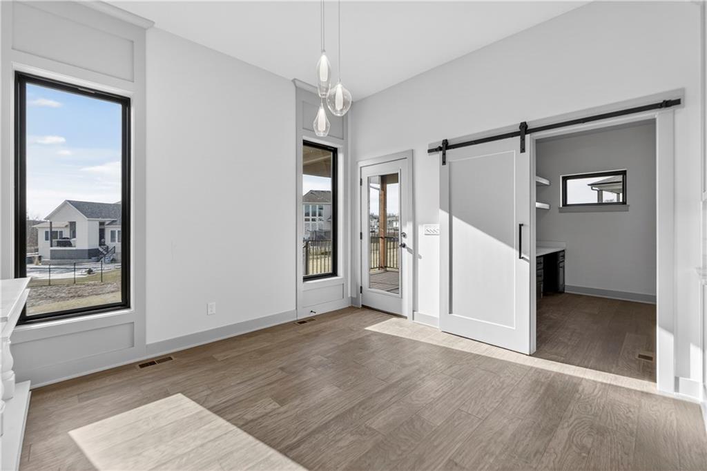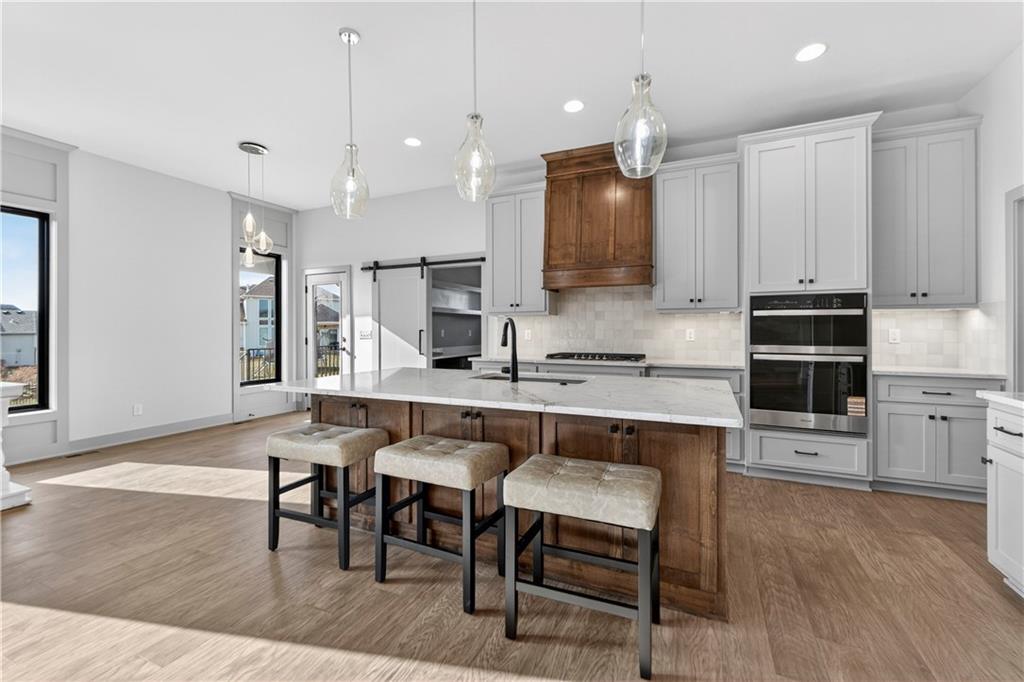 Situated on a premium, private lot backing to serene green space, trails, and a meandering creek, this Reverse 1.5-Story offers the perfect balance of modern luxury and everyday comfort. The thoughtfully designed 4-bedroom, 3-bath layout accommodates both peaceful mornings and effortless entertaining. The main level is anchored by a kitchen featuring sleek quartz countertops, custom cabinetry, a gas cooktop with striking statement hood, and a double-oven configuration with convection microwave. A pocket office is conveniently positioned nearby, while a well-planned mud zone and large pantry seamlessly connects the three-car garage for easy organization and daily functionality. Sunlight fills the great room as it flows into the primary suite, with the laundry thoughtfully located just steps away. A secondary main-level bedroom is privately tucked away—not immediately off the front entry—offering flexibility for guests or a more private home office. The walkout lower level is bright and inviting, designed for gatherings with a spacious recreation room, wet bar, and two generously sized bedrooms. Outdoors, enjoy the tranquility of a peaceful dead-end street with minimal neighbors, an expansive backyard, and an in-ground sprinkler system. Ideally located just minutes from shopping, dining, and entertainment along Adam’s Dairy Parkway, with quick access to I-70 for effortless commuting. Exceptional design, privacy, and convenience come together here—schedule your private tour and experience it for yourself.