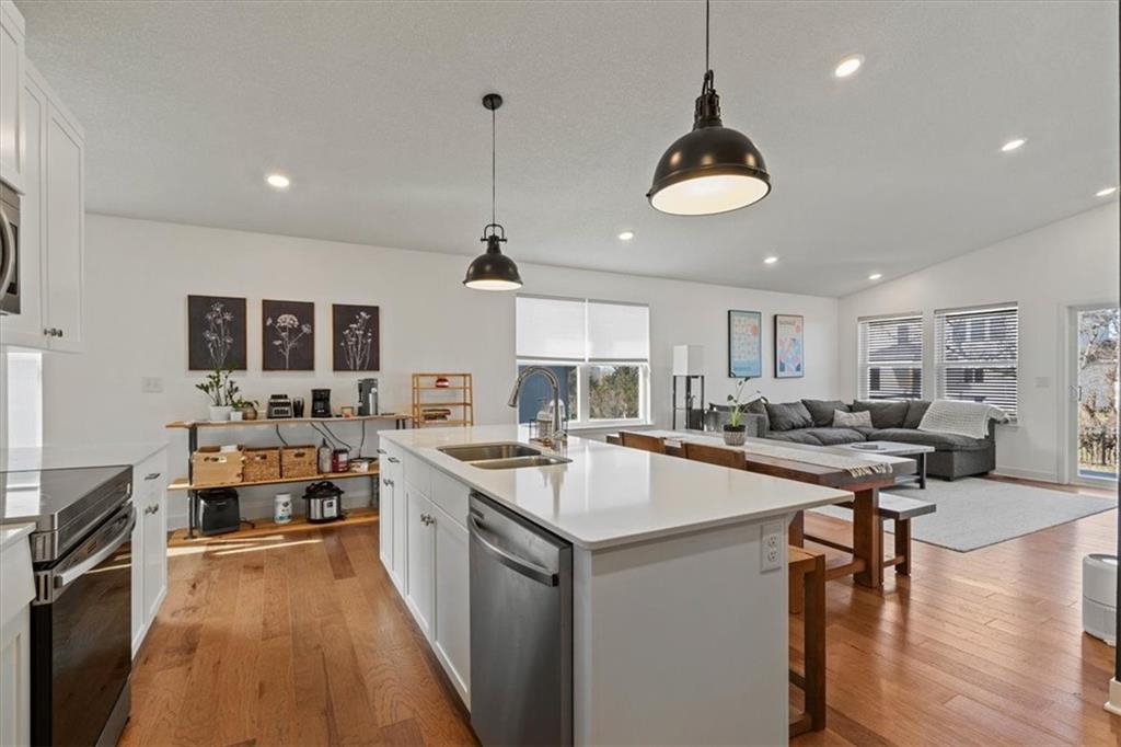 This striking modern home blends clean architectural lines, open-concept living, and elevated finishes to create a refined yet welcoming space designed for both everyday living and effortless entertaining. From the moment you arrive, the home makes a statement with its contemporary curb appeal and inviting presence. Inside, an open-concept layout is filled with natural light, enhanced by expansive windows and soaring ceilings that create a seamless flow between living, dining, and entertaining spaces. The heart of the home is the sleek, bright white kitchen, featuring stainless appliances, and a large island with seating. The master suite serves as a private retreat, complete with a walk-in closet, and fresh paint, pine shiplap and custom mirrors in master bathroom space. Finished basement provides plenty of extra living space with a rec room, gym area, kitchenette, 3rd bedroom and half bath. Situated in a desirable Overland Park location, this home offers the perfect blend of modern luxury and suburban tranquility, with easy access to the neighborhood pool, walking trails, shopping, dining, parks, and top local amenities. Every detail has been carefully curated to support a refined yet approachable lifestyle, making this property a standout opportunity for buyers seeking contemporary design, quality craftsmanship, and a place that truly feels like home.
