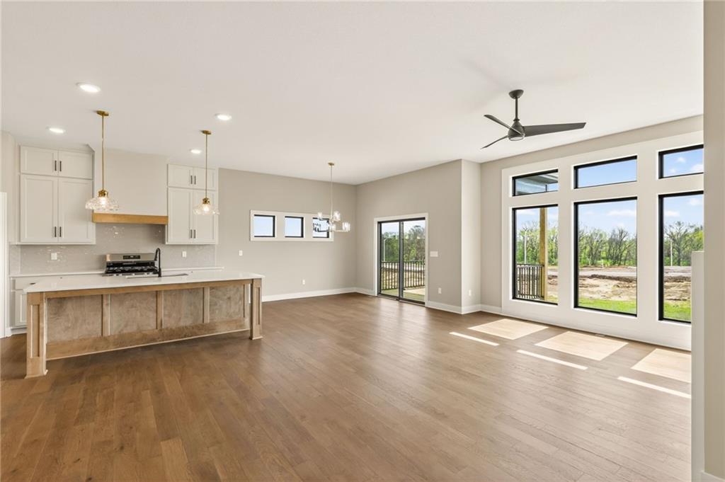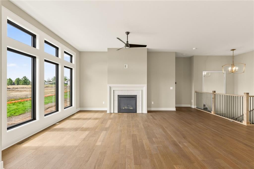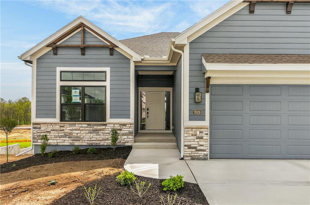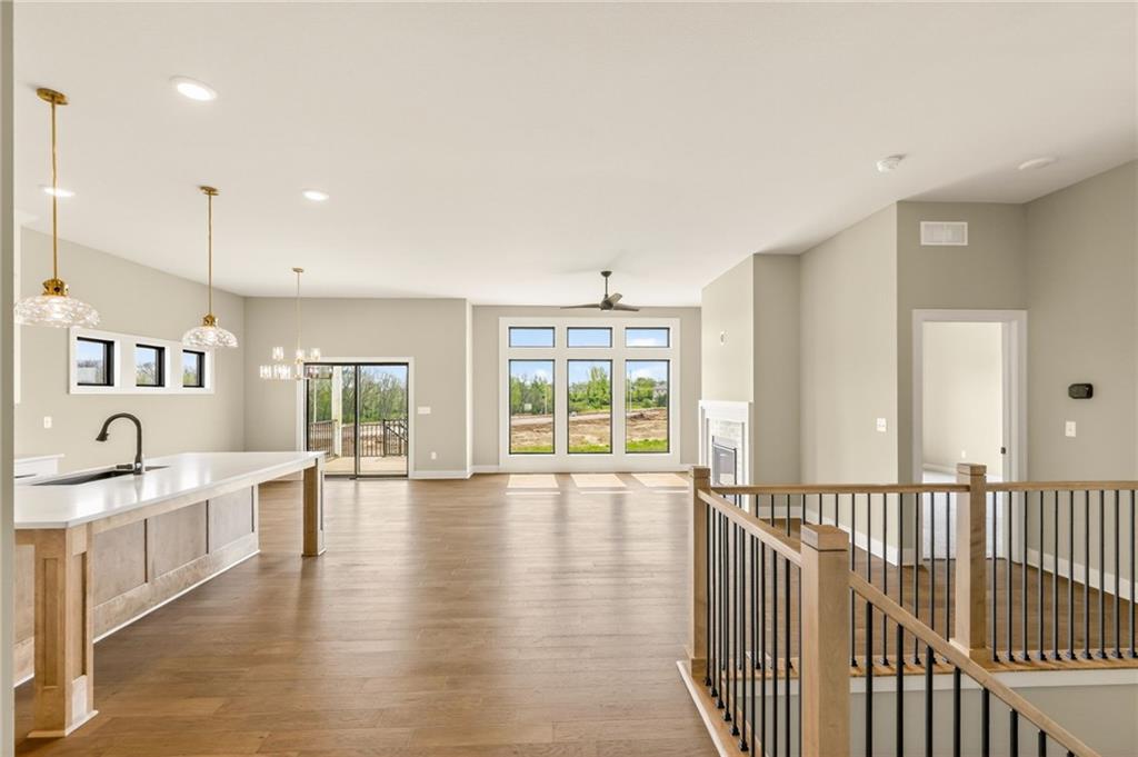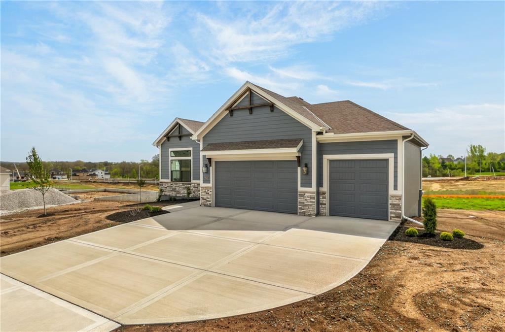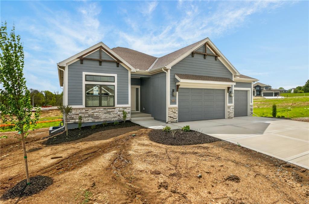 The McKinley by Hearthside Homes is a stunning Reverse 1.5 Story offering 4 bedrooms, 3 baths, and over 2,800 sq ft of well-appointed living space that blends comfort, craftsmanship, and modern style. The open-concept main level features hardwood floors, abundant natural light, and a great room anchored by sleek linear fireplace. The kitchen impresses with quartz countertops, a contrasting island and hood, and a black Silgranit sink—balancing beauty and function. Dining area opens to covered deck overlooking the backyard. Home ready-MID-APRIL. The primary suite delivers a true retreat with a freestanding tub, tiled shower, dual vanities, and a spacious walk-in closet that connects directly to the laundry room. A secondary bedroom, full bath, and laundry complete the main level. The finished walkout lower level adds a large rec room with wet bar, two bedrooms with walk-in closets, a full bath, and generous storage space. An oversized patio enhances outdoor living and is perfect for entertaining or quiet relaxation. Mid April completion date. This home is built with double-wall construction, I-joist floor systems, and engineered roof trusses for strength and durability. Every Hearthside home also includes a video-recorded sewer scope, third-party duct cleaning, and a third-party inspection process to help ensure quality and peace of mind. Hearthside Homes has been building in the Kansas City area since 1987 and is known for quality construction and a streamlined building experience. ***Hearthside includes an exceptional warranty package: 1 year of whole-house coverage, 2 years of mechanical systems protection, and a 10-year major structural warranty. Plus, a third-party inspection with sewer line review and HVAC duct cleaning.*** Outstanding community amenities include; swimming pool, pickle ball court, 3 acre fishable pond, outdoor pavilion area w/2 fireplaces, rentable clubhouse with kitchen & party space & internet!