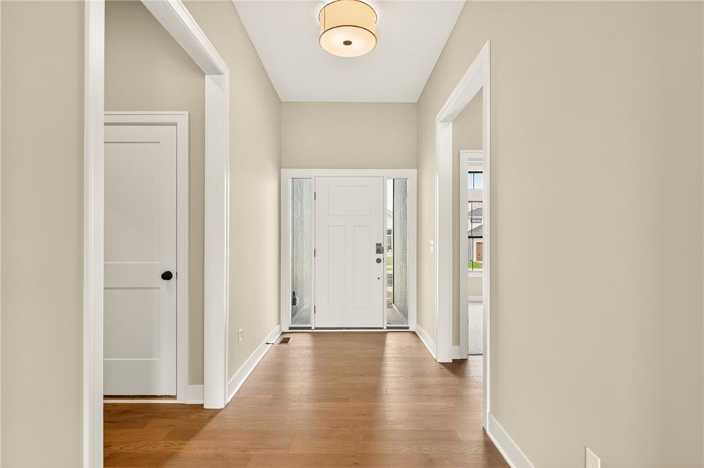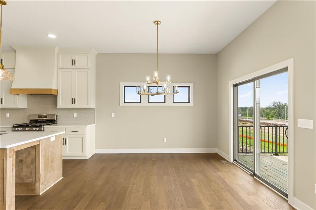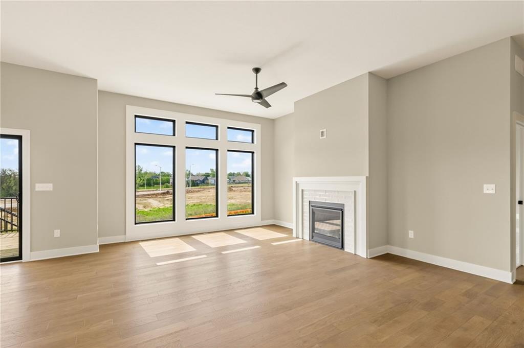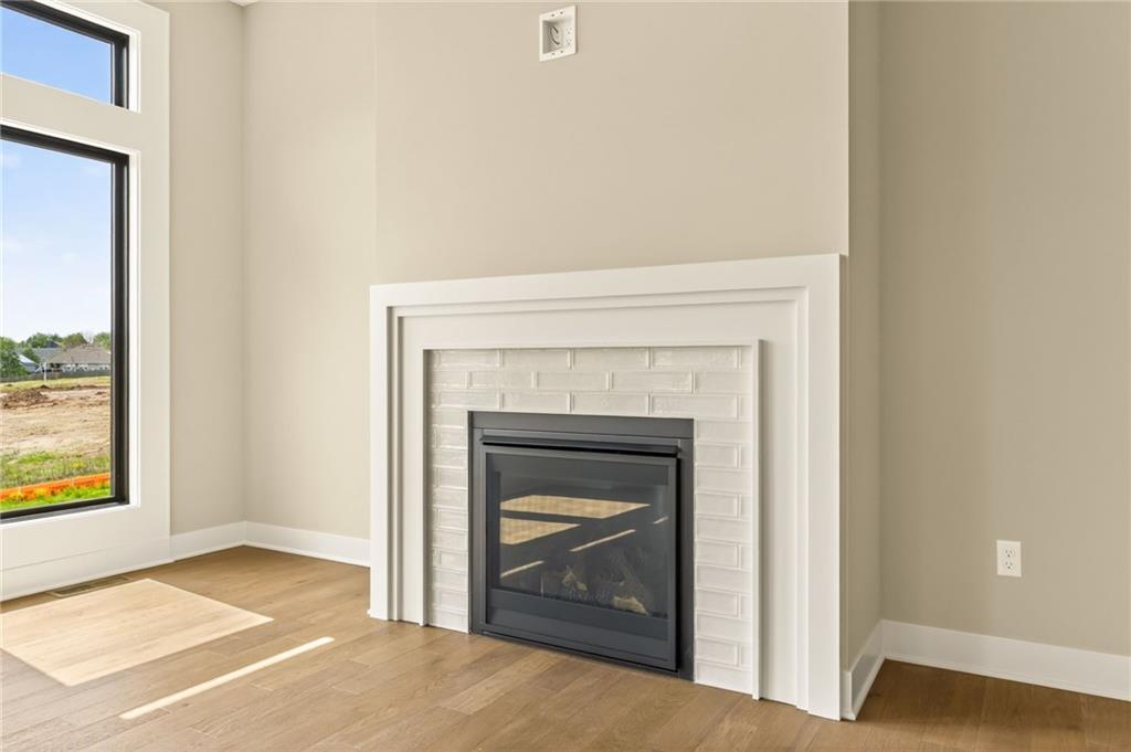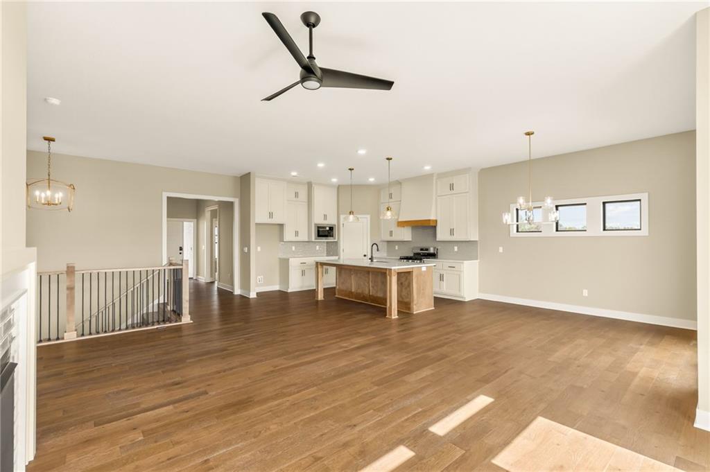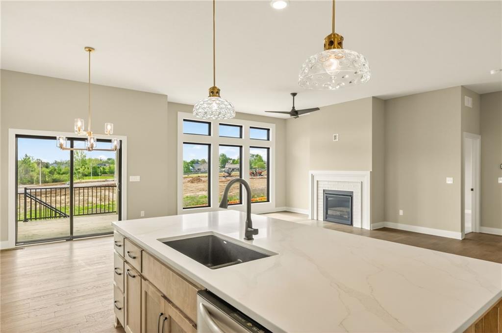 The McKinley by Hearthside Homes is a stunning Reverse 1.5 Story offering 4 bedrooms, 3 baths, and over 2,800 sq ft of well-appointed living space that blends comfort, craftsmanship, and modern style. The open-concept main level features hardwood floors, abundant natural light, and a great room anchored by sleek linear fireplace. The kitchen impresses with quartz countertops, a contrasting island and hood, and a black Silgranit sink—balancing beauty and function. Dining area opens to covered deck overlooking the backyard. Home ready-MID-APRIL. The primary suite delivers a true retreat with a freestanding tub, tiled shower, dual vanities, and a spacious walk-in closet that connects directly to the laundry room. A secondary bedroom, full bath, and laundry complete the main level. The finished walkout lower level adds a large rec room with wet bar, two bedrooms with walk-in closets, a full bath, and generous storage space. An oversized patio enhances outdoor living and is perfect for entertaining or quiet relaxation. Mid April completion date. This home is built with double-wall construction, I-joist floor systems, and engineered roof trusses for strength and durability. Every Hearthside home also includes a video-recorded sewer scope, third-party duct cleaning, and a third-party inspection process to help ensure quality and peace of mind. Hearthside Homes has been building in the Kansas City area since 1987 and is known for quality construction and a streamlined building experience. ***Hearthside includes an exceptional warranty package: 1 year of whole-house coverage, 2 years of mechanical systems protection, and a 10-year major structural warranty. Plus, a third-party inspection with sewer line review and HVAC duct cleaning.*** Outstanding community amenities include; swimming pool, pickle ball court, 3 acre fishable pond, outdoor pavilion area w/2 fireplaces, rentable clubhouse with kitchen & party space & internet!