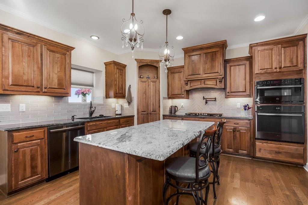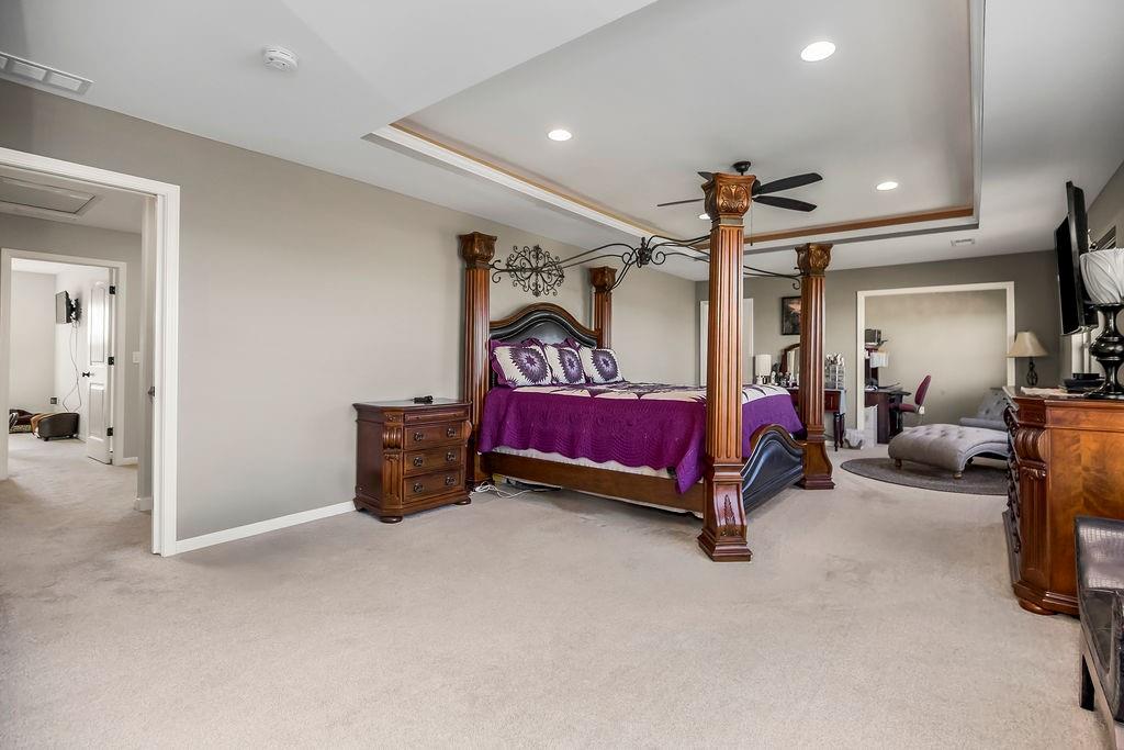 ** 3% assumable loan available! You will fall in love with this exquisite 4 bed/ 3.5 Bath --on walkout lot. Gourmet kitchen with the most amazing pantry ever! HUGE 8’x11’ walk in pantry. French door fridge features keurig single cup coffee brewing system. “Pot filler” faucet conveniently located behind cooktop. Built in Sonic ice machine and Bosch coffee and beverage center. Custom window treatments, tile and hardwood floors throughout. (Carpet in bedrooms). Spacious and luxurious owner's suite (34'x14') with 2 walk in closets, sitting area/office and tiled shower with dual shower heads. Master bath and laundry room have HEATED TILE FLOORS. Hang out with family and friends on the comfy deck with fireplace overlooking the tranquil backyard adjacent to community green space area. Finished lower level with family room and wet bar equipped with full size fridge and drawer type dishwasher. 4 car HEATED garage (2 are tandem) Professionally applied epoxy garage floor. Located in Foxberry Estates, one of the area’s most sought-after communities, residents enjoy resort-style amenities—including a pool, clubhouse, scenic walking trails, and playgrounds. **Assumable 3% mortgage available!**