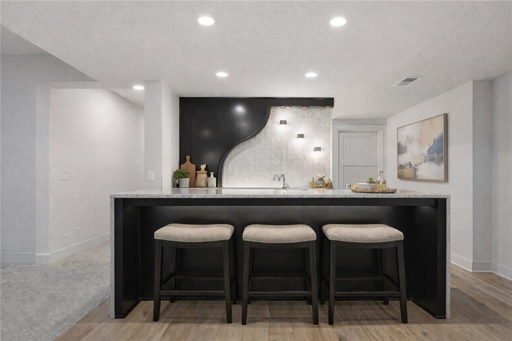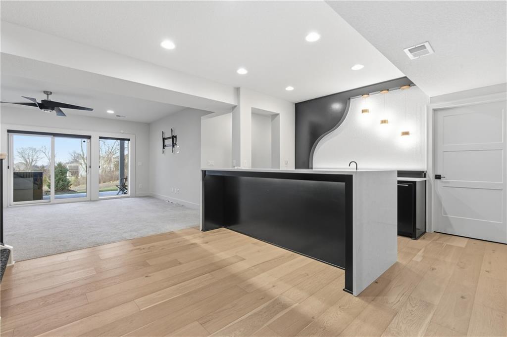 Built in late 2022 by the esteemed Don Julian Builders, this beautifully designed Reverse 1.5 story home is tucked within the premier Bristol Highlands Villas—where maintenance-provided living meets the peace and privacy of rolling hills and protected green space. Just minutes from Shawnee Mission Park, scenic trails and lakes, Lenexa City Center, dining, shopping, De Soto schools, and highway access—yet perfectly secluded—this home truly offers the best of both worlds. Thoughtfully designed for main-level living, the primary suite is a private retreat featuring separate vanities, luxurious soaking tub, walk-in shower with bench, and a spacious walk-in closet with direct access to the laundry room . A stylish powder room for guests and a dedicated office with double doors add both function and flexibility upstairs. The great room features custom built-ins, gas fireplace, and a seamless flow to the covered + screened deck overlooking tranquil green space with privacy! The kitchen—designed for entertaining and everyday living, showcases an oversized island with storage and seating, custom cabinetry to ceiling, quartz, and walk-in pantry. All SS appliances stay, including a newer KitchenAid dishwasher and high-end KitchenAid refrigerator! The walkout lower level is ideal for guests and gatherings, featuring a chic wet bar with beverage fridge, built-in microwave, and island. A cozy family room with slider access to the covered patio is perfect for movie night. One bedroom enjoys easy access to a full hall bath, while 2 additional bedrooms share a Jack-and-Jill bathroom with tub—perfect for hosting family & visitors. Features include high-efficiency HVAC, Lennox smart thermostat, ADT security, automatic privacy screens for the patio and deck, automatic blinds throughout, hardwood floors, and a coveted location backing to community green space. Low-maintenance living. High-end finishes. Don’t let this one pass you by—homes like this are truly special.