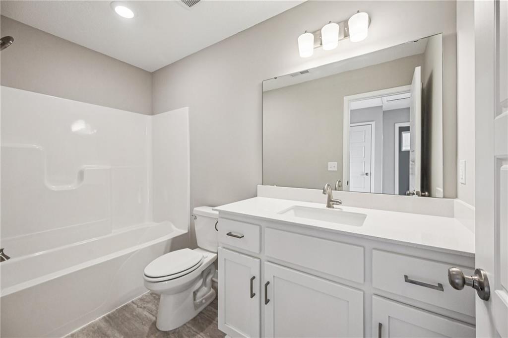 Spacious main level for daily living with all bedrooms and laundry on the upper level. This home overlooks the beautiful neighborhood pond! Includes enhanced design package with upgraded finishes. Large quartz countertop island in the kitchen that overlooks the Dining room/Great Room. Hardwoods throughout the main level. Large Primary Bedroom with an open spa-like bathroom. The Primary Bathroom has an oversized quartz vanity with double sink and a walk-in tiled shower. Beautiful landscaping included. Possible 5th bedroom with basement finish. Amenities include the luxury of a beautiful two-acre pond, pool with playground, covered pavilion with a grill.