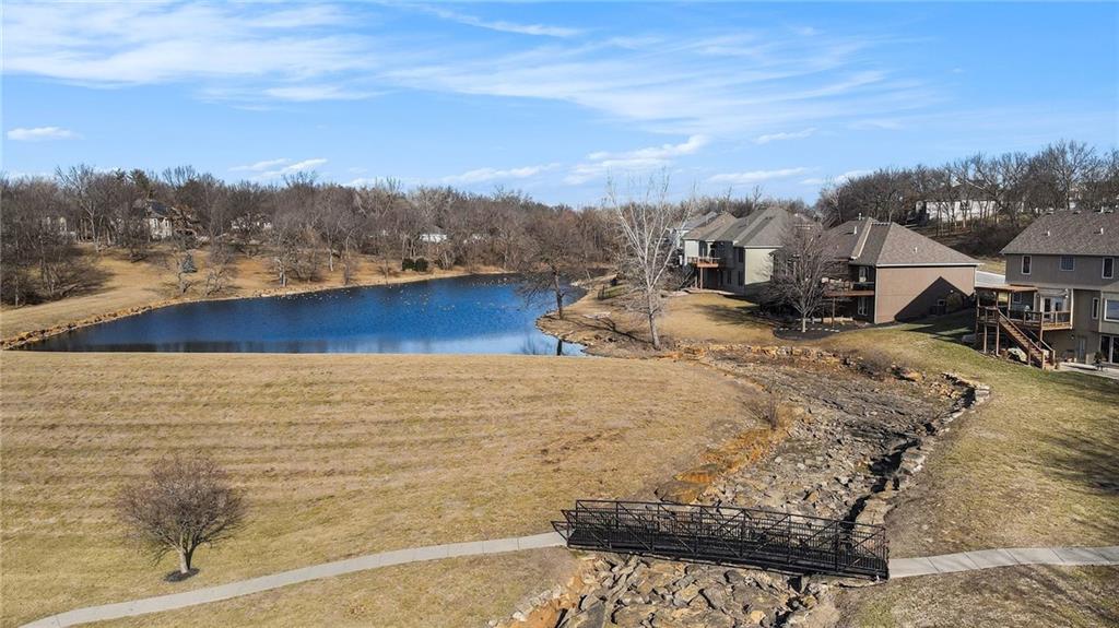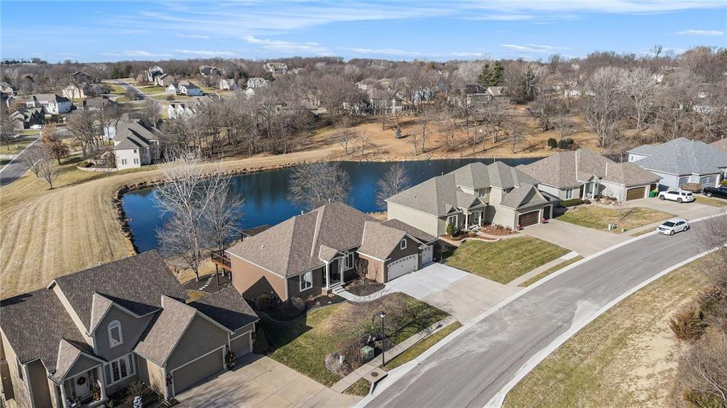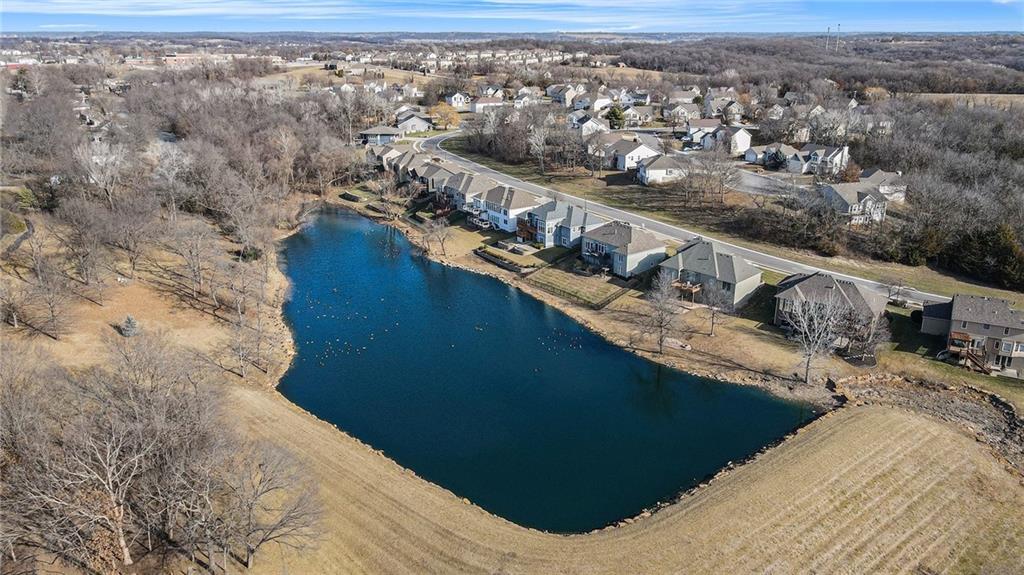 Stunningly remodeled Ranch/Reverse spans over 3,700 sqft. with designer finishes and showcases a bright, open layout highlighted by 11' ceilings and expansive floor-to-ceiling windows with plantation shutters framing a serene neighborhood pond. The main level features the Primary bedroom and a large second bedroom. The Primary suite has a custom closet system with built-in drawers and shelving. The chef's kitchen has a 7' island for dining or entertaining, new cabinets, marble countertops and high-end appliances and a large pantry. Just off the entry you can go through double doors to the home office or formal dining room with custom built-ins. Newly refinished hardwood floors throughout the main level, designer lighting, updated tile fireplaces and fresh interior/exterior paint complete the main living areas. The fully finished lower level includes two additional bedrooms with double closets, a full bath, a spacious family/theater room, two generous storage rooms, and a dedicated room ideal as a home gym, craft space or man cave and includes double exterior doors to the backyard. Outdoors is an entertainer’s dream with a beautifully landscaped yard with concrete decorative edging, sprinkler system, new concrete sidewalk to front entry, large deck with pergola and a covered patio overlooking the stocked pond and views of gorgeous sunsets. The oversized three-car garage features epoxy floors and an extra-deep bay for your truck or SUV. Located in a friendly community within the award-winning Piper school district and just minutes from The Legends Shopping area, close major highways, and only 20 minutes the airport and downtown. This home has been meticulously finished and maintained and has all of the extras you won't find in new construction.
