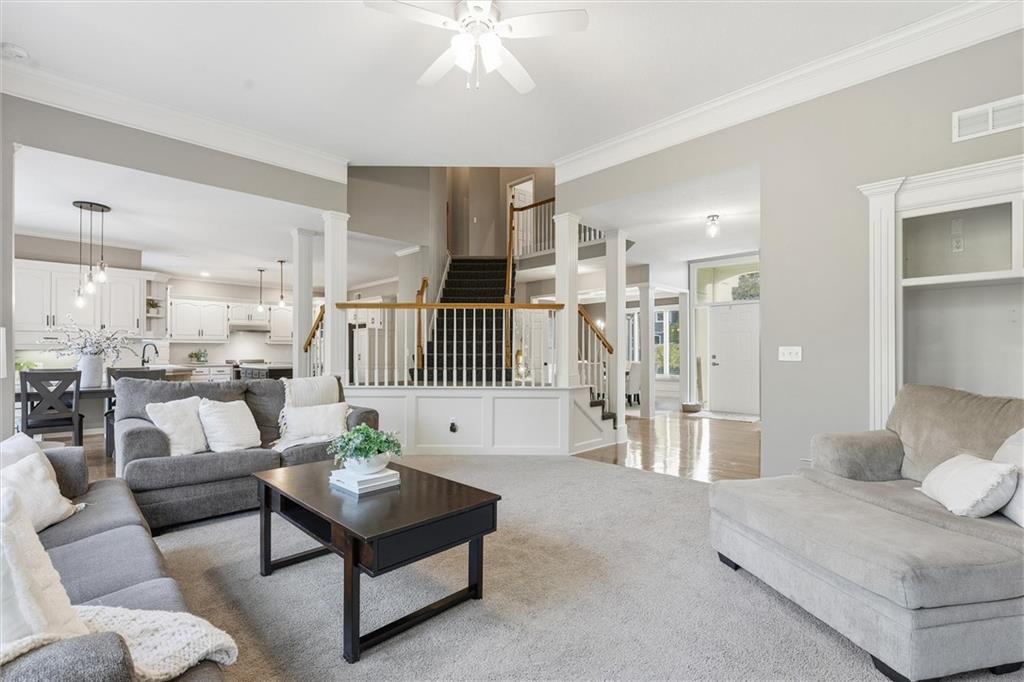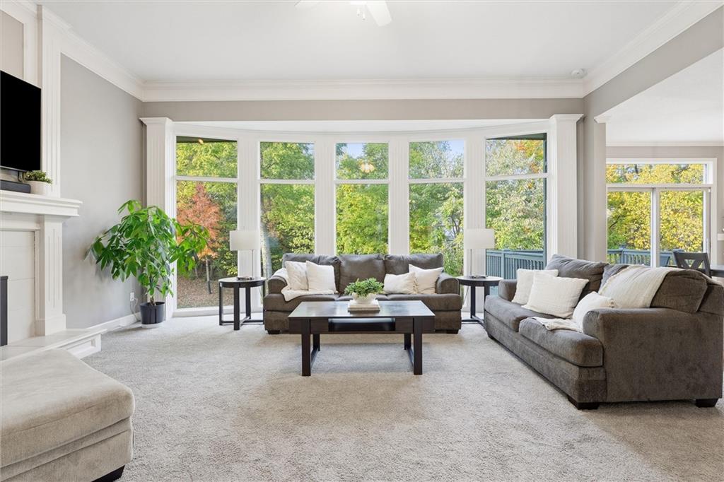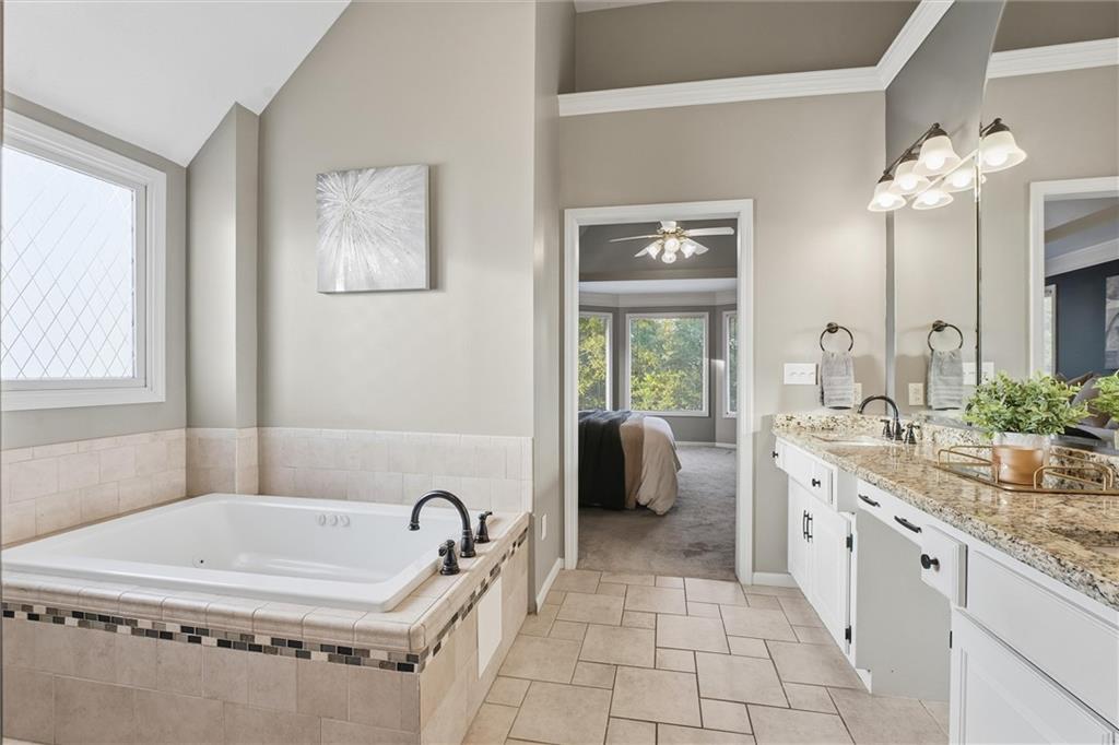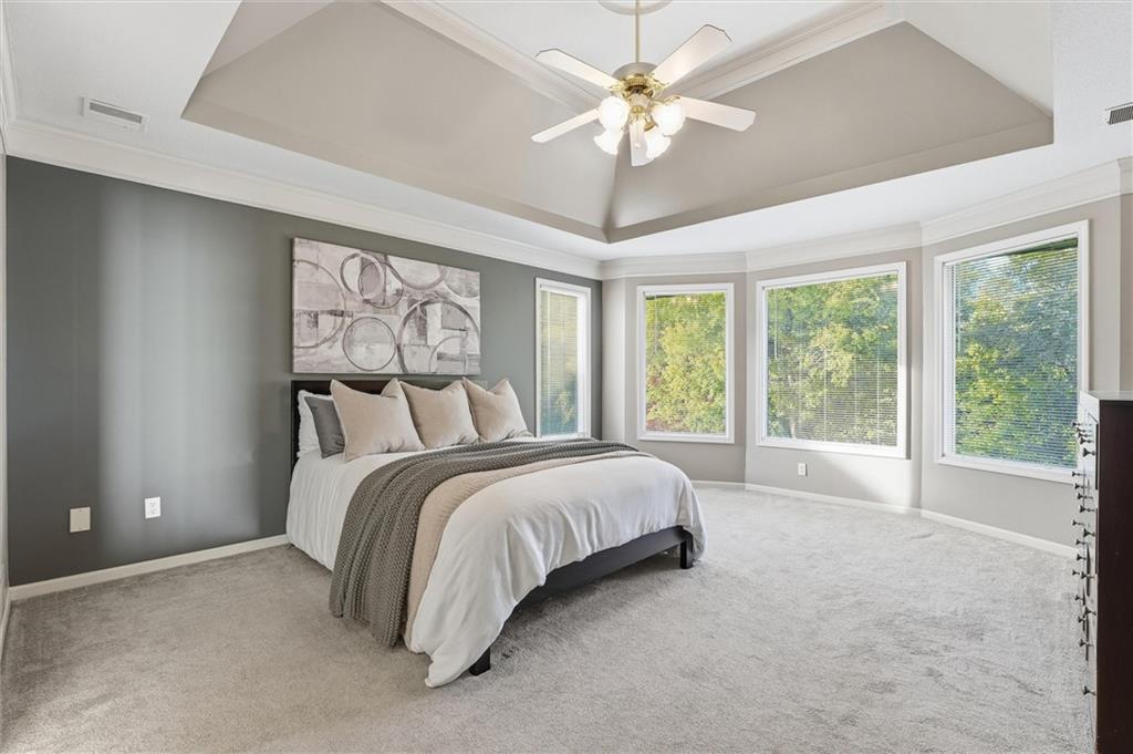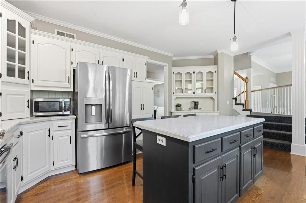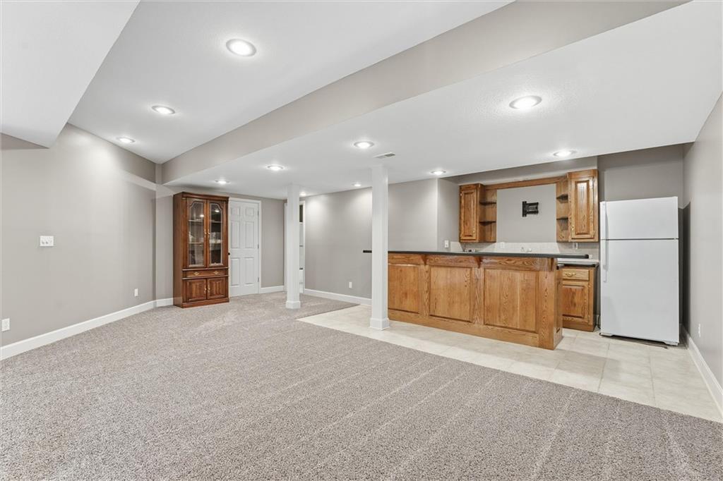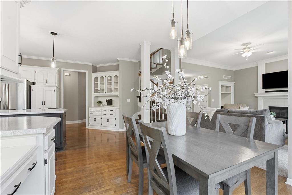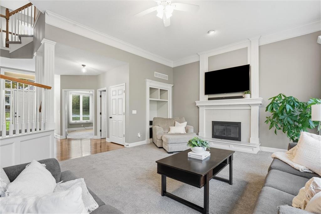 Beautifully Updated 2-Story in Coveted Riss Lake! Perfectly positioned on a quiet cul-de-sac, this home offers the ideal blend of comfort, style, and thoughtful updates throughout. The main floor features an open layout with seamless flow between living, dining and kitchen spaces. The living room features a cozy fireplace and tons of natural light from the floor-to-ceiling windows. The spacious kitchen offers wrap-around counters and cabinetry, a large island, built-in hutch, and an open dining area that leads out to the upper deck — perfect for entertaining. The main floor is completed by a formal dining room, private home office, and a convenient laundry room just off the garage, thoughtfully designed for everyday ease. The upstairs primary suite enjoys its own elevated, private level and includes a walk-in tiled shower, jetted tub, and dual vanities. Each of the three secondary bedrooms includes a walk-in closet and convenient bathroom access, with one offering a private ensuite and the other two sharing a Jack-and-Jill bath. Designed for entertaining, the finished lower level features a spacious family room with fireplace and custom built-ins, open rec space, and a wet bar. A full bath and walk-out access to the patio and tree-lined backyard complete this beautiful extension of the home. Additional highlights include a 3-car tandem garage and beautiful mature trees surrounding the property. Enjoy the exceptional Riss Lake community with lake access, pools, tennis courts, and trails — all from a peaceful cul-de-sac location.