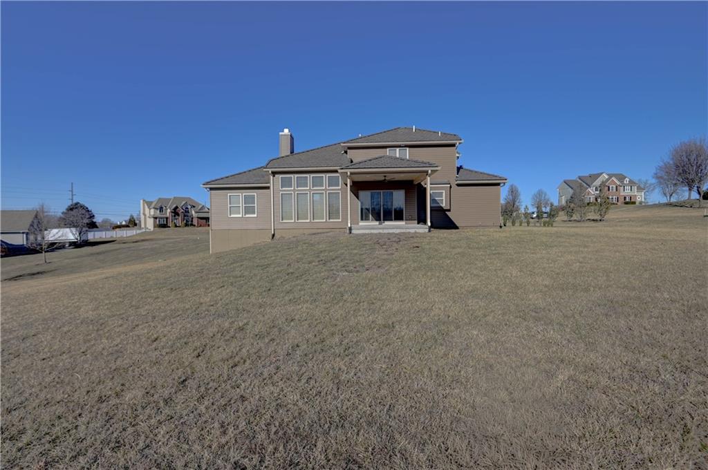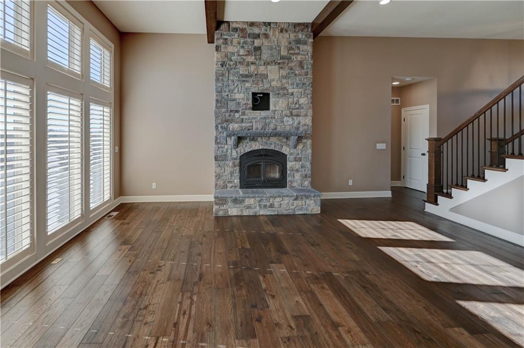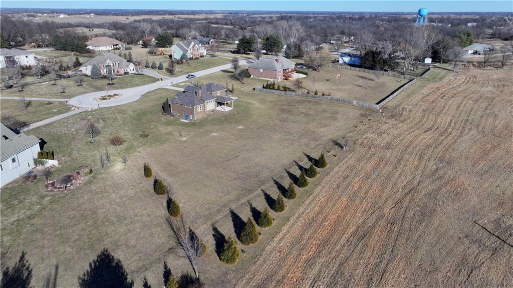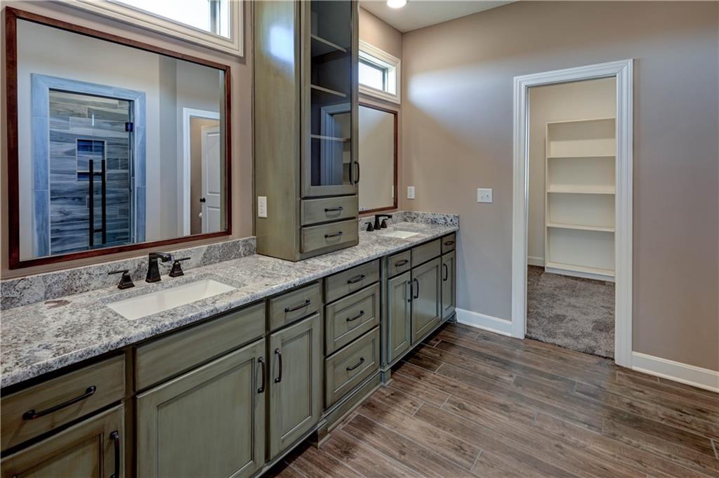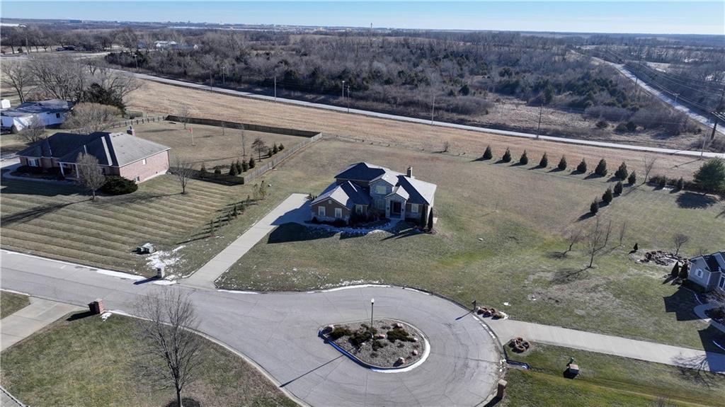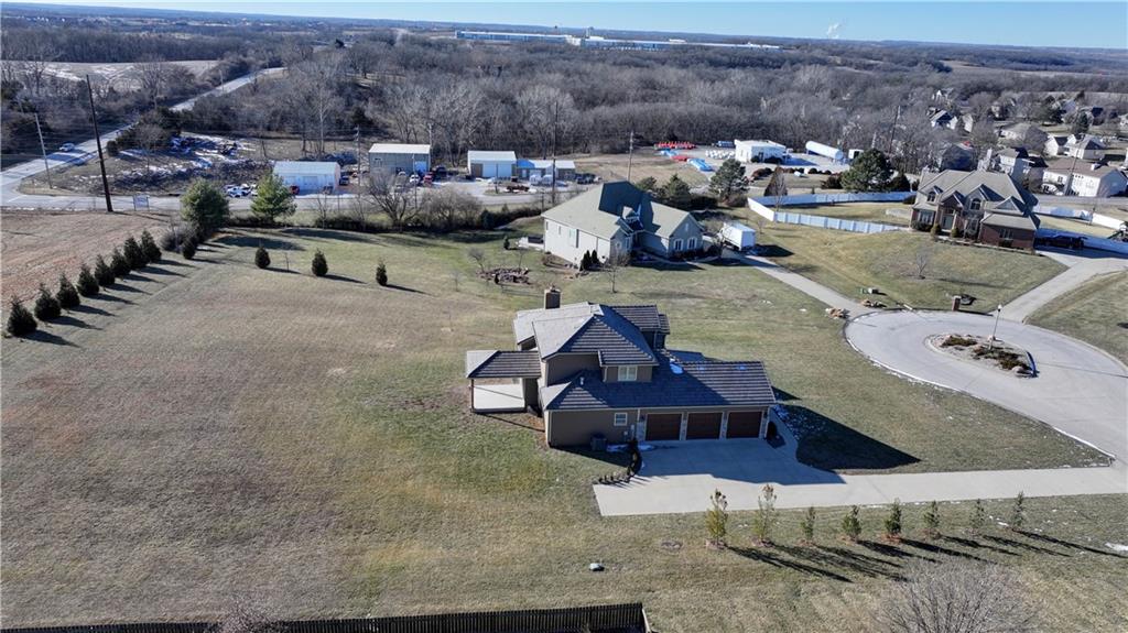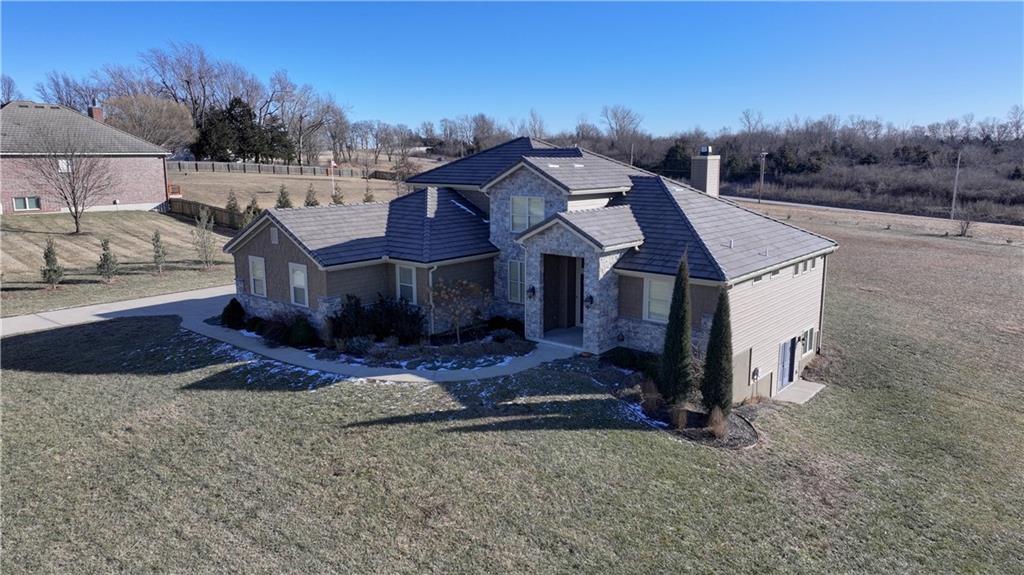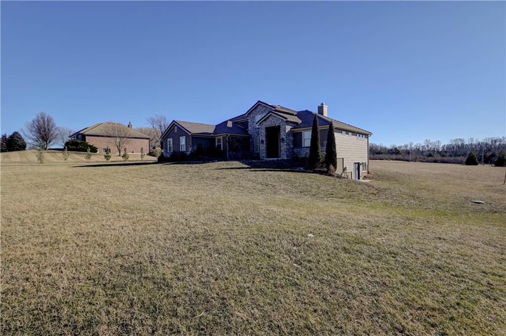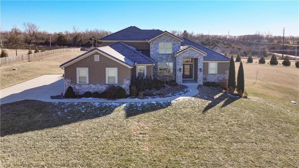 Stunning custom-built Jay Jackson home offering quality craftsmanship and timeless design on 1.5 beautifully landscaped acres. The oversized three-car garage features individual doors, larger bays, workshop space, and a wash sink. A spacious mudroom includes stone paver flooring, seating cubbies, folding area, broom closet, and laundry with cabinets. Hardwood floors flow through the kitchen, dining, and great room. The kitchen is designed for entertaining with GE Profile gas range, custom stained cabinetry, painted oversized island, granite countertops, copper farmhouse sink, and a large walk-in pantry. The dining area opens to a covered patio with ceiling fan. Plantation shutters throughout. The great room features a floor-to-ceiling stone fireplace and exposed beams. A custom half bath adds charm. The office offers wood floors, built-ins, and French doors, ideal for a flex or TV room. The entry showcases a striking light fixture, and the covered front porch is accented with stone. The main-level primary suite includes carpet, ceiling fan, exposed beams, walk-in closet, and master bath with double granite vanities and tiled shower with bench and dual shower heads. The upper level includes a large loft (possible 4th bedroom), two bedrooms with walk-in closets, and a Jack-and-Jill bath. The walk-out lower level is unfinished, plumbed for a bath, and offers excellent expansion potential. Additional highlights include a tile roof, stone and Hardy board siding, and beautiful seasonal landscaping.