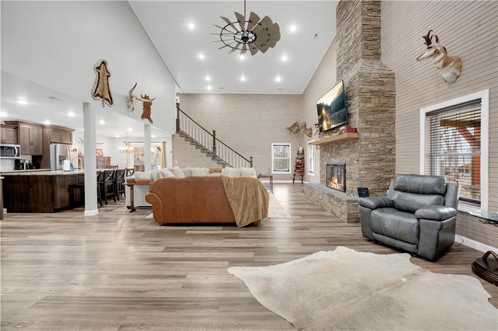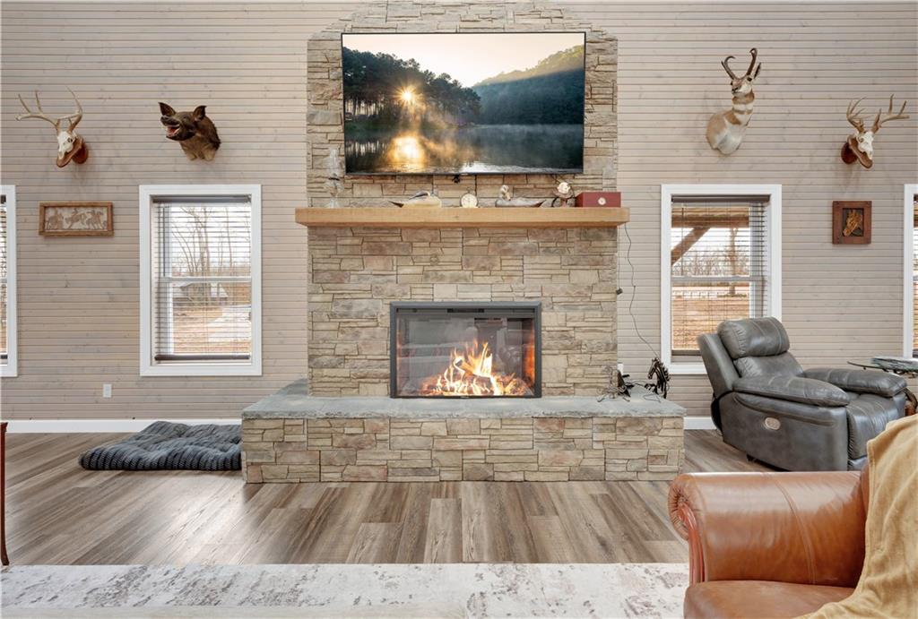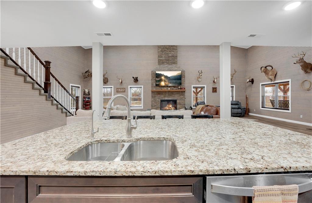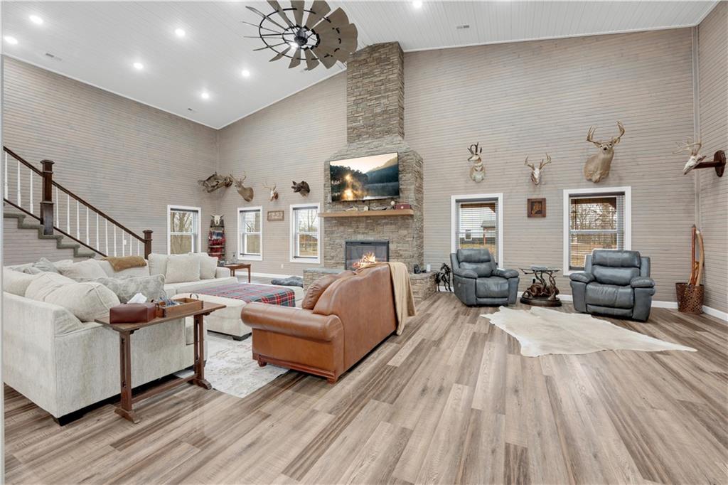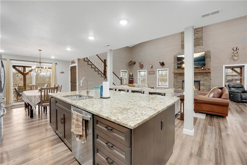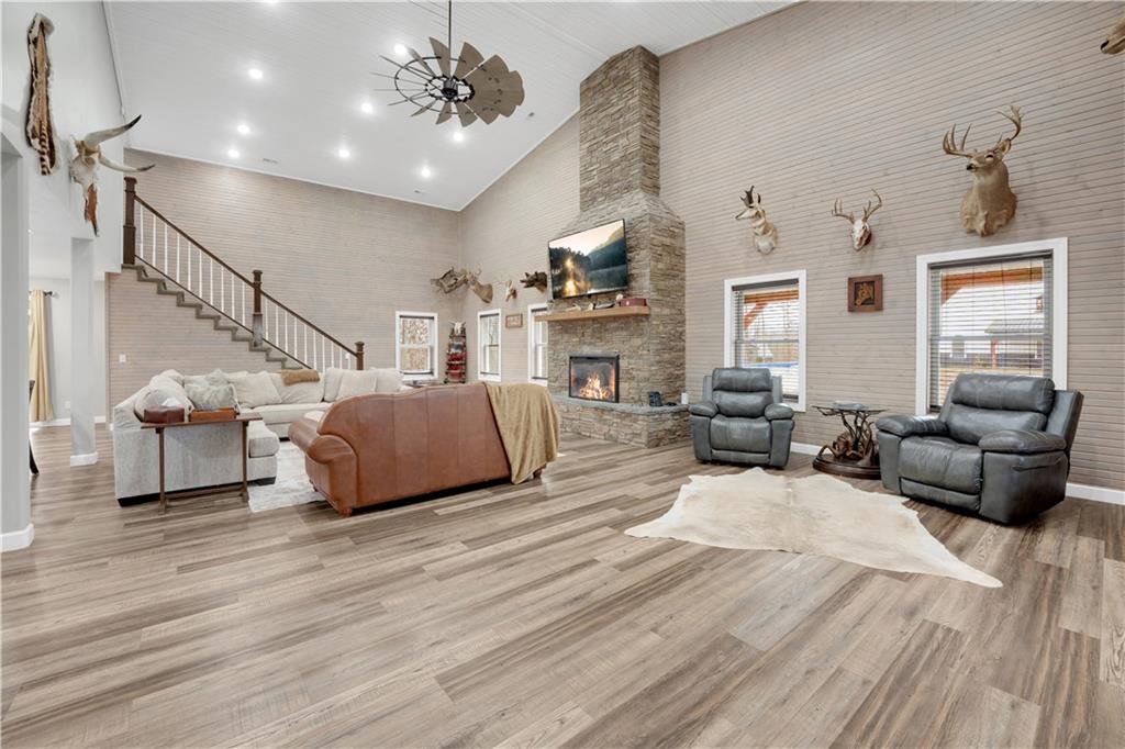 This expansive residence in Warsaw, MO, offers a harmonious blend of rustic charm and modern luxury. The two-story home boasts 4 bedrooms and 5 bathrooms, providing ample space for comfortable living. The heart of the home is the gourmet kitchen, featuring rich wooden cabinetry, granite countertops, and stainless steel appliances. The open concept layout seamlessly connects the kitchen to the dining and living areas, ideal for entertaining. The living room features a beautiful fireplace with floor to ceiling stone. Throughout the home, attention to detail is evident in the use of high-quality materials such as LVP floors, wood paneling, and decorative light fixtures. The property also includes practical spaces like a dedicated laundry room, walk-in pantry, and utility/storage rooms. Large windows offer views of the surrounding landscape, while a covered porch and deck provides outdoor living space. Newly installed oversized single overhead garage door will make storing your boat and toys as breezy as a spring day on the water! Each bedroom is generously sized and offers ample space for differing sleeping scenarios. Each room is thoughtfully designed with plush carpeting, ceiling fans, and ample natural light. The bathrooms showcase contemporary fixtures and finishes, including wood-look tile flooring and custom vanities. The home's design seamlessly blends rustic elements with modern conveniences, creating a warm and inviting atmosphere perfect for both everyday living and hosting gatherings. Don't miss this custom lake retreat!!
