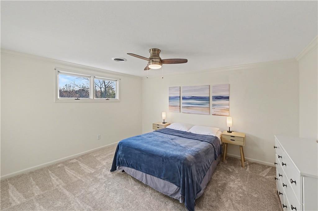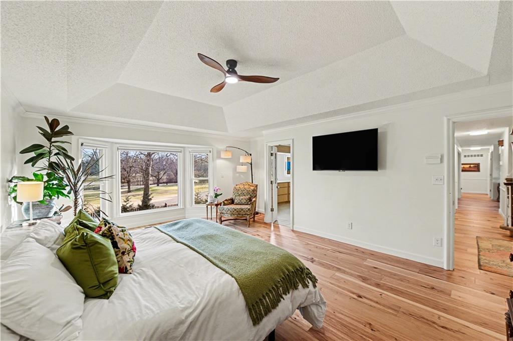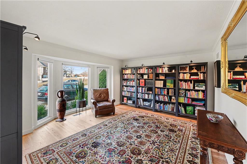 Stunning 1.5-story estate offering 4 bedrooms, 4.1 baths, a 2 car garage, and nearly 5,600 square feet, perfectly positioned on over half a acre lot along the golf course at Blue Springs Country Club. From the moment you arrive, the charming front entry welcomes you into a light-filled home designed to impress. Soaring ceilings with striking wood beams elevate the living room, where a beautiful fireplace anchors the space and walls of windows frame breathtaking golf course views. Just off the entry, a private main-level office provides the ideal work-from-home setting. The open-concept kitchen features granite countertops, abundant cabinetry, and flows seamlessly into a sunlit eat-in area/sunroom that opens onto the upper deck. Do not miss the laundry and mud room that is off the oversized garage. The main level also features a spacious primary suite with a beautifully updated spa-like bath, complete with double vanities, soaking tub, and walk-in closet. An additional bedroom and full bath are located on the main floor. Upstairs, you’ll find two oversized bedrooms and a full bath, offering comfort and privacy for family or guests.The walkout lower level is an entertainer’s dream and not to be overlooked. Enjoy a massive family room with bar area, dedicated exercise room, all-seasons room, full bath, fifth non-conforming bedroom, and even a 3rd garage with two workshop spaces — ideal for hobbyists or extra storage. The meticulously landscaped yard is truly exceptional, featuring an upper-level sitting deck, lower-level patio, and established vegetable gardens ready for the next growing season. This home has been impeccably maintained updated with fresh interior paint, refinished hardwood floors, new lighting, an updated primary bath, and more. A rare opportunity to own a golf course retreat that combines elegance, comfort, and functionality — this is a home you must experience to truly appreciate.