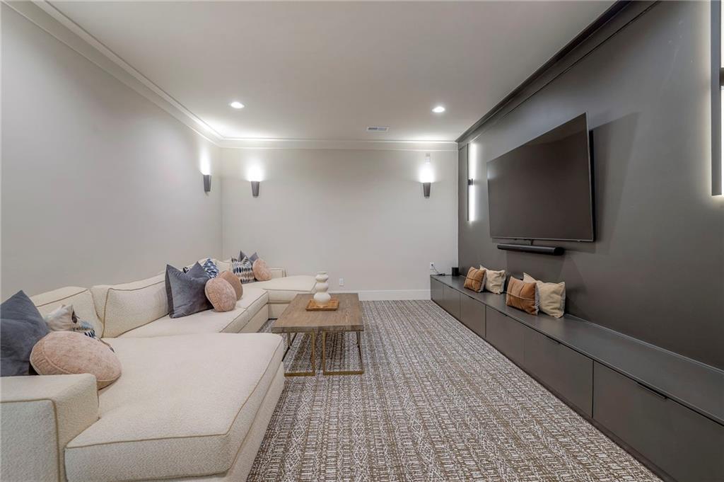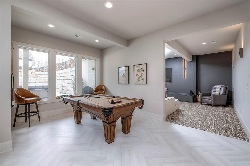 Welcome to this stunning, thoughtfully designed home where elevated finishes and exceptional entertaining spaces come together beautifully. The dramatic living room showcases soaring 18-foot ceilings, custom built-ins, and charming arched fireplace, all complemented by wide-plank hardwood flooring that flows seamlessly throughout the main living areas. Plantation shutters throughout the home and elegant arched doorways add timeless architectural character, style, and privacy. The designer kitchen is both sophisticated and functional, featuring a gas range, quartzite countertops, striking stone feature wall, wine fridge, and abundant workspace for everyday living or hosting. Just off the kitchen, a spacious butler’s pantry provides additional storage and convenience, complete with a second oven, making entertaining effortless. The kitchen opens directly to a large covered deck with low-maintenance Trex decking, creating the perfect indoor-outdoor connection. The luxurious primary suite is a private retreat, highlighted by a beamed ceiling and stone feature wall, and complemented by a spa-inspired bath offering LED mirrors, quartzite countertops, a soaking tub, and an oversized walk-in shower. The laundry room is conveniently located just off the primary suite for added everyday ease. The walk-out lower level is designed for unforgettable gatherings, featuring a media room and an impressive entertaining bar with waterfall-edge quartzite countertops, microwave, drink fridge, and wine fridge. Step outside to the patio, partially covered for year-round enjoyment, complete with a see-through stone fireplace and hot tub, creating an inviting outdoor living space perfect for relaxing or hosting guests.