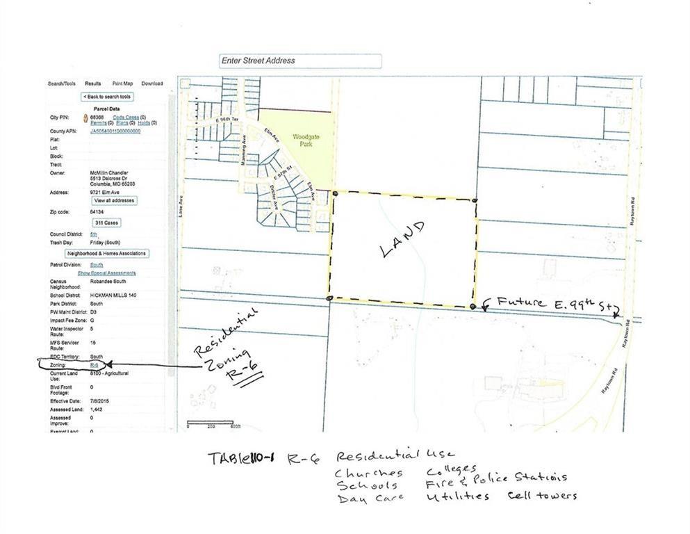 Incredible opportunity in a rapidly growing corridor near Raytown and Lee’s Summit! This 27.63-acre wooded parcel offers a rare combination of natural beauty and development potential. Located just minutes from the Cerner Innovations Campus and key commuter routes, this prime tract is ideally suited for single-family or multifamily residential development. Surrounded by expanding neighborhoods and strong area growth, the land provides a private, treed setting with easy access to schools, retail, and major employers. Utilities nearby. Bring your vision - opportunities like this are limited!
