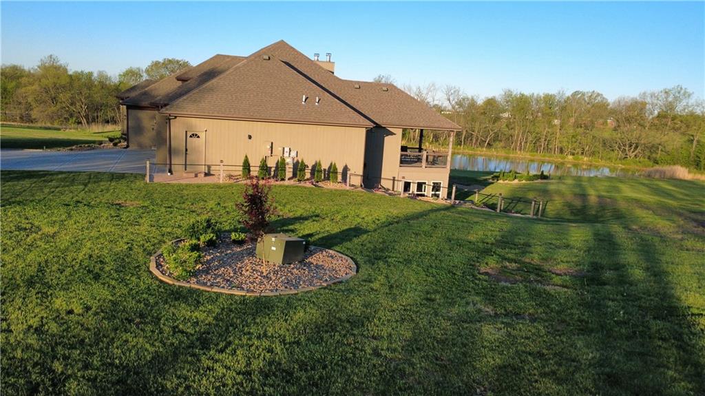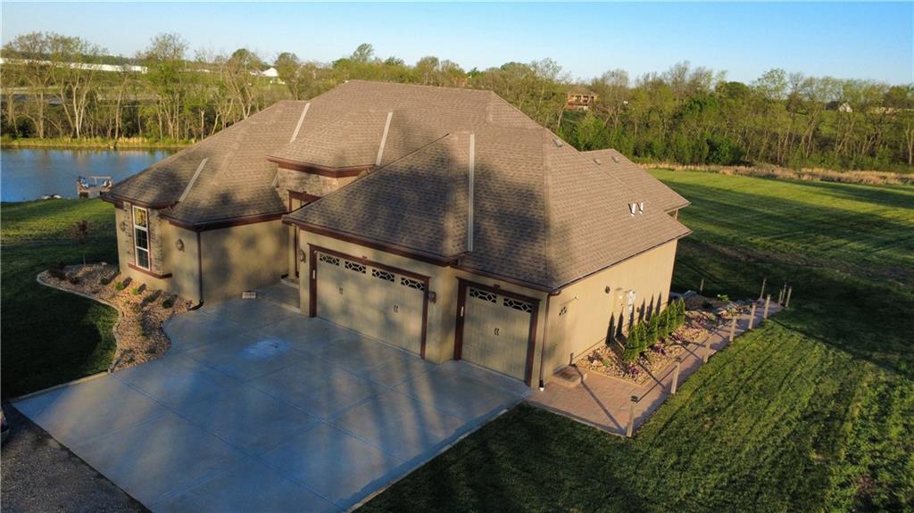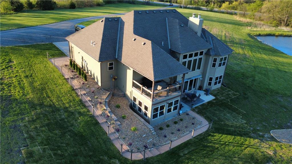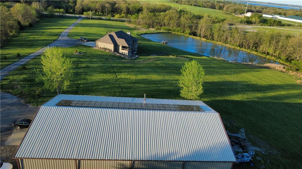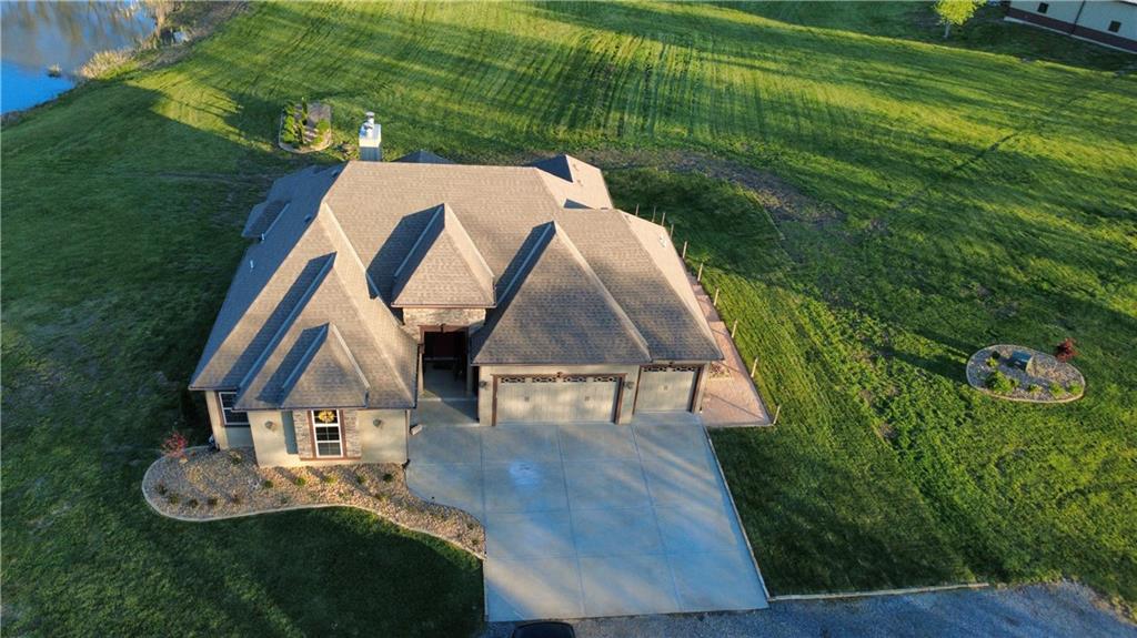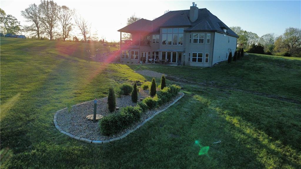 Tucked away on 14 beautiful open acres, this 4,200 sq. ft. custom-built home offers a harmonious blend of outdoor amenities and beautiful natural design. Made in 2017 and built to last, this home was meticulously created with quality construction. Beautiful, quiet outdoor spaces enhance this seasonal heaven. Smithville Lake sparkles nearby, and a tree-lined property delivers a true four-season Midwest experience—fishing in the spring, lake days in the summer, vibrant fall views, and wide-open space for winter activities. Made to relax in quality and comfort, the main level greets you with 12 ft. ceilings and the natural hardwood floors of your dreams. This home offers a spacious kitchen, living and dining areas, a walk-in pantry, custom cabinetry, custom granite countertops, a floor-to-ceiling stone fireplace, and built-ins throughout. With the main level 3 bedrooms, a second full bath, and a half bath off the kitchen, the single level living is a great option. The primary suite (on the main level) includes a full bathroom with a jacuzzi tub, walk-in shower, his and hers granite sink, and a walk-in closet. Descending a breathtaking spiral staircase, the finished walkout basement expands the living space with an additional primary suite that features a jacuzzi tub, walk-in shower, and walk-in closet. Another bedroom, full bath, and second laundry room elevate basement living. The open living room, full kitchen, commercial refrigerator, and walk-in pantry make it perfect for hosting. Comfort and efficiency are enhanced by supplemental solar power, geothermal HVAC, 3 water heaters, and 2 stone fireplaces to keep you cozy and ready for the Midwest. Outdoors, the property is equally impressive with an attached three-car garage, a detached 60’ x 100’ shop/barn (with 6' concrete floors and fully insulated), carport, and an extra 12’ x 20’ shed. This home offers true country living built on craftsmanship, quality, and comfort.