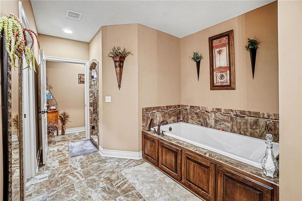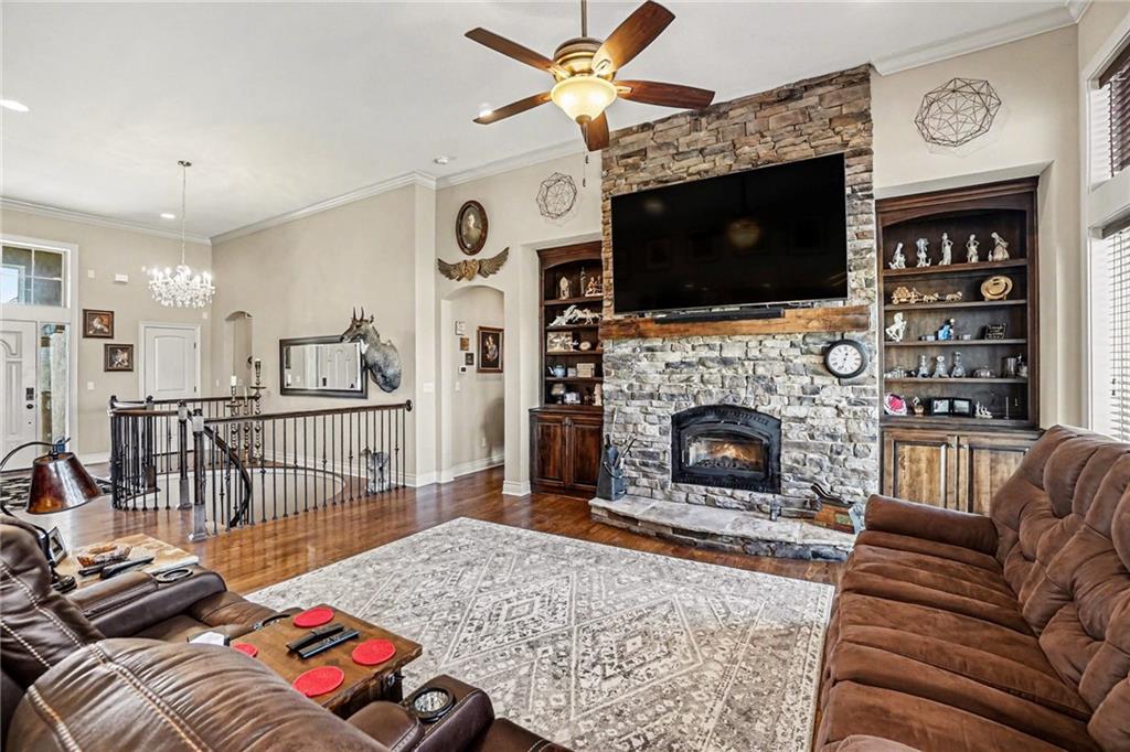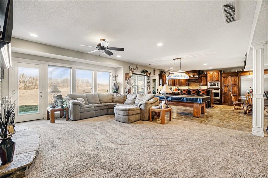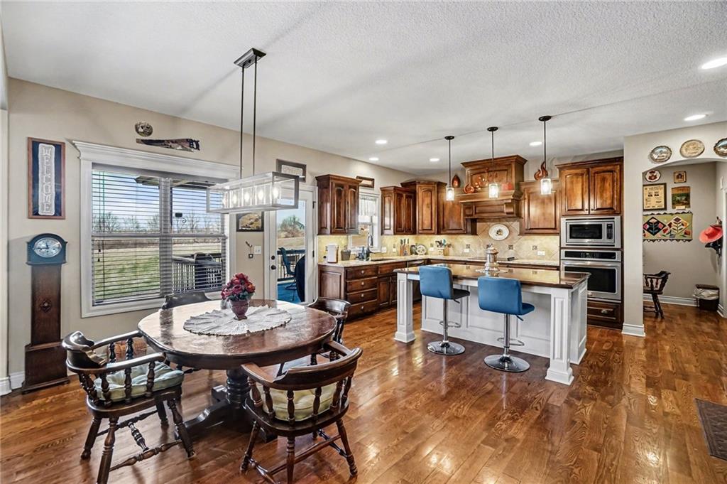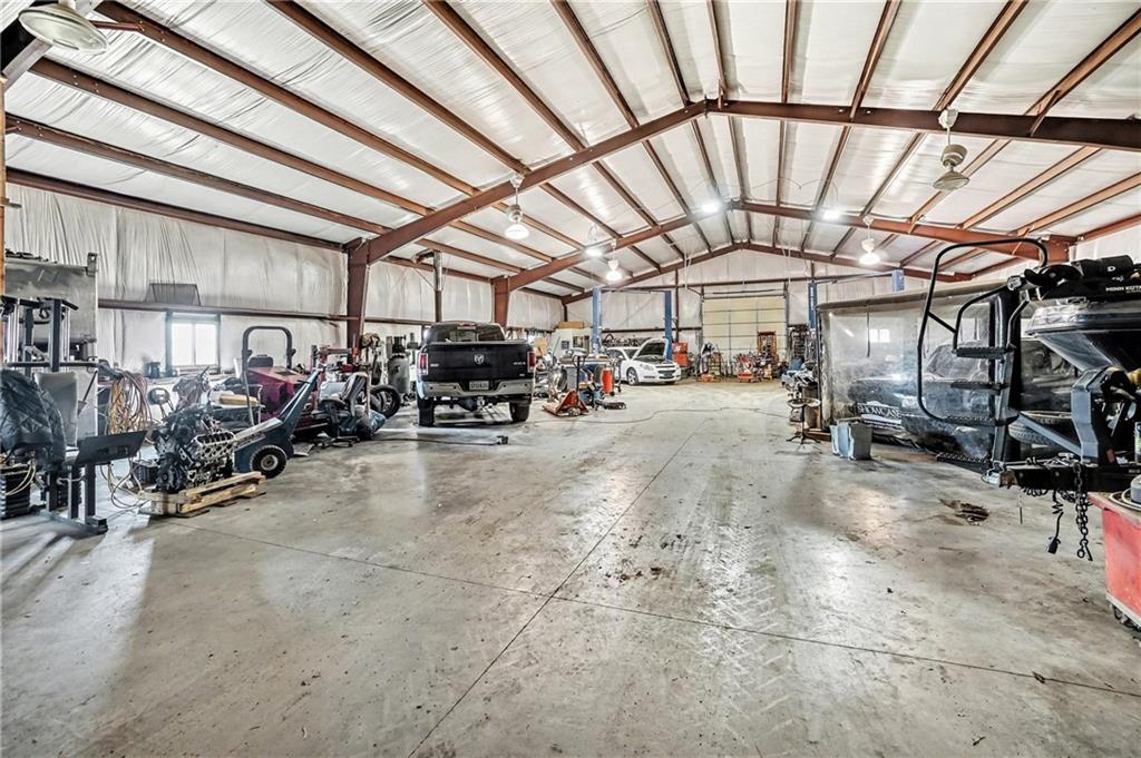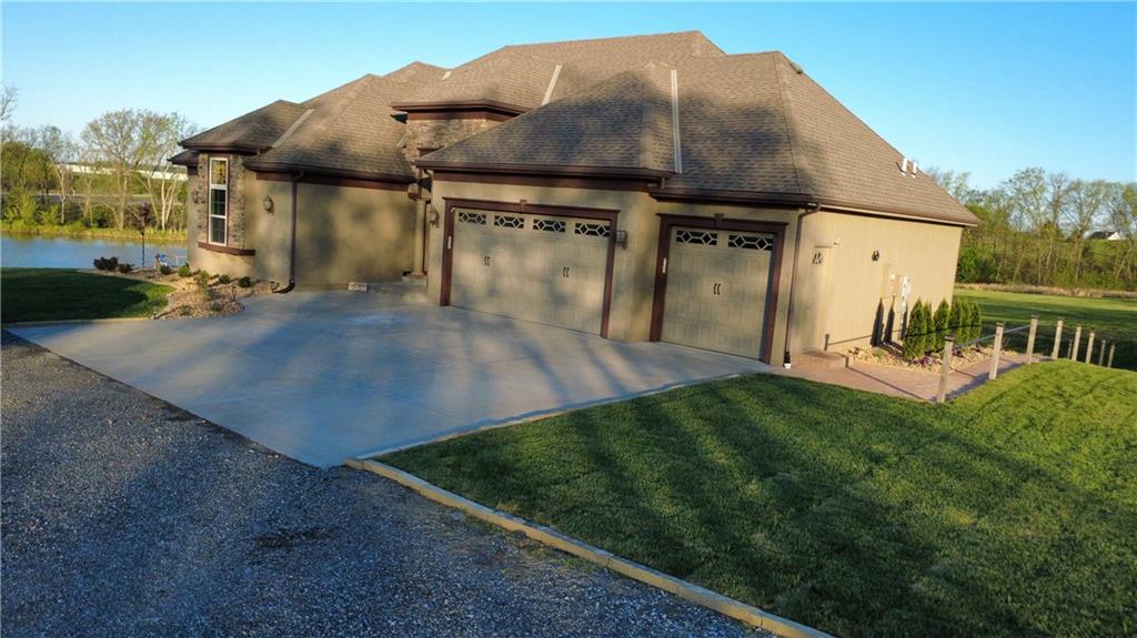 Tucked away on 14 beautiful open acres, this 4,200 sq. ft. custom-built home offers a harmonious blend of outdoor amenities and beautiful natural design. Made in 2017 and built to last, this home was meticulously created with quality construction. Beautiful, quiet outdoor spaces enhance this seasonal heaven. Smithville Lake sparkles nearby, and a tree-lined property delivers a true four-season Midwest experience—fishing in the spring, lake days in the summer, vibrant fall views, and wide-open space for winter activities. Made to relax in quality and comfort, the main level greets you with 12 ft. ceilings and the natural hardwood floors of your dreams. This home offers a spacious kitchen, living and dining areas, a walk-in pantry, custom cabinetry, custom granite countertops, a floor-to-ceiling stone fireplace, and built-ins throughout. With the main level 3 bedrooms, a second full bath, and a half bath off the kitchen, the single level living is a great option. The primary suite (on the main level) includes a full bathroom with a jacuzzi tub, walk-in shower, his and hers granite sink, and a walk-in closet. Descending a breathtaking spiral staircase, the finished walkout basement expands the living space with an additional primary suite that features a jacuzzi tub, walk-in shower, and walk-in closet. Another bedroom, full bath, and second laundry room elevate basement living. The open living room, full kitchen, commercial refrigerator, and walk-in pantry make it perfect for hosting. Comfort and efficiency are enhanced by supplemental solar power, geothermal HVAC, 3 water heaters, and 2 stone fireplaces to keep you cozy and ready for the Midwest. Outdoors, the property is equally impressive with an attached three-car garage, a detached 60’ x 100’ shop/barn (with 6' concrete floors and fully insulated), carport, and an extra 12’ x 20’ shed. This home offers true country living built on craftsmanship, quality, and comfort.