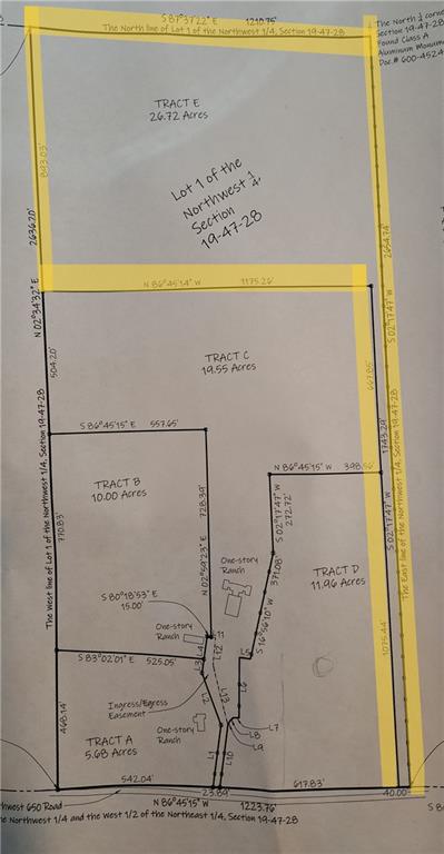26.7 acres with timber and cleared land. Perfect for a Private Retreat or Development! On the survey map, this is Tract E of Lot 1. There is a 40 feet wide access easement from the acreage to the 650th Road. This was part of the 80 acres of Lot 1 that has now been divided to be sold separately. See MLS# 2564856 for the 53.3 acres and buildings being sold separately. Approximately half of the acreage is timber and the rest is cleared land. No utilities on the property, but electricity is on 650th Road. Come and explore the Opportunities!