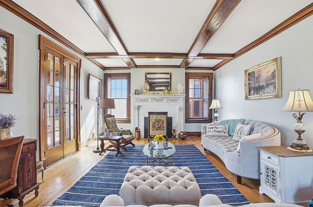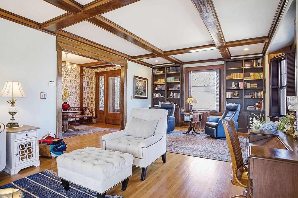 Timeless architecture, extraordinary craftsmanship, and over 5,100 square feet of beautifully preserved history - this stately all-brick residence is truly one of a kind. From the moment you enter through the original leaded glass doors, the grand foyer sets the tone with soaring ceilings, rich hardwood floors, and remarkable millwork that simply cannot be replicated today. The main level showcases stunning walnut-paneled formal dining, box-beamed ceilings, built-ins, multiple fireplaces, and a gracious great room designed for gathering. The updated kitchen blends historic character with modern function, featuring custom cabinetry, granite countertops, a gas cooktop, double ovens, a pantry, and seamless access to the butler’s pantry and formal dining room. A dream office with a wet bar offers flexibility for work or entertaining. Upstairs, the second level offers a luxurious primary suite with a newly remodeled master bath, along with additional spacious bedrooms - including private bath access and a charming sunroom retreat. The third level continues the story with two large bedrooms, a full bath, bonus living space, and endless possibilities for guests, hobbies, or play. Recent improvements provide peace of mind and efficiency, including a new furnace, an added security system, a pellet stove, zoned HVAC, and solar panels. A half bath has been added in the basement for convenience. Outside, enjoy the expansive deck and covered porch overlooking the property, plus a 3+ car carriage-style garage with potential for studio, workshop, or guest quarters. Historic elegance. Modern updates. Grand scale. This is more than a home - it’s a legacy property.