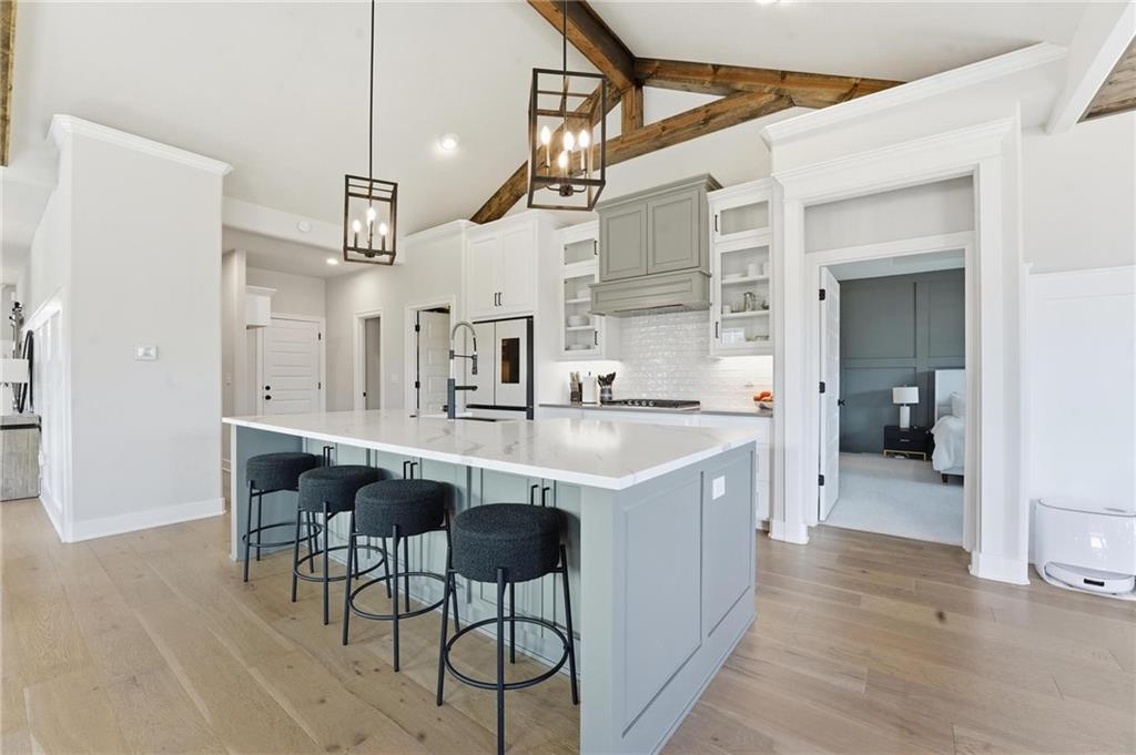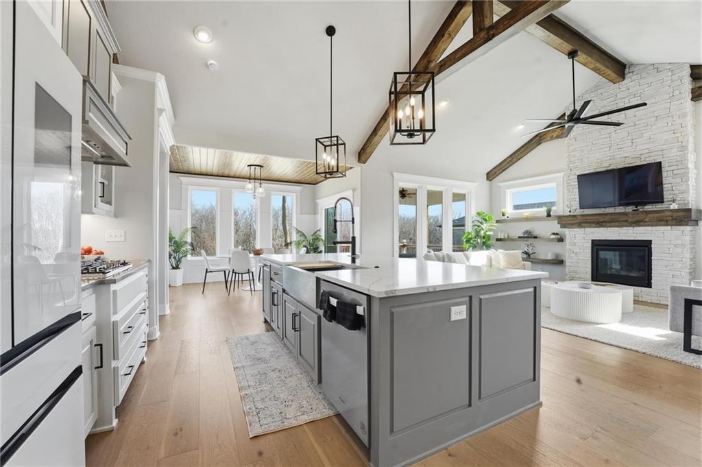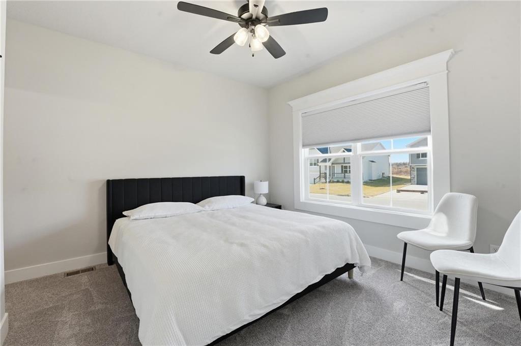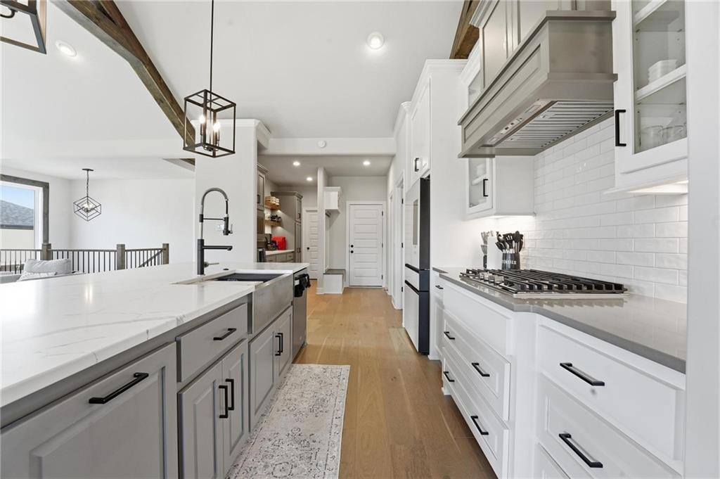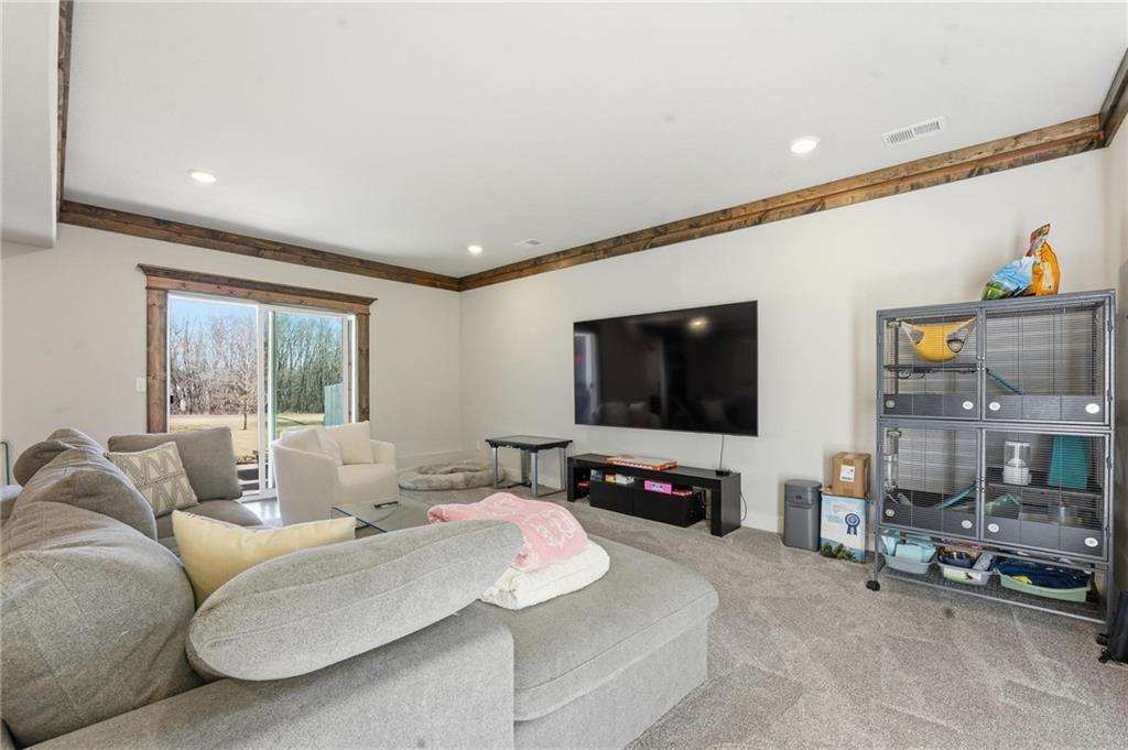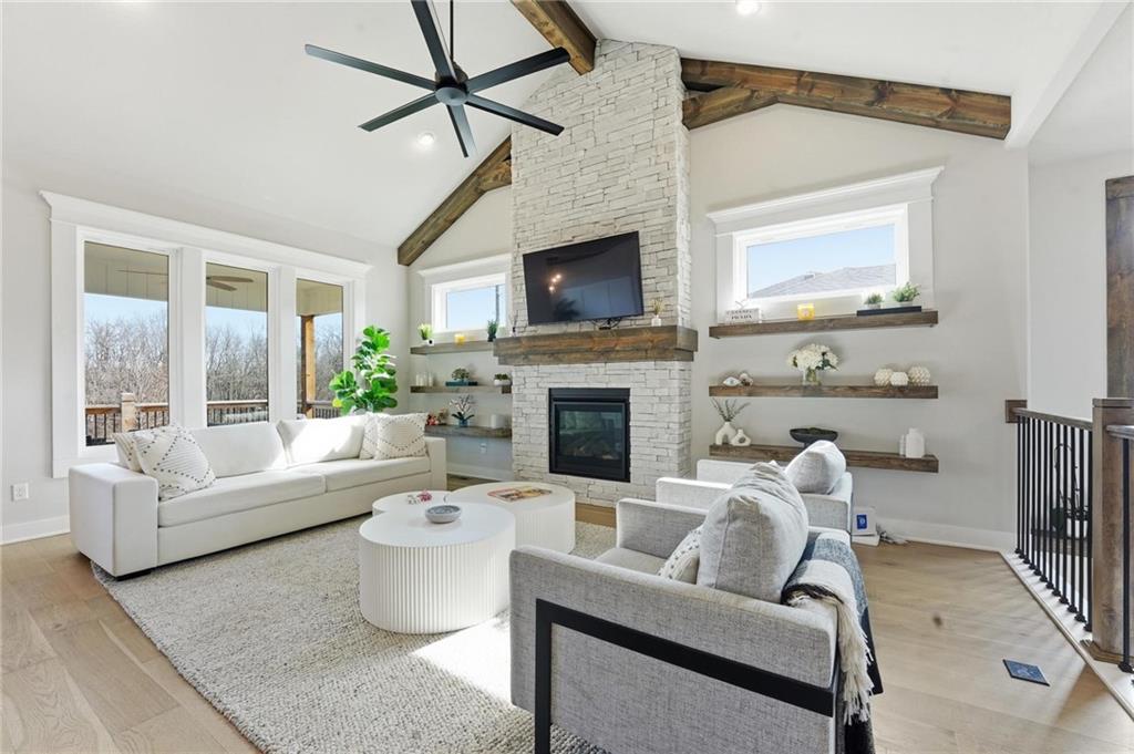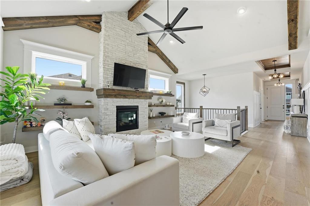 Better than new in this barely lived in TruMark Custom Home... This is the Kyle IV with loads of beautiful finishes and upgrades! No need to wait for new... deck steps installed, custom blinds are installed and home is fully furnished (if you desire) and ready to move into! The layout is perfect! Floorplan is open! Finishes are beautiful! Meticulously maintained, front pocket office with built-in shelving. Front, spacious bedroom flooded with daylight and it's own full bathroom with beautiful tile finishes and quartz countertops - Perfect for a 2nd main level primary suite! Greeted with an oversized welcome entryway. Unique features, including wood beams, wood ceiling finishes. floor-to-ceiling stone fireplace, custom blinds, hardwood floors, nice lighting and hardware and more! The TVs stay for convenience. Kitchen and dining areas are perfect in size, come with loads of quartz counter space, huge island, a butler's pantry, walk-in pantry, under cabinet lighting, boot bench and access to laundry room. Primary Suite with gorgeous ensuite that you must see! Separate soaking tub and tile shower and stylish double vanities! Bathrooms come with quartz countertops and quality finishings. Covered deck with stairs down to yard and lower level walkout. The lower level has 3 more conforming bedrooms, recreation room, full bathroom and storage area. Security system and sprinkler system are already installed. Why wait for new when this flawless home is waiting just for you! A New Kyle IV with similar upgrades is listed for $795k... Take a look today!