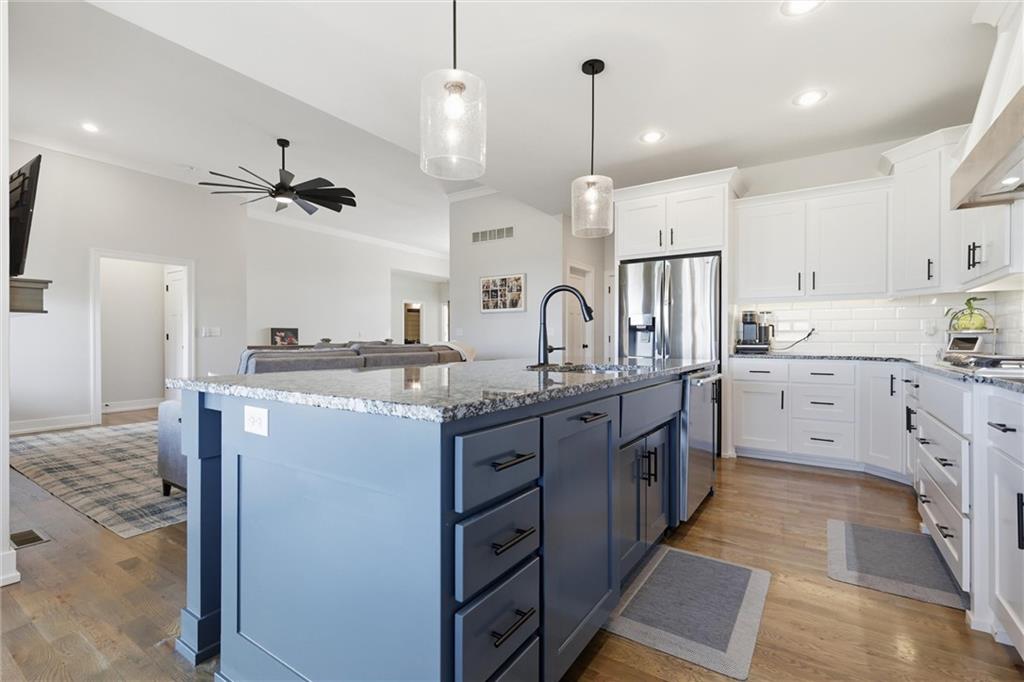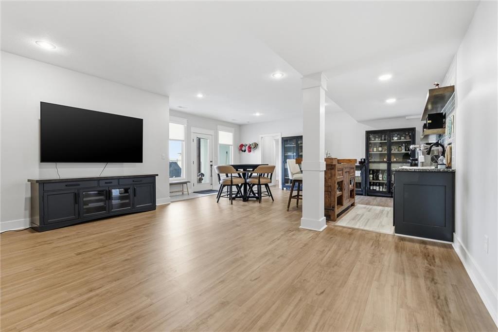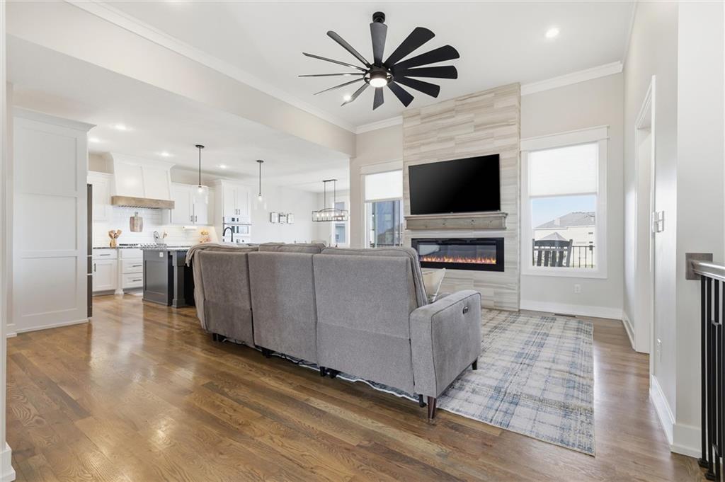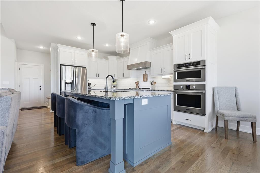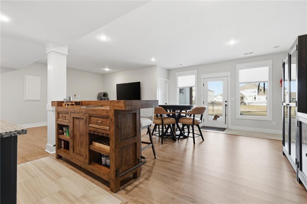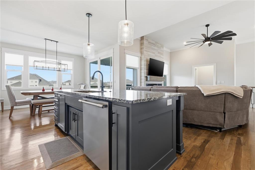 Welcome home to this beautifully upgraded property that perfectly blends style, comfort, and functionality. Step inside to find gorgeous wood floors throughout the main level living space, creating a warm and inviting atmosphere. The spacious living area features a stunning electric fireplace with color-changing LED lights, offering both cozy ambiance and a modern focal point. The kitchen is designed to impress with an oversized island, gas range, double ovens and granite countertops throughout — ideal for entertaining and everyday living. Thoughtful upgrades continue into the bathrooms, where you’ll find floor-to-ceiling tile in every shower/bath. The luxurious primary suite features a zero-entry shower with dual shower heads and corner seat, combining elegance and convenience. The lower level is perfect for entertaining with a designated bar space, LVP flooring was added in May 2025, and for added peace of mind, air ducts were professionally cleaned in October 2025. Additional improvements include buried downspouts and french drains to enhance drainage and functionality. Outdoor living truly shines here. The fenced, walkout lot backs to a shared green space and offers peaceful lake views. Enjoy morning coffee or evening sunsets from the large covered deck with Trex decking, built for durability and low maintenance. The stocked lake provides fishing opportunities just steps from your backyard — a rare and special feature. This home offers upgraded finishes, thoughtful improvements, and an unbeatable setting — the perfect place to relax, entertain, and enjoy life.