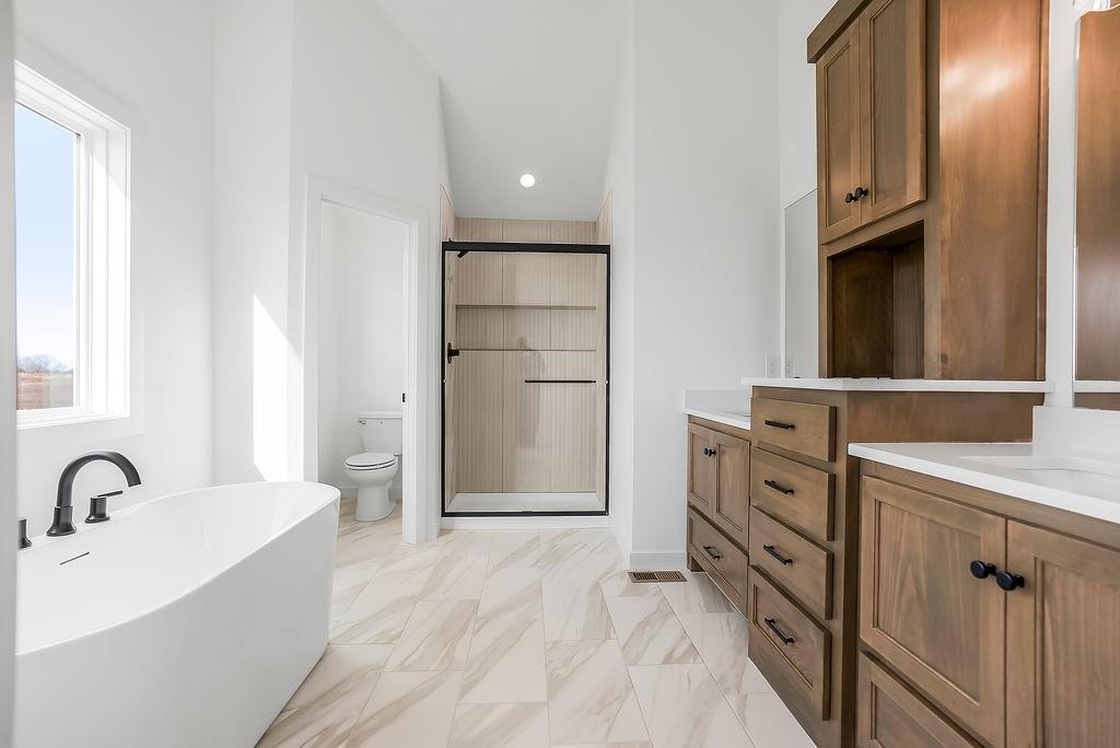 The William plan by L/M Homes. This spacious, open and airy plan checks all of the boxes! Beautiful great room with fireplace, 16' vaulted ceilings, upgraded trim detail and hardwoods. Beautiful kitchen with oversized island, pantry and quartz tops. Primary bedroom with walk in closet and vaulted ceilings. Master bath with double vanities, soaker tub and shower. 2 other generously sized secondary bedrooms on the main floor as well as laundry room. Lower level with mud bench and cubbies. Rec / living room and additional bedroom and bathroom. Extra deep 3 car garage, covered deck, great curb appeal and sitting on a great flat yard! (PICTURE ARE OF A PREVIOUS MODEL)
