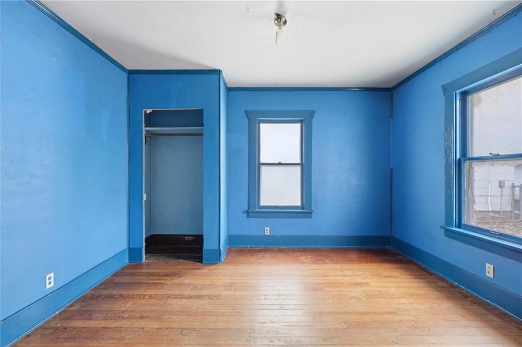 Unfurnished bedroom featuring light wood-style floors and a closet