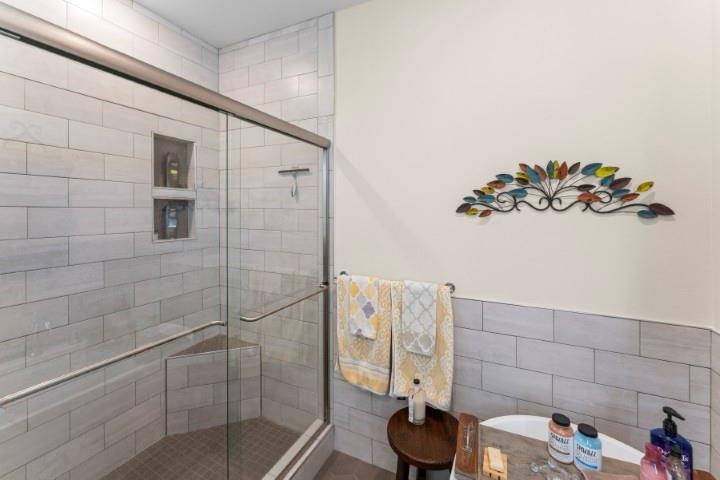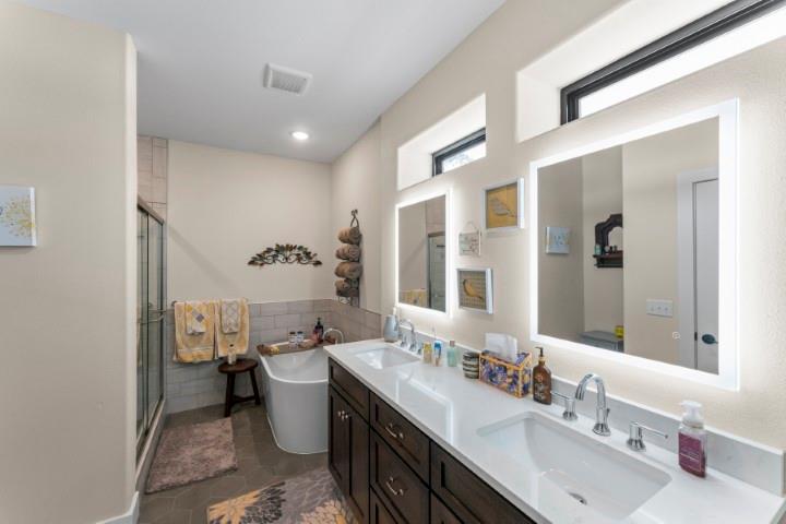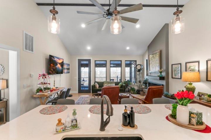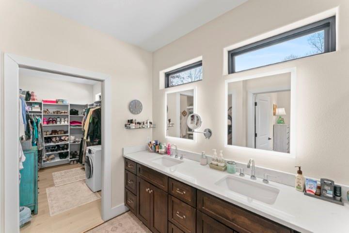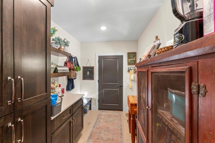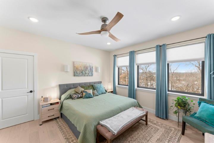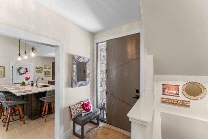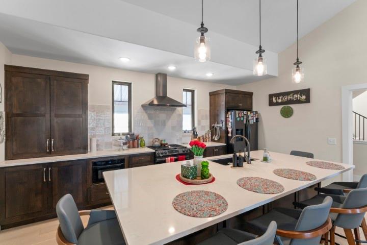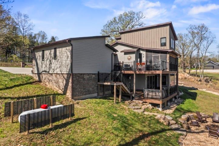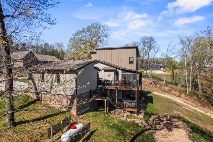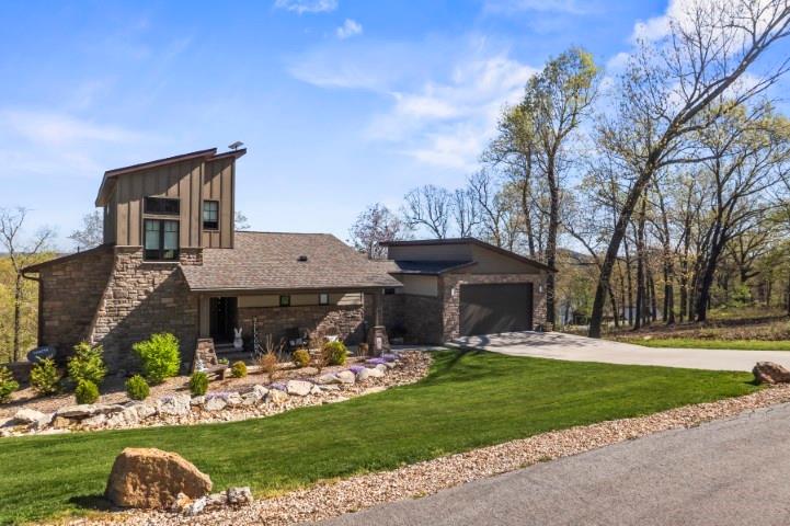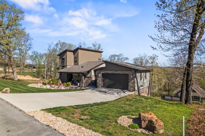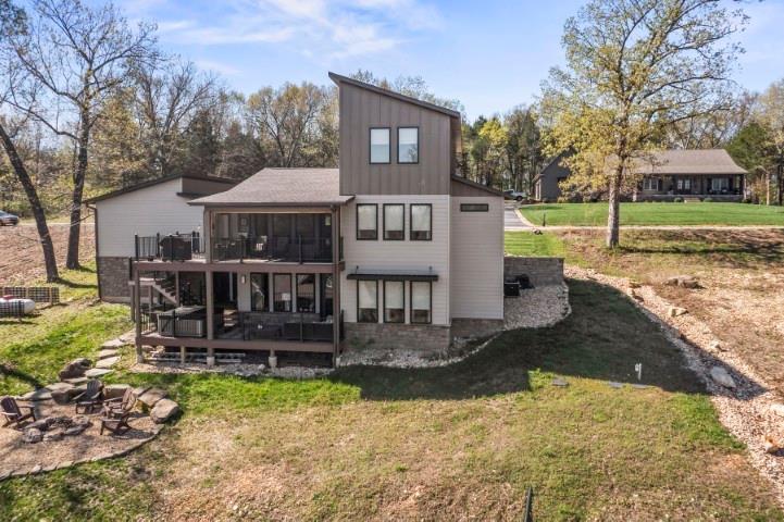Enjoy modern lake living in this stylish contemporary home with a beautiful lake view and thoughtfully designed spaces throughout. Inside, you’ll find warm wood floors, a dramatic vaulted living room with a sleek linear fireplace, and oversized windows that fill the home with natural light. Step outside to both covered and open decks featuring modern railings, patio furniture, and a hot tub that’s perfect for relaxing or entertaining. The open kitchen is a standout, centered around an impressive 10-foot island with seating for eight (stools included), black stainless steel appliances, custom cabinetry, quartz countertops, and a pantry with built-ins. The main-level primary suite offers high ceilings and a spacious bath with double sinks, LED mirrors, quartz countertops, and a large 4x7 walk-in shower. The generous closet includes built-ins and a convenient washer/dryer hookup. Downstairs, the walkout lower level features a comfortable family room with a gas fireplace and deck access, a second bedroom suite with soaking tub and walk-in shower, a laundry room, ample storage, and a wet-bar hookup already stubbed in. Upstairs, guests will appreciate a private suite with a loft area, creating flexible space for additional sleeping, office use, or a retreat. The oversized two-car garage offers potential for a workshop or additional garage space with road access. A boat ramp is located just one mile away on Hwy H, and a possible third-party boat slip may be available through the dock master. This is a great opportunity to enjoy comfort, style, and lake-area convenience in one beautifully designed home.