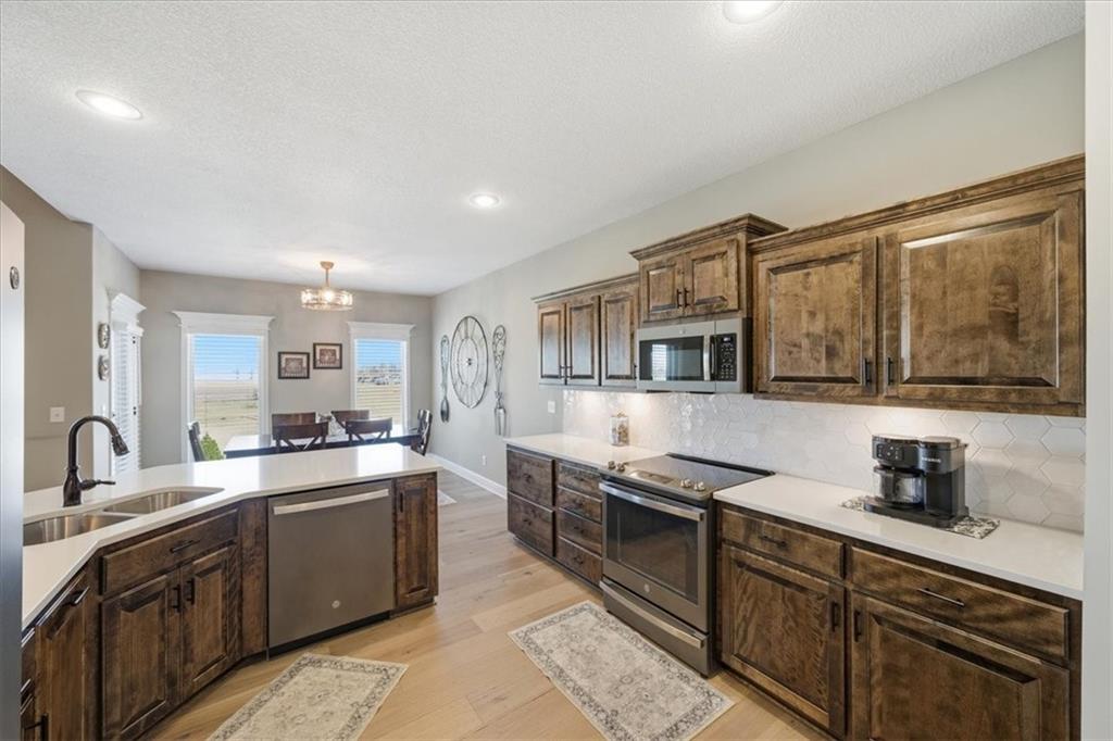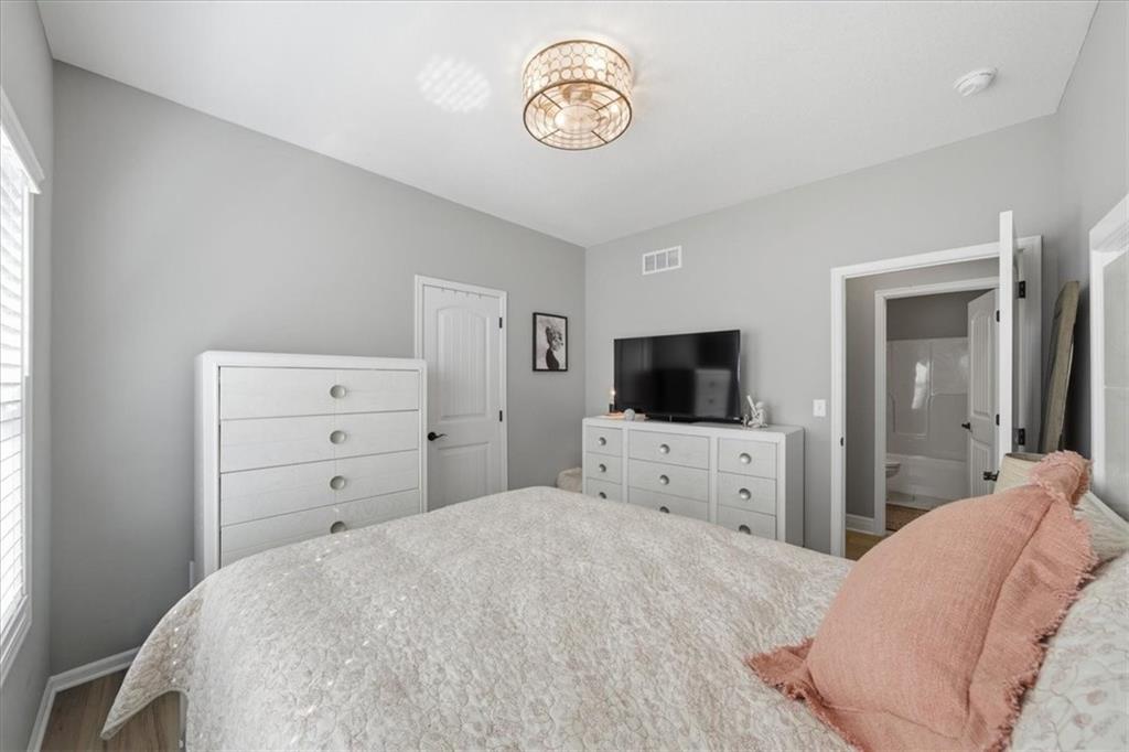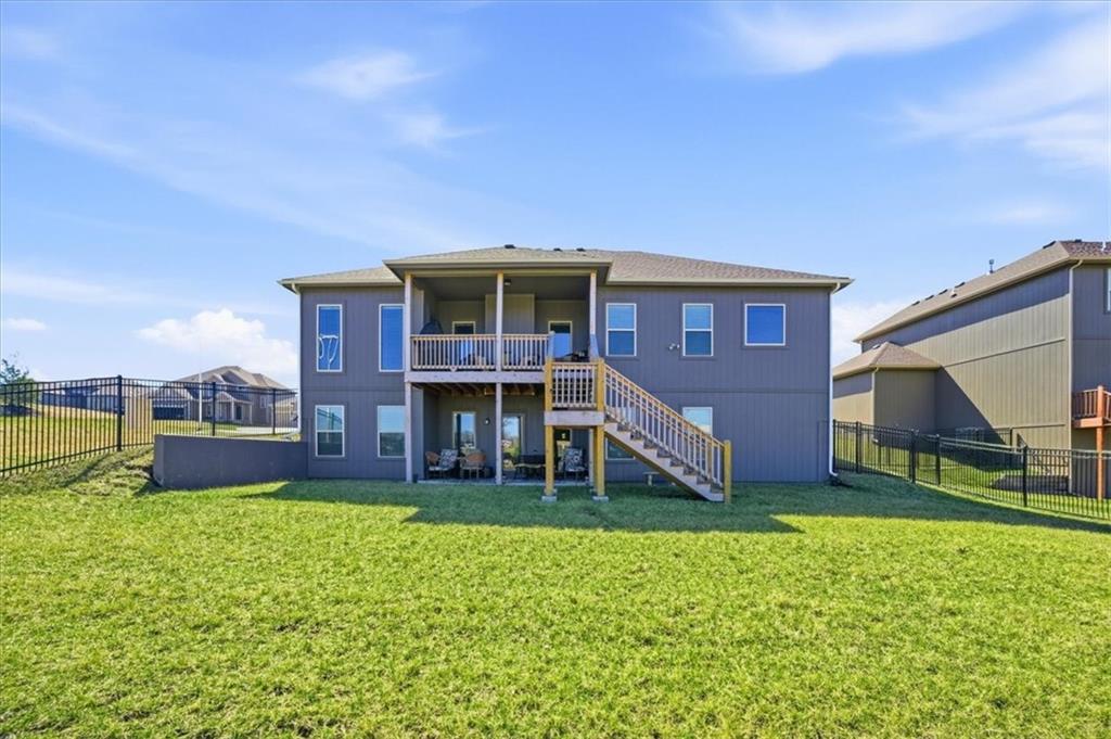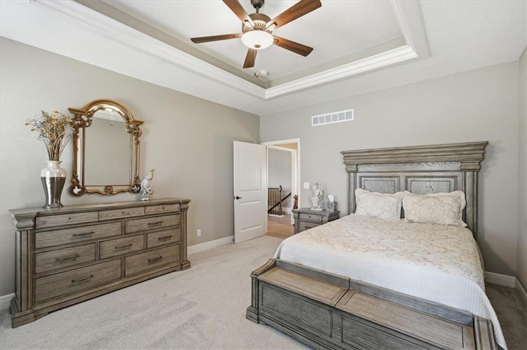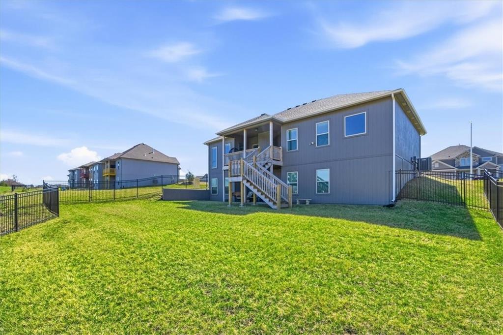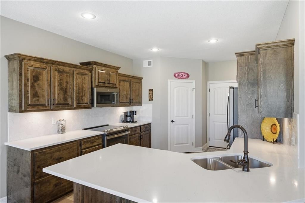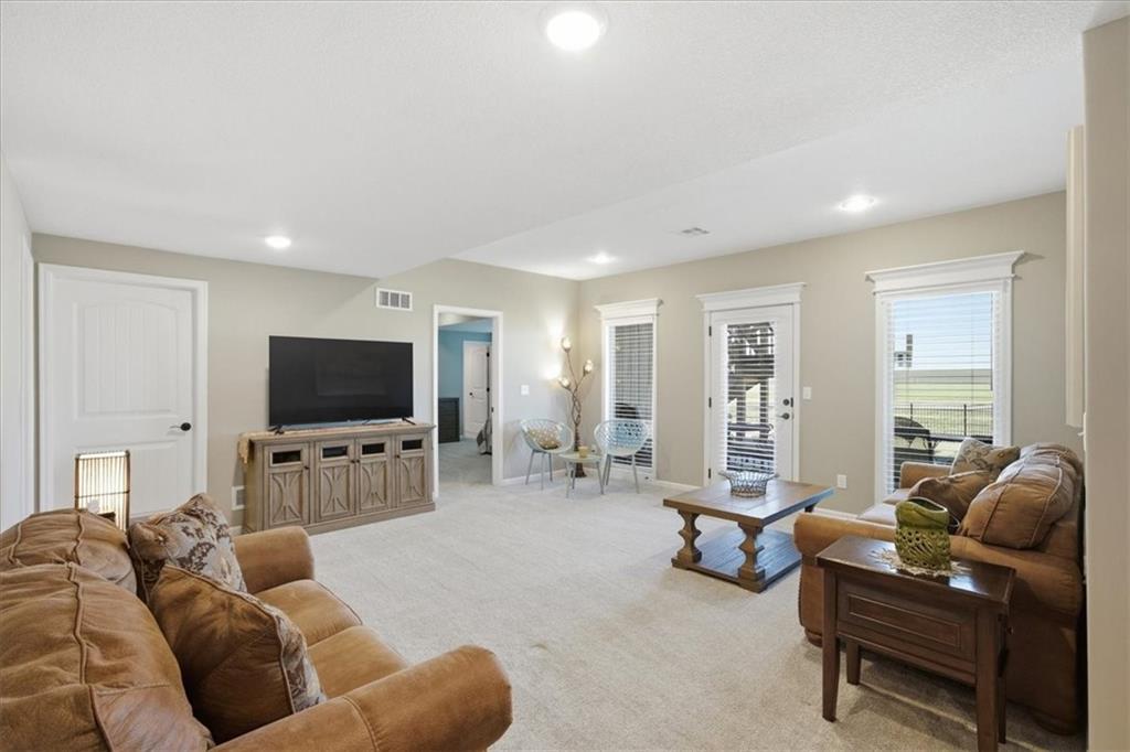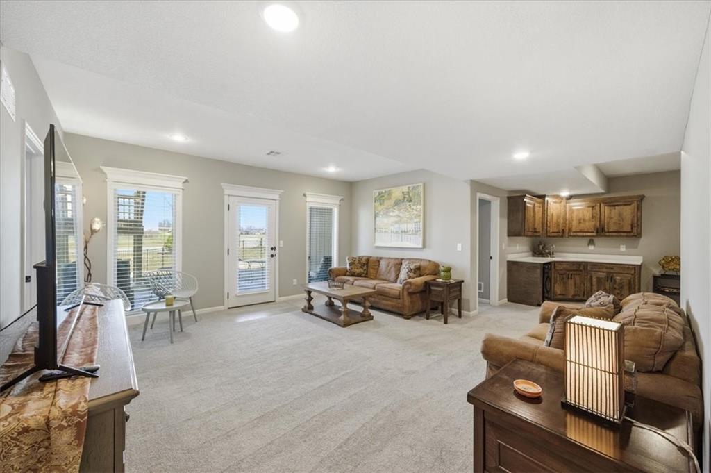 In the highly sought-after Waterford neighborhood, this rare reverse 1.5-story Wilshire II by Hoffmann Custom Homes offers 4 bedrooms, 3 full baths, and a 3-car garage. The open-concept main level features a bright, airy living space, a private primary suite, and a flexible second bedroom with a nearby full bath. The kitchen includes a spacious walk-in pantry, and just beyond, an extended deck steps down to a patio and fenced backyard—perfect for entertaining. The finished lower level features two more bedrooms, a full bath, a large rec room with an entertainment bar, and abundant storage, including a seasonal closet. An in-ground sprinkler system completes the home’s convenience and curb appeal.
