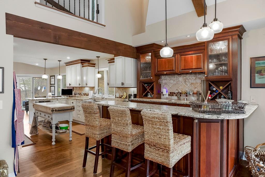 Welcome home! Step into a stunning Great Room highlighted by a dramatic floor-to-ceiling stone wood-burning fireplace and impressive vaulted ceilings. Entertaining is effortless with a full-service wet bar. Just off the living space, the newly added sunroom office offers the perfect spot to work or relax, while the screened porch provides peaceful views of the surrounding woods. The updated kitchen is designed for both everyday living and entertaining, complete w/stainless steel appliances, a 6-burner gas stove, double oven,& a large pantry. The dining room is equally inviting with its own wood-burning fireplace & vaulted ceilings. Beautiful hardwood floors flow throughout the main living areas. The oversized primary suite features a cozy sitting area w/ fireplace. The updated primary bathroom includes a separate shower & soaking tub, private water closet, double vanity, & a spacious walk-in closet. 2nd bedroom w/walk-in closet, full guest bath, laundry room, elevator access complete the main level. Upstairs, a charming loft overlooking the Great Room & dining area provides flexible space for a playroom, media room, or lounge. 3rd oversized bedroom suite includes a built-in bed, Juliette balcony, & full bath. The lower level adds two additional bedrooms, full bath, & mudroom. The oversized garage easily accommodates two SUVs, golf cart,& plenty of extra storage. Outdoor living shines with newly landscaped spaces, including a patio& deck perfect for entertaining, & fenced yard w/firepit. The home also features an elevator from the garage to the main floor for added convenience. Lake Quivira gated community, 24/7 security and exceptional amenities including a private lake, golf course, tennis and pickleball courts, hiking trails, clubhouse, pool, and stables. Dock site #63 is available for all your lake activities. A one-time $40,000 Lake Quivira membership fee applies. Live where you play—luxury, location, and lifestyle all come together in this exceptional home.
