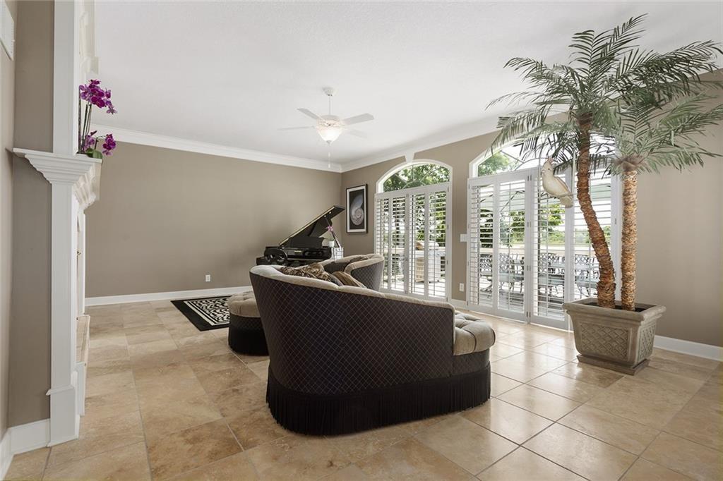 Tucked away on one of the most coveted lakefront lots in the Northland, this one-of-a-kind, custom-built home was thoughtfully designed by an interior designer to take full advantage of its breathtaking views. Nearly every room in this meticulously maintained residence has water views. Step into the grand foyer where soaring columns and faux marble accents set an elegant tone. From there, a second entry welcomes you with a barrel-vaulted, hand-painted ceiling and sweeping lake views that draw you further into the heart of the home. The French country-inspired kitchen is a dream for any entertainer or home chef, featuring a hand-selected marble island, custom cabinetry, a cozy stone fireplace, built-in entertainment center and desk, and an all-glass breakfast room with arched windows overlooking the lush, landscaped yard with multiple water features. The hearth room flows into a spacious living room with a see-through fireplace, a wall of glass framed with plantation shutters. The primary suite is a peaceful retreat with patio access, high ceilings, custom built-ins, upgraded carpet, and plantation shutters. The ensuite bath offers a spa-like experience with a dome ceiling over the soaking tub, walk-in shower, and dual vanities. A second bedroom also has direct patio access and features elegant travertine floors. Recently added second living quarters include a full gourmet kitchen, living area with built-ins, breakfast nook, second master suite with luxurious bath, large walk-in closet, and even a second laundry room—perfect for guests, in-laws, an adult child, or anyone looking for privacy and independence. The space also features its own private entrance. Additional highlights include a spacious three-car garage with high-end epoxy floors, a private dock with a pontoon boat included, full irrigation system, expansive patio and deck spanning the length of the home, and professional landscaping throughout. This is more than just a home—it's a lifestyle.