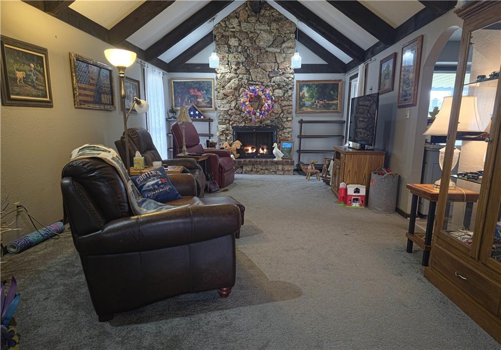 Experience the perfect blend of rustic charm and modern efficiency in this 2,047 sq. ft. home. Situated on a sprawling 32,234 sq. ft. lot, this property offers rare privacy and space. The heart of the home is the expansive living room, featuring soaring vaulted beam ceilings and a majestic custom stone fireplace mirrored by a matching stone feature piece. The "country-sized" kitchen is a chef’s delight, boasting a portable island, walk-in pantry, and premium appliances—including a silent 3-rack Whirlpool dishwasher and breakfast nook with tree-shaded views. The Master Suite is a true retreat with a coffered ceiling, crystal chandelier, and private 3/4 bath with dual shower heads. Two additional oversized bedrooms share a luxury hall bath equipped with a 72" Kohler deep soaking tub. Below, the full walk-out basement offers a massive footprint for future equity, already framed for a non-conforming 4th bedroom and plumbed for a bar and additional bathroom. Mechanical & Exterior Highlights: HVAC: 95% efficient 2-stage system (5 years old) with sanitized ductwork. Windows: Renewal by Anderson (front) and newer double-pane vinyl (rear). Efficiency: Hybrid high-output water heater and LED lighting throughout. Protection: Leaf Filter gutter system with lifetime warranty and a roof inspected in "Good" condition. Extras: Formal dining room, large laundry/mudroom, 2-car garage, and two backyard sheds. Move in with total peace of mind knowing the "heavy lifting"—from the high-efficiency mechanicals to the plumbing stops—has already been handled. This private oasis is designed for those who love to gather, offering space, comfort, and timeless style.
