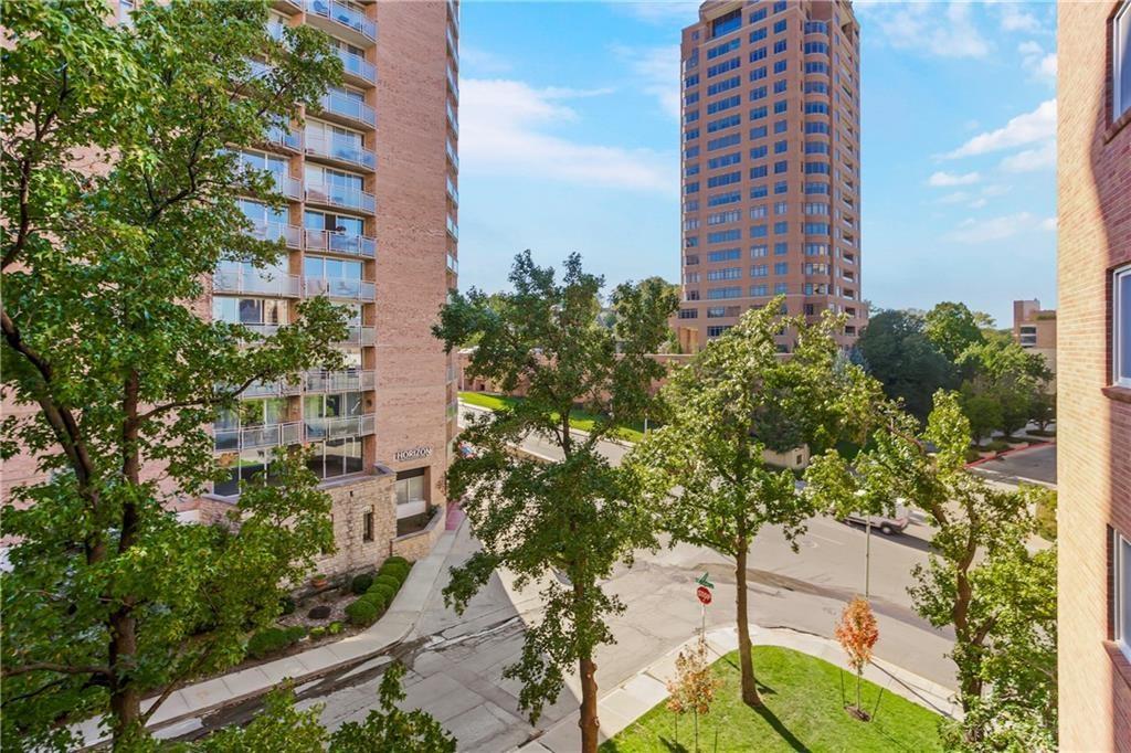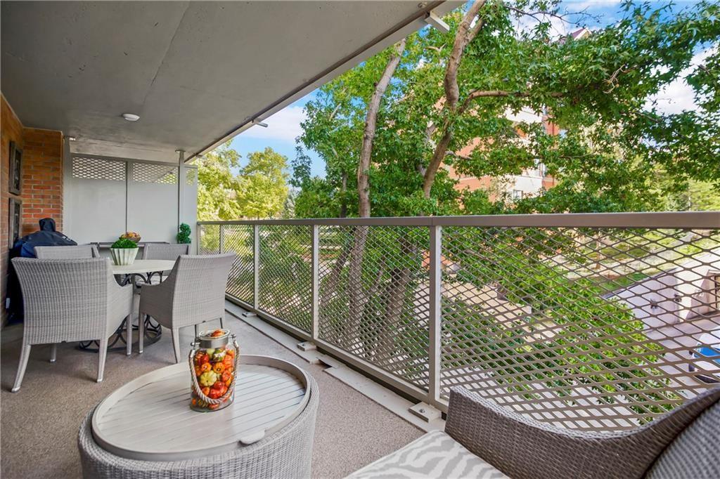 Absolutely stunning South facing unit offers open fl plan with beautiful cherry floors. well-designed open kitchen with quartz countertops, center island and stainless appliances, under cabinet lighting and electric outlets for sleek backsplash, Walk in pantry, cabinet roll outs, soft close drawers, windows & sliding door leads to large treed balcony with Hunter Douglas blinds to allow light and privacy. beautiful built in's living rm, french doors from liv to bedroom/dining room w/enormous wall of closets, walk-in closet in primary bedroom, large walk-in shower in primary bath,. Laundry room, party room and exercise room in common areas. leisurely walk to Plaza, Loose Park, entertainment, restaurants and more. **BEST PRICE PER SQUARE FOOT ON THE PLAZA. HOA TOTAL OF $1928 INCLUDES ALL PROPERTY TAXES, WATER, HEAT AND A/C!!! AS WELL AS THE IN DOOR HEATED $100 PARKING FEE **