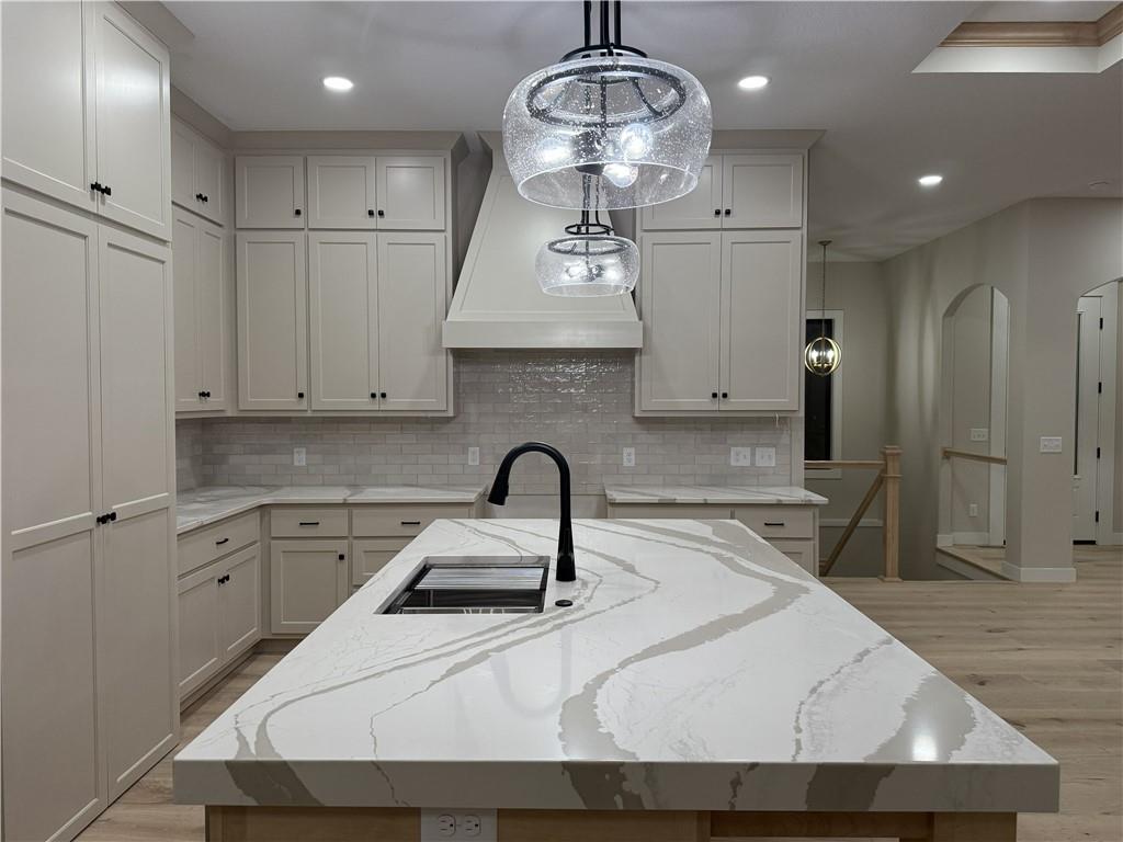 Elegant arches, crown coffered ceiling, built-ins, wine/coffee bar, Cambria kitchen counters, these are a few of the highlights on this New Construction Ranch in Andrew County. Finishing touches are happening now for this home to be ready for you this Spring.