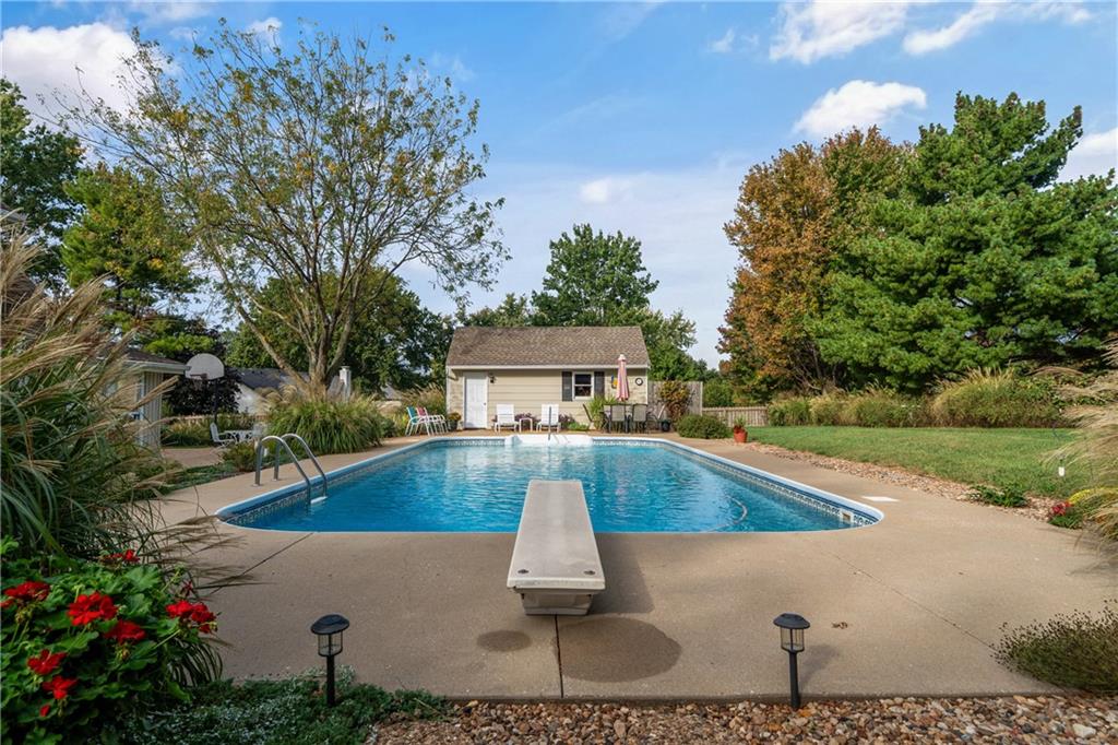 Tucked away in the desirable Harmony South neighborhood, this classic Colonial-style home offers a rare blend of space, comfort, and a peaceful one-acre setting. The main floor features a traditional layout with a formal dining room and a dedicated home office with built-ins just off the entry. The living room is warm and inviting with a bay window, brick fireplace, and custom built-ins, creating a perfect place to gather. The kitchen is designed with functionality in mind, offering abundant cabinetry, generous counter space, and granite countertops for everyday living and entertaining. Upstairs, the primary suite provides a private retreat with tray ceilings, a separate sitting area, and an ensuite bath complete with double vanities, vaulted ceilings, a soaking tub, separate shower, and skylight. Additional bedrooms are comfortably sized and offer flexibility for family or guests. The finished basement expands the living space and can easily serve as a recreation room, workout area, hobby space, or media room. A standout feature of the home is the bright all-weather porch, surrounded by windows and filled with natural light, making it the perfect spot to relax, watch the seasons change, or enjoy game days. The backyard is truly special, featuring an oversized saltwater pool, mature landscaping, fruit trees, and grapevines that produce annually. A patio extends the outdoor living space, and a convenient shed near the pool provides storage for equipment and supplies. Set in a quiet, established community known for its friendly atmosphere, this home also offers exceptional access to everything South Overland Park has to offer, including parks, shopping, healthcare, highways, and the Arboretum, along with highly regarded schools nearby. This property combines everyday comfort with a private, retreat-like setting in a location that makes daily life easy and enjoyable.