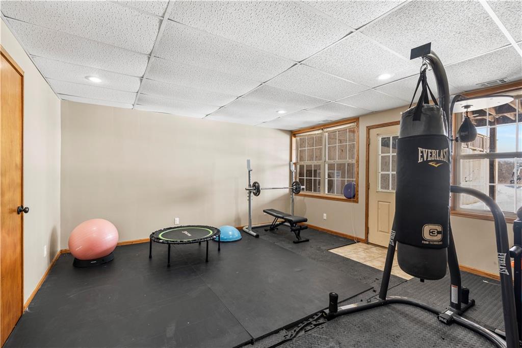 Pasture, ponds, timber, and a 4,000+ square foot home on 33 acres m/l to be determined by survey. This property offers a mix of open ground and mature timber along with two ponds, creating a private rural setting with room for livestock, recreation, or simply enjoying the outdoors while still a short drive from town. The ranch-style home features a full walk-out basement and more than 4,000 square feet of living space. Cedar siding, stone accents, and a metal roof provide lasting curb appeal. A wraparound covered front porch, finished screened-in porch, and covered rear porch overlook the surrounding acreage and ponds. Inside, the home welcomes you with a dedicated entry foyer and an open living concept with a vaulted wood-plank ceiling and large windows providing excellent natural light. Hardwood floors run throughout the main level along with wood trim and interior wood doors.The kitchen flows into the living and dining areas and includes granite countertops, ample cabinetry, and a stainless steel appliance package. The main level offers 4 bedrooms and 2.5 bathrooms, including a primary suite with a garden tub, walk-in shower, and walk-in closet. A laundry and mudroom provides convenient access from the attached garage into the kitchen. Storage and closet space is abundant throughout. The fully finished walk-out basement includes two additional bedrooms, a full bathroom, and a large recreation and living area with stained concrete floors. Mechanical and storage rooms are also located on this level with direct access to the backyard. A circle drive provides ample parking for trailers or recreational vehicles. Rear access to the attached two-car garage maintains a clean front elevation. RV utility hookups are located just south of the home, and an outbuilding sits behind the house. Property is also available with less acreage. See MLS #2599037 for an alternate listing including the home with approximately 10 acres m/l to be determined by survey.