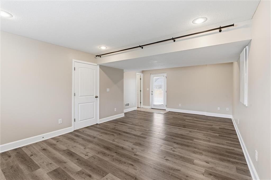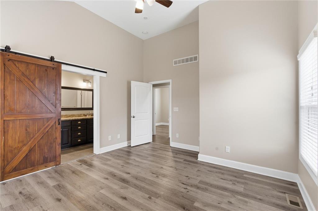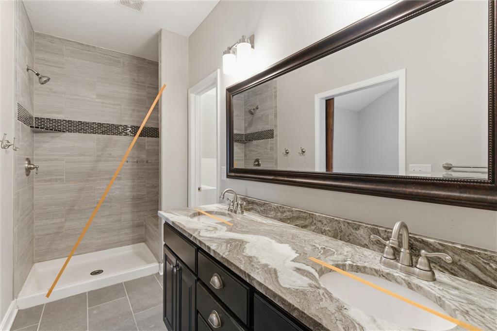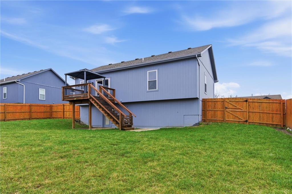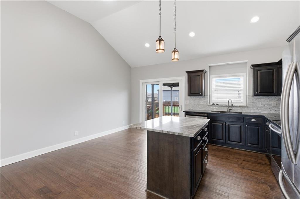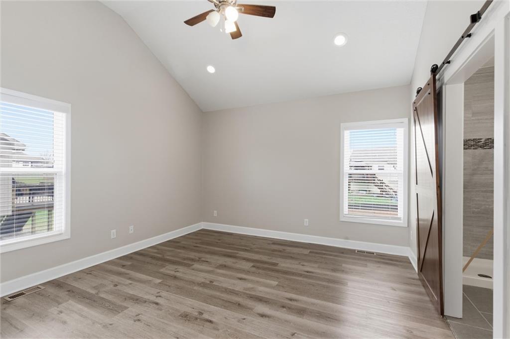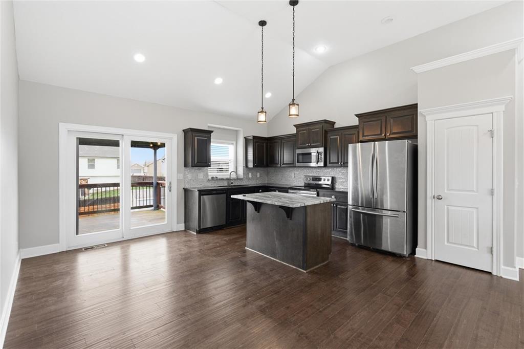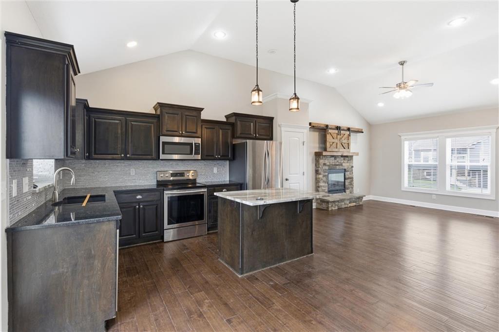 Beautifully maintained split-entry home offering 3 bedrooms and 3 full baths with a layout that feels both open and inviting. Vaulted ceilings and engineered hardwood floors create a bright, airy main living space anchored by a stunning stone fireplace with custom barn door accents. The kitchen is designed to gather around — featuring a large island, stainless steel appliances, generous counter space, and seamless access to the covered deck overlooking the fully fenced backyard. A storage shed adds extra functionality without sacrificing yard space. The spacious primary suite offers a true retreat with a walk-in closet, double vanity, and fully tiled walk-in shower. All bedrooms provide generous closet space, ensuring ample storage throughout the home. The finished walk-out lower level expands your living space with a full bath and flexible area ideal for entertaining, a home office, gym, or non-conforming fourth bedroom. The 2-car attached garage adds additional storage and everyday convenience.