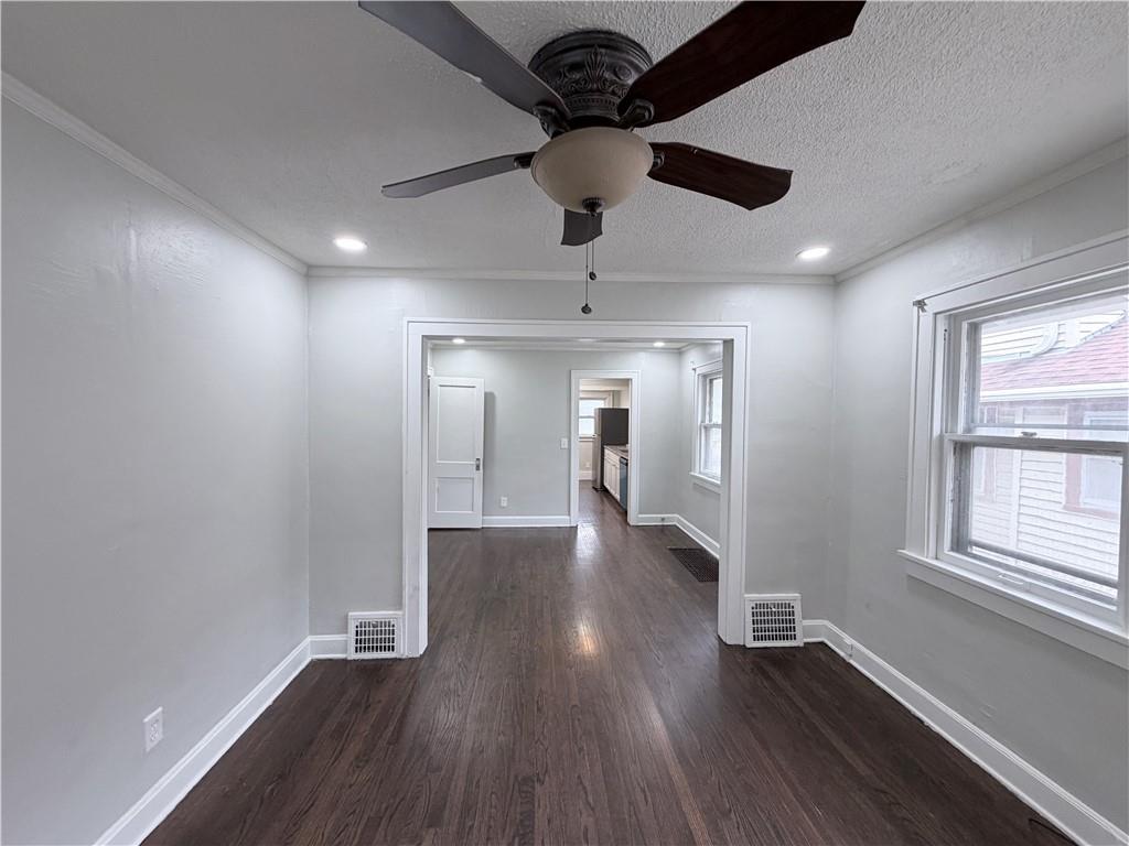 Empty room with dark wood-style floors, a ceiling fan, ornamental molding, a textured ceiling, and recessed lighting