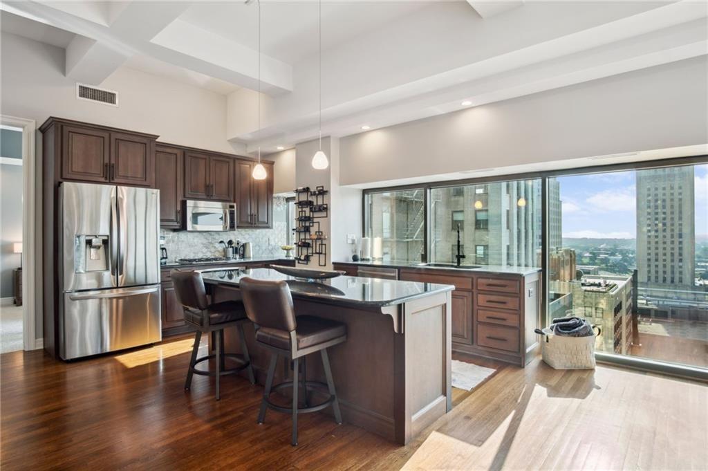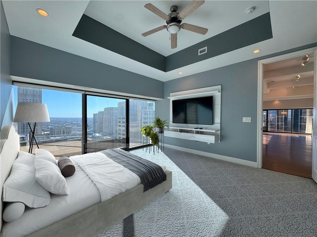 The most sought out Views in the building, 09 units rarely come on the market facing Southeast. Windows galore with natural light flowing in. All bath rooms have been renovated with new counter tops, floors and tile in the showers. New tiled fireplace and backsplash in kitchen. Harwood floors throughout living area and new carpet in both bedrooms and new paint throughout the unit. Enjoy the breathtaking city Views. Fantastic closet space, Large TV with custom tile stays in bedroom, open floor plan and convenient to everything! This building offers a rooftop pool, fitness center, theater, grilling area, 24 hour doorman and concierge, 2 garage parking spaces.