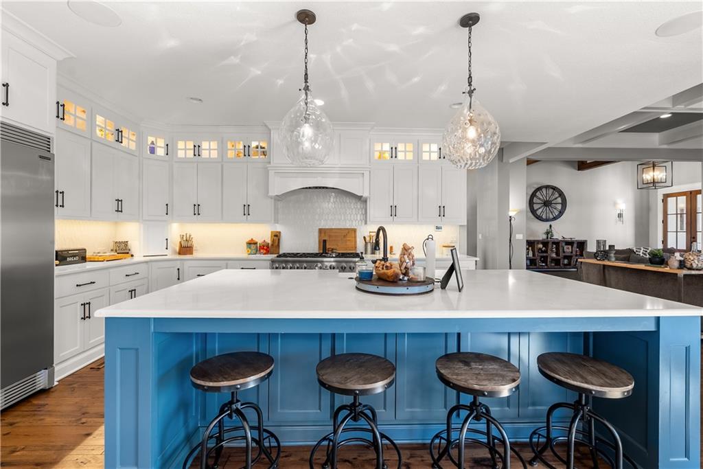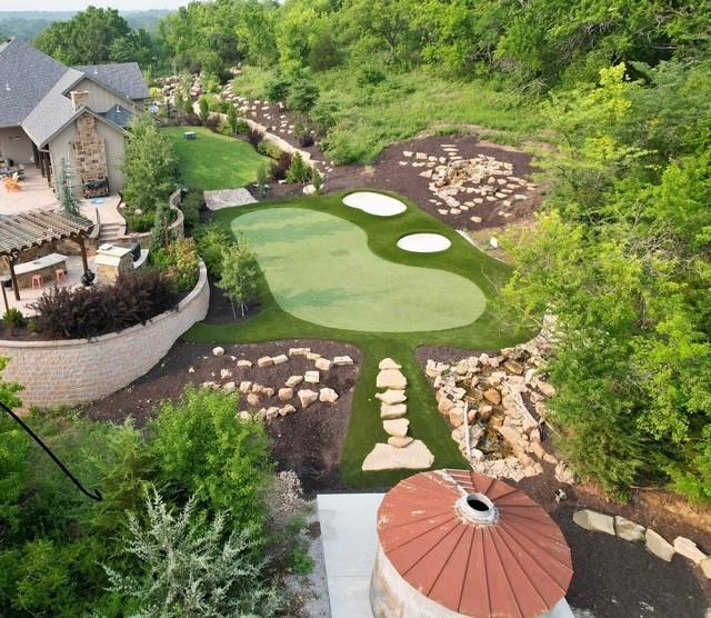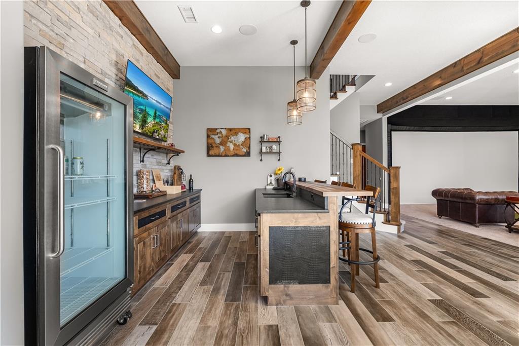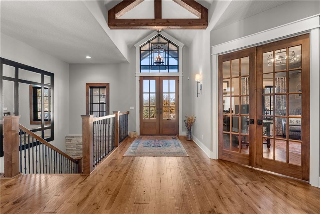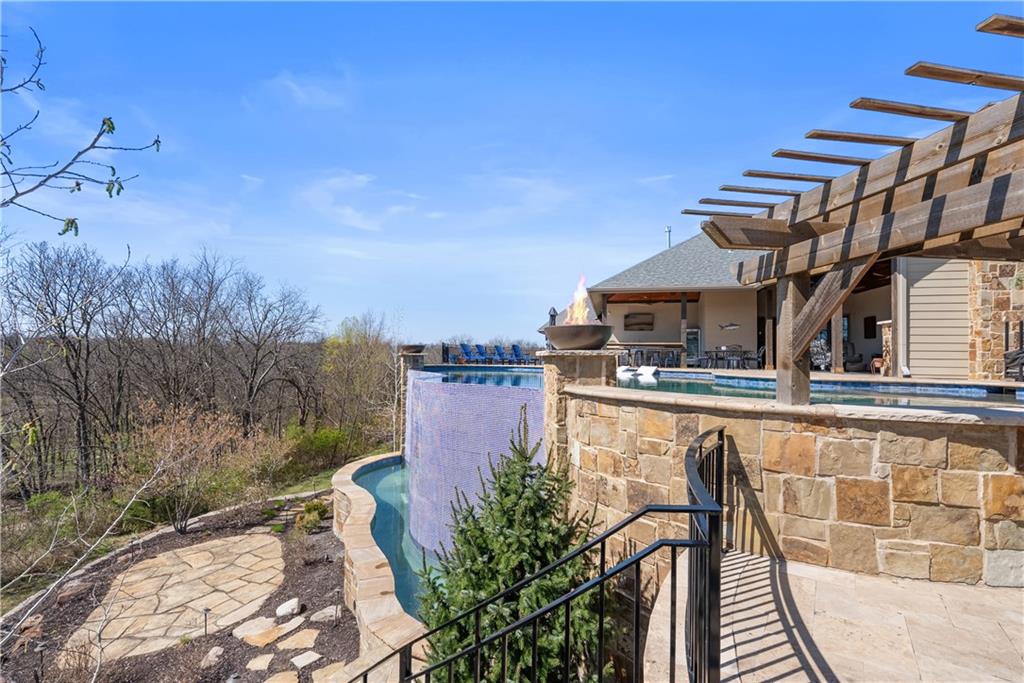 Dreams truly come alive in this one-of-a-kind custom Reverse 1.5 Story estate nestled on 9+ breathtaking acres in unincorporated Jackson County within the Lee’s Summit School District. This private retreat offers unmatched craftsmanship, panoramic treetop views & resort-level amenities that cannot be replicated. A grand front porch w/stone accents & custom doors welcomes you into a stunning interior featuring soaring 12-foot ceilings on both levels & architectural detail throughout. The main level showcases a dramatic living area w/west-facing views and a chef’s kitchen designed for everyday luxury and entertaining—complete with oversized island, custom shelving, walk-in pantry, double refrigerator/freezer combo, & oversized gas range. Light filled dining space, coffee bar-perfect for morning routines. The primary suite is a private sanctuary w/direct access to the covered patio for seamless indoor/outdoor living. The spa inspired bath features dual vanities,deep soaker tub, walk-in shower, & a generous walk-in closet w/custom built-ins. A main-level den (or 2nd bdrm) & convenient laundry complete the layout. The finished lower level is an entertainer’s dream featuring an oversized golf simulator & projector ,full wet bar, media/rec space, pool table area, exercise room w/sauna, & 2 additional bedroom suites each w/private baths & walk-in closets. A suspended garage provides rare lower-level 4th garage access—ideal for workshop, car collection, or storage. And then…This resort-caliber setting rivals luxury destinations. The vaulted covered patio w/stone FP creates year-round ambiance. Step outside to a spectacular infinity-edge pool with swim-up bar, tanning ledge, outdoor kitchen, & unobstructed treetop views offering 100% privacy. Entertain in your custom silo bar, practice on the putting green, unwind beside three cascading rock waterfalls surrounded by professional landscaping & custom exterior lighting. A signature property offering an unmatched lifestyle.
