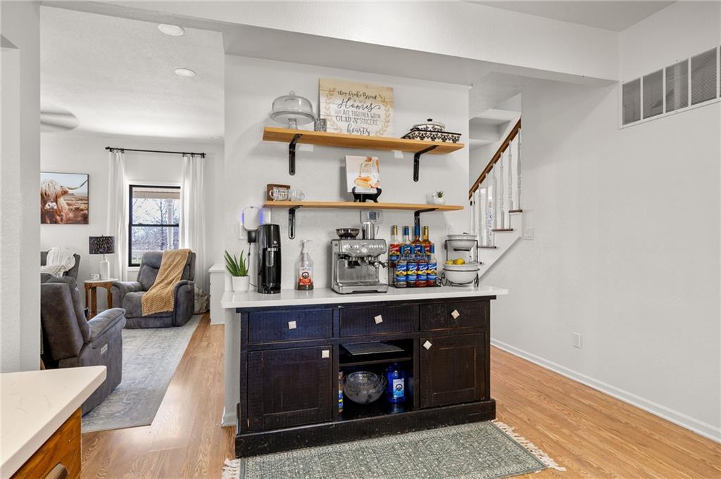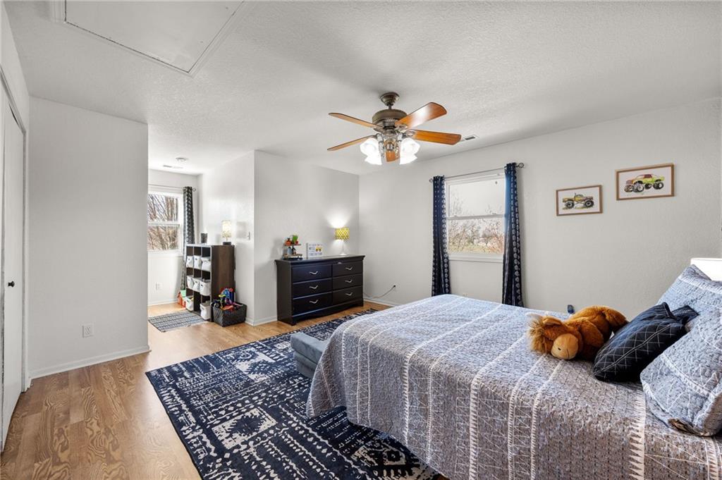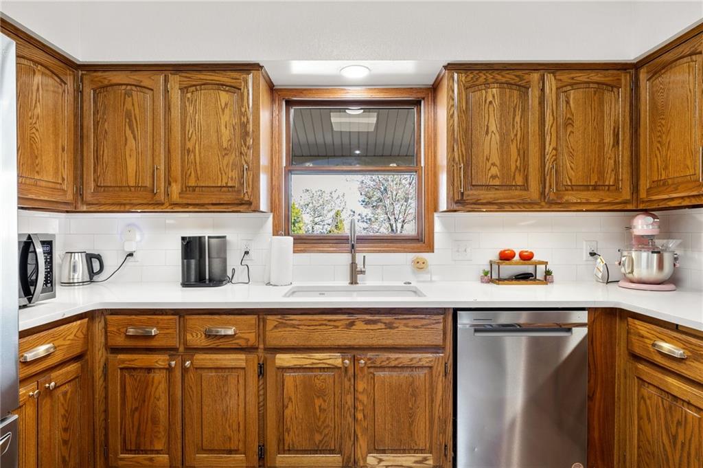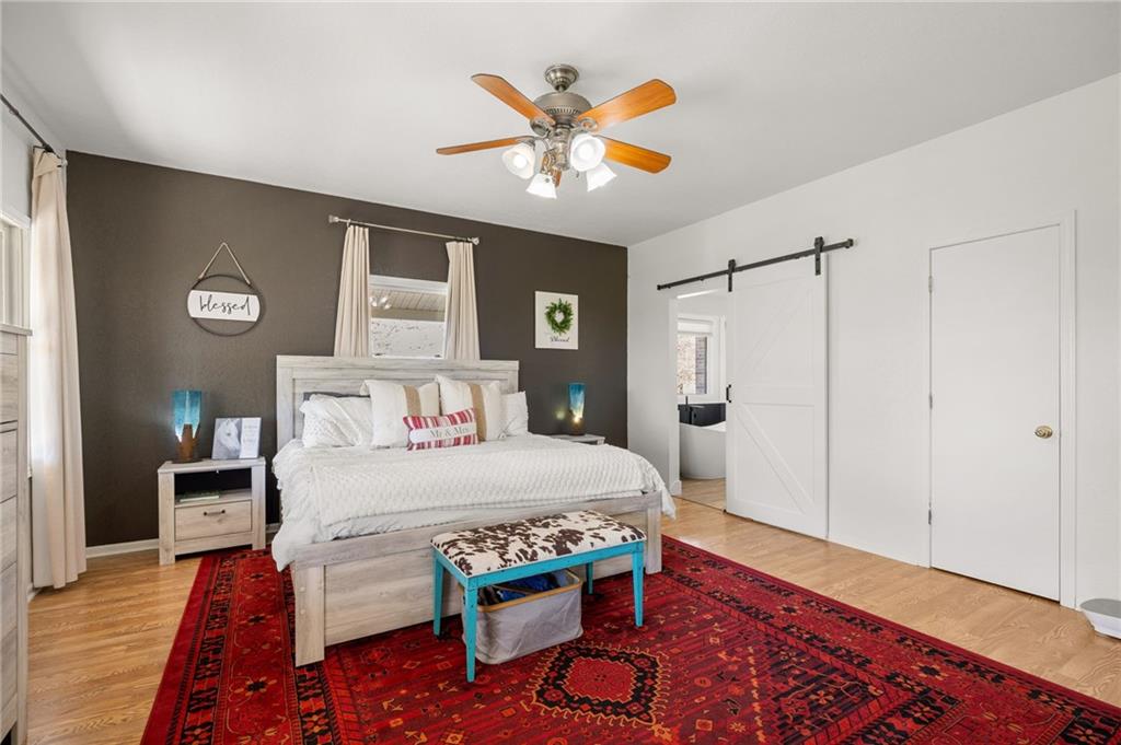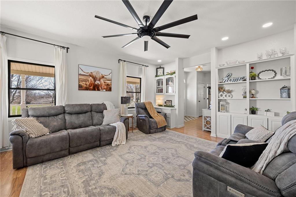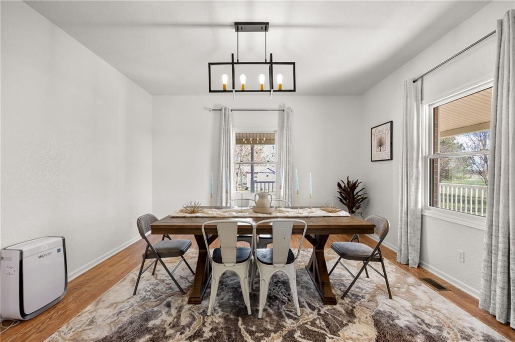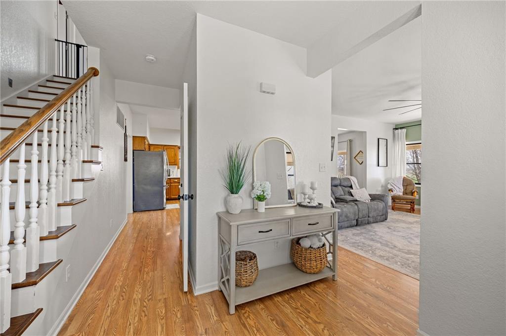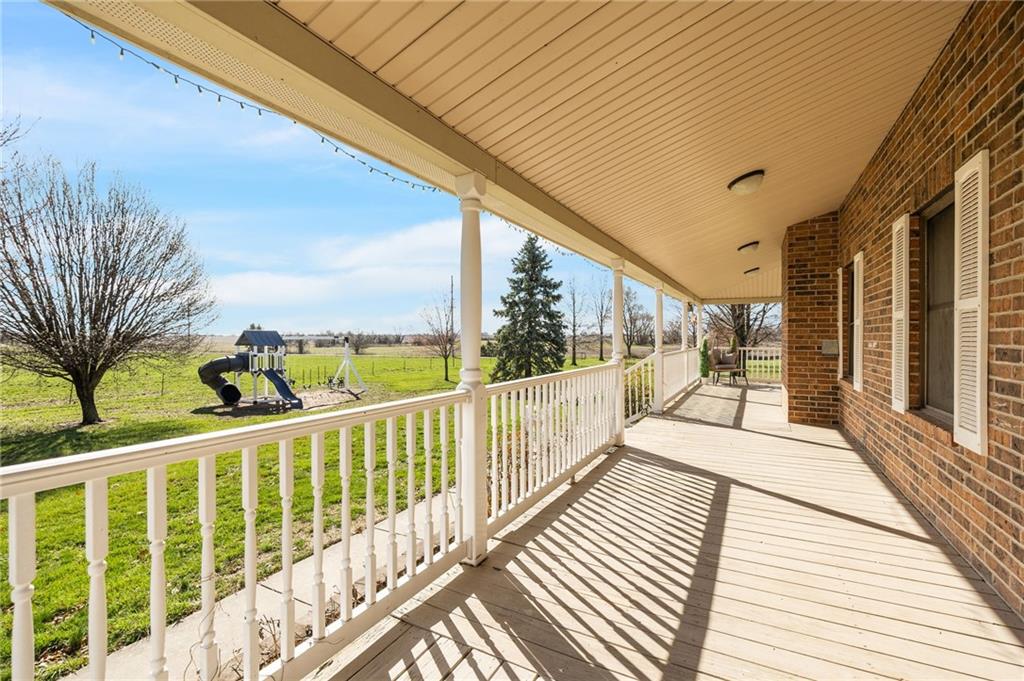 Beautiful traditional farmhouse on 3.75 acres offering 4 bedrooms, 2 bathrooms, and 2,557 square feet of inviting living space. This mostly brick home features wood siding on the second level, a durable metal roof, and a large covered wraparound porch perfect for enjoying the peaceful setting and beautiful yard. Inside, you will find 9-foot ceilings throughout the main level, a striking wood staircase, a spacious living room with a wood-burning fireplace, a large laundry room, and a main-level primary bedroom and bathroom for added convenience. The kitchen is beautifully updated with custom cabinetry and quartz countertops, and the attached 2-car garage plus two separate driveways provide plenty of space for parking and everyday function. Outside, the property includes a fruit orchard with a variety of fruit trees, adding even more charm to this picturesque country property.