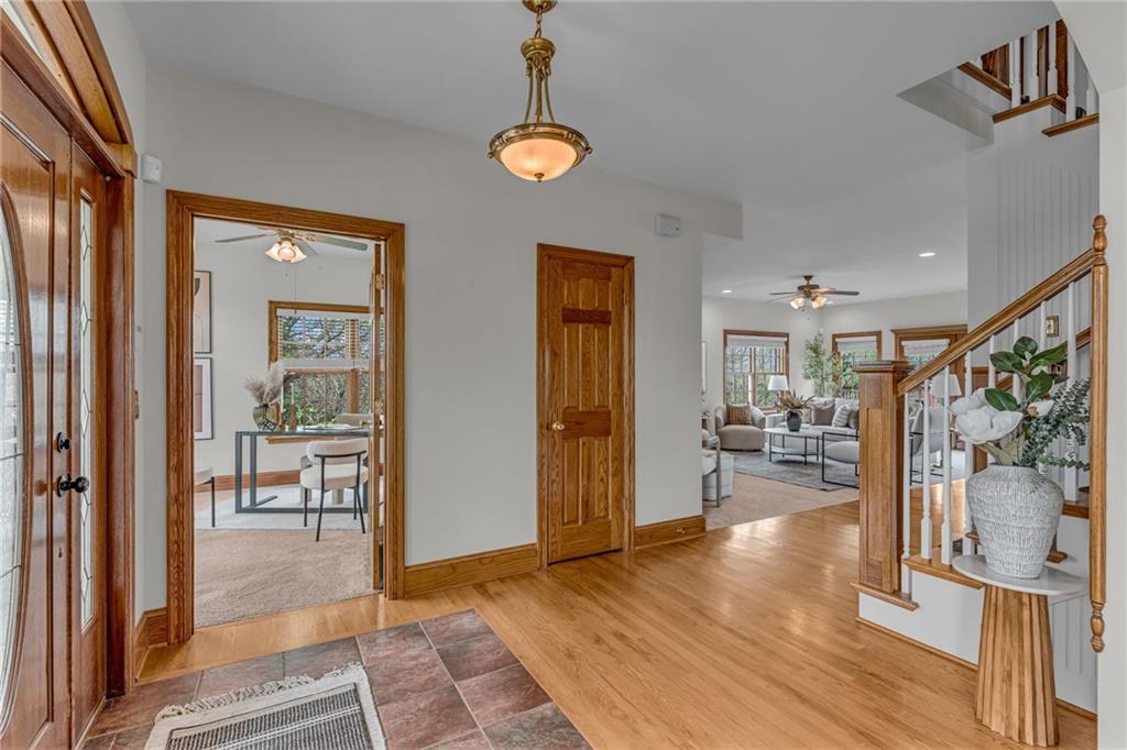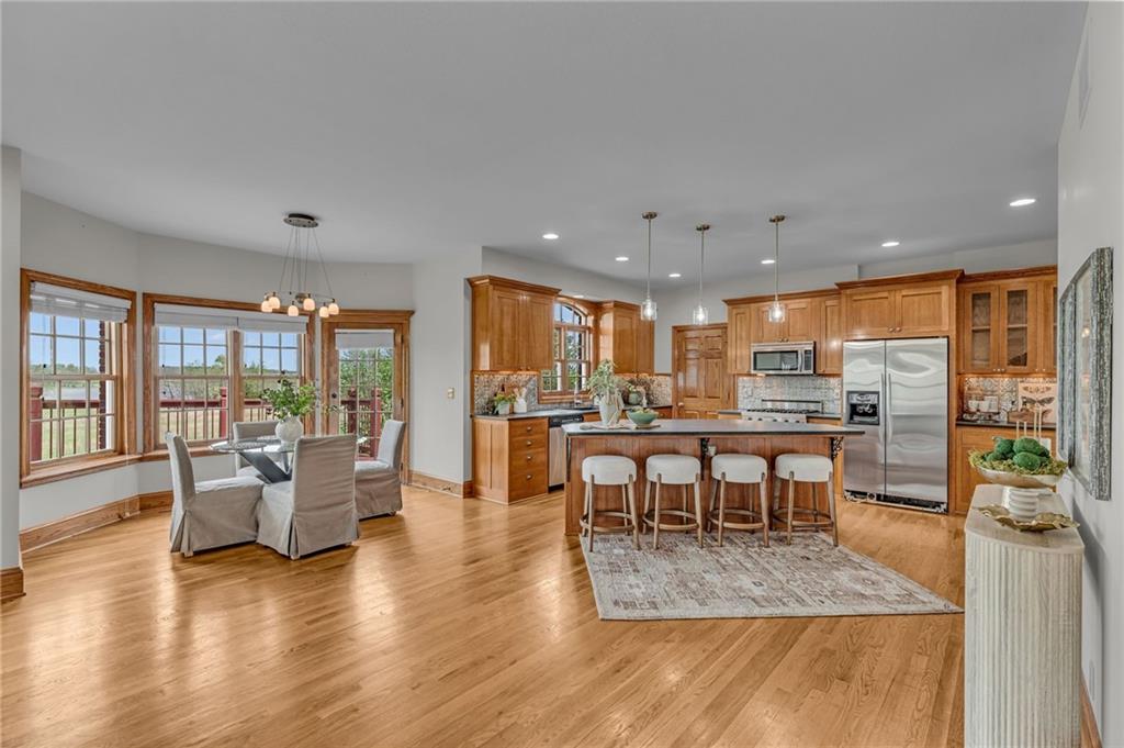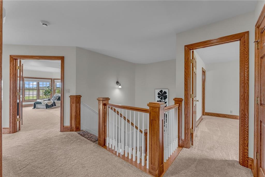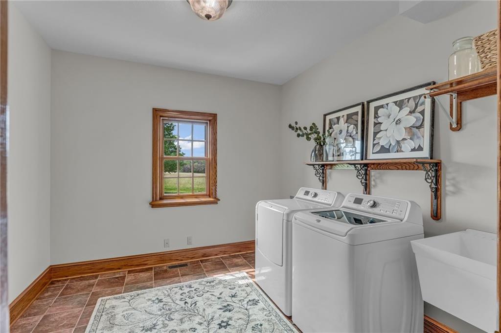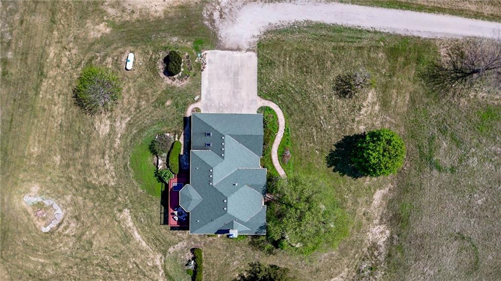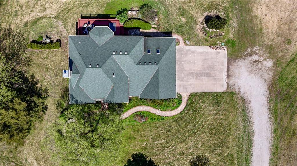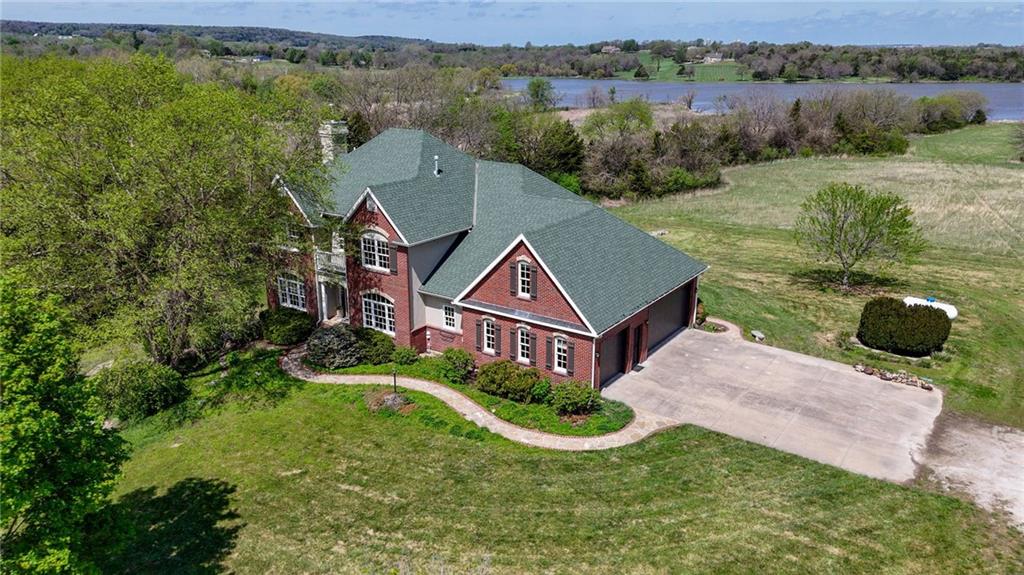 Don't miss this incredibly rare opportunity to own a beautiful estate on a 40-acre lake. Set on 45 acres near Baldwin City, this exceptional lakefront home offers seclusion and serene nature that's rich with wildlife. The property features direct shoreline access, ideal for fishing and water recreation. A spacious deck extends the living area outdoors and captures stunning views of the surrounding countryside. Inside, more than 3,500 square feet includes 4 bedrooms and 5 bath areas. The kitchen features soapstone countertops, a gas range, extensive cabinetry, and an oversized island with well-planned storage. A casual dining area sits just off the kitchen, while a formal dining room with crown molding provides a more defined space for gatherings. The living room is centered around a gorgeous fireplace with an oak mantel and insert, creating a warm focal point while entertaining guests. The primary suite offers a spacious retreat, complete with a jetted tub, walk-in shower, and a large walk-in closet. The walkout lower level is unfinished and ready for future expansion. It includes a nearly 800 sq ft concrete storm room beneath the garage, complete with built-in shelving. Additional features include newer roof, zoned HVAC, multiple water heaters, a water softener, and a humidifier. Thoughtful landscaping enhances the home’s natural surroundings. Access is convenient, with primarily paved roads and only a short gravel approach, an uncommon advantage for a property of this size. This is a rare opportunity to experience private lakefront living that is hard to come by.