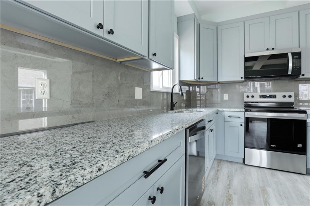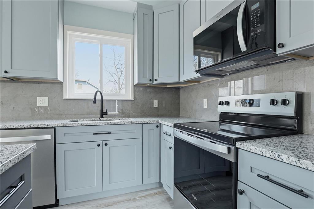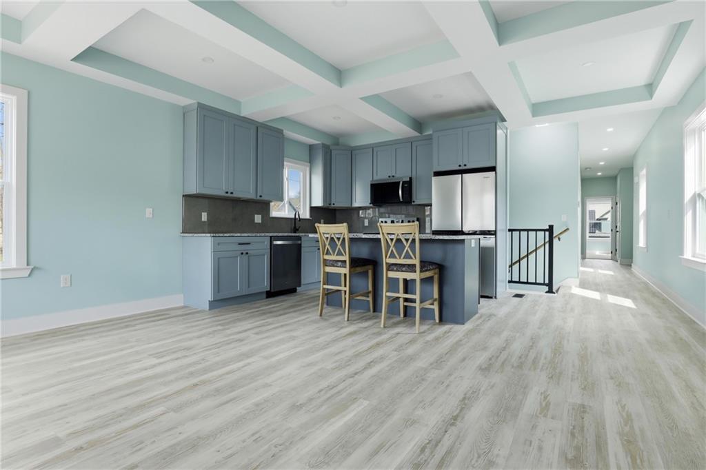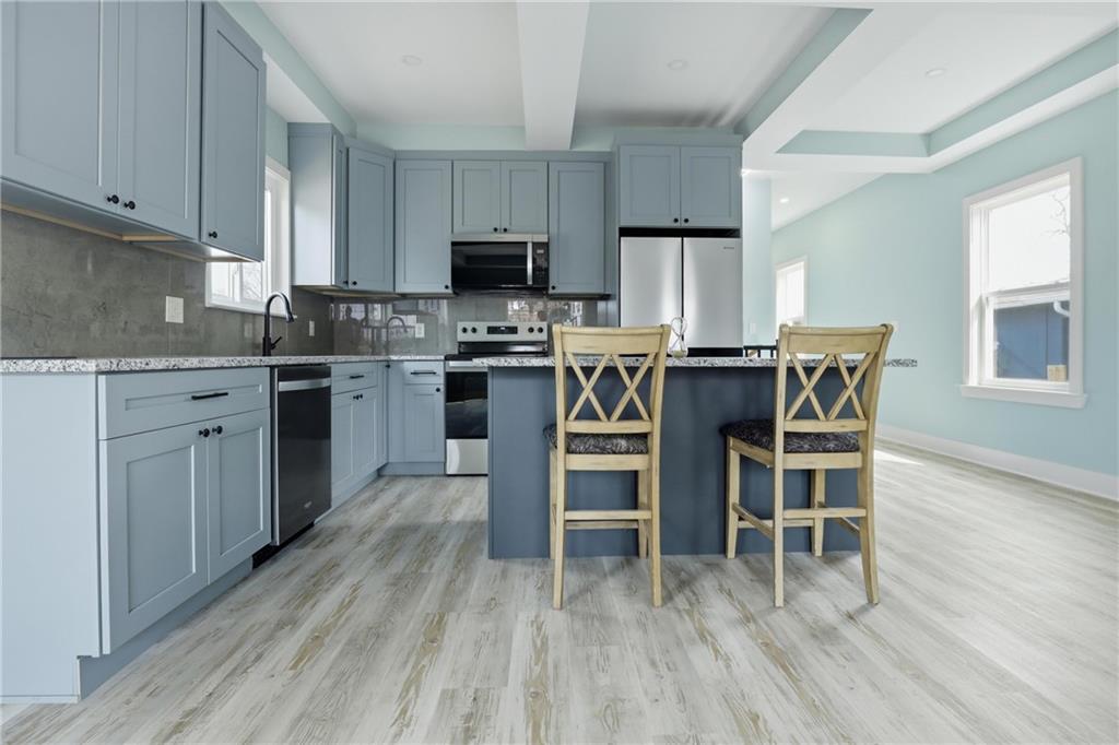 Welcome to 1240 Riverview Ave a fully reimagined 4-bedroom, 3-bathroom home offering 3,536 sq ft of beautifully renovated living space in Kansas City, KS, listed at $285,000. This home has been completely rebuilt from the ground up with quality finishes throughout. The striking exterior features a modern gable design with warm wood accents, a welcoming covered front porch with stylish black railings, and a 2-car attached garage. Step inside to an open-concept main level with premium flooring, coffered ceilings, and abundant natural light flowing through generous windows. The chef's kitchen boasts custom cabinetry, elegant countertops, a stunning tile backsplash, stainless steel appliances, a center island with bar seating, and quality fixtures. Spa-like bathrooms feature beautiful floor-to-ceiling tile work, soaking tub and shower combinations, custom vanities, and refined finishes. A stunning hardwood staircase connects to the upper level bedrooms. Every detail has been thoughtfully executed this is truly move-in ready.